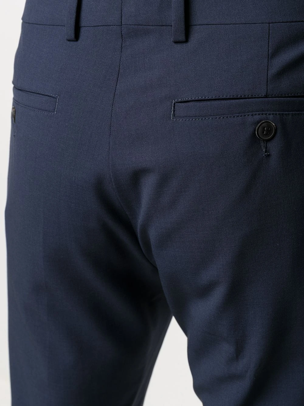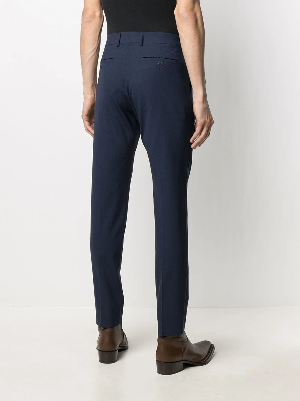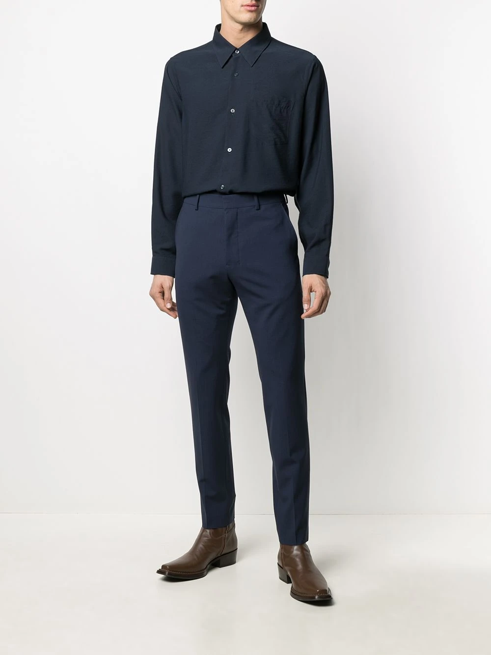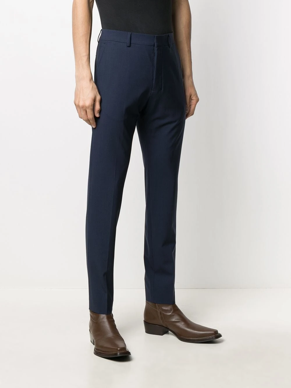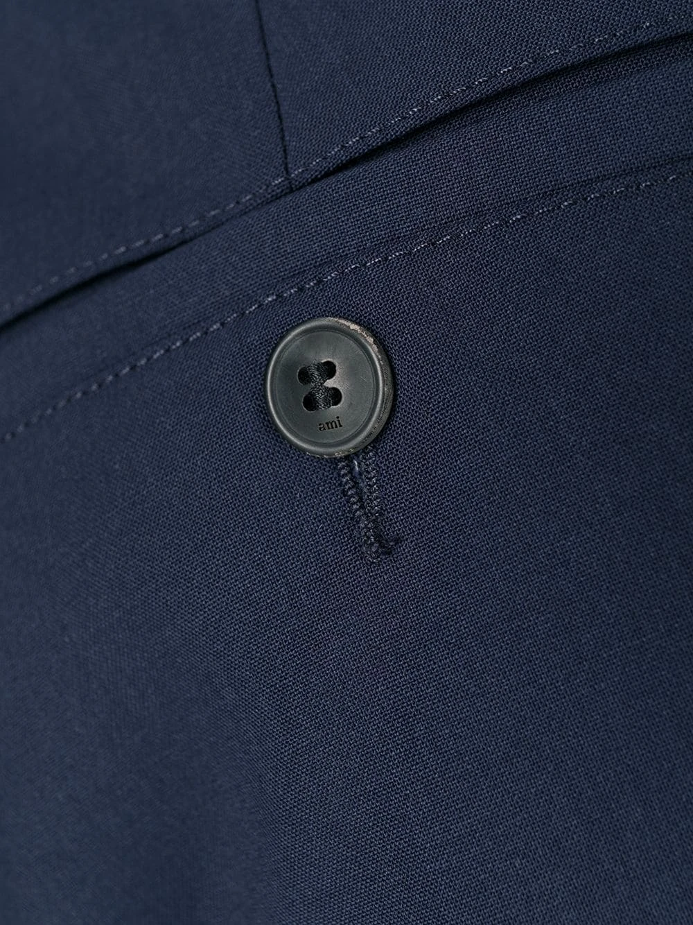 Pantalon de costume slim en laine AMI Paris avec agrafe et zip, passants de ceinture, poches latérales fendues, deux poches passepoilées boutonnées au dos et coupe slim.