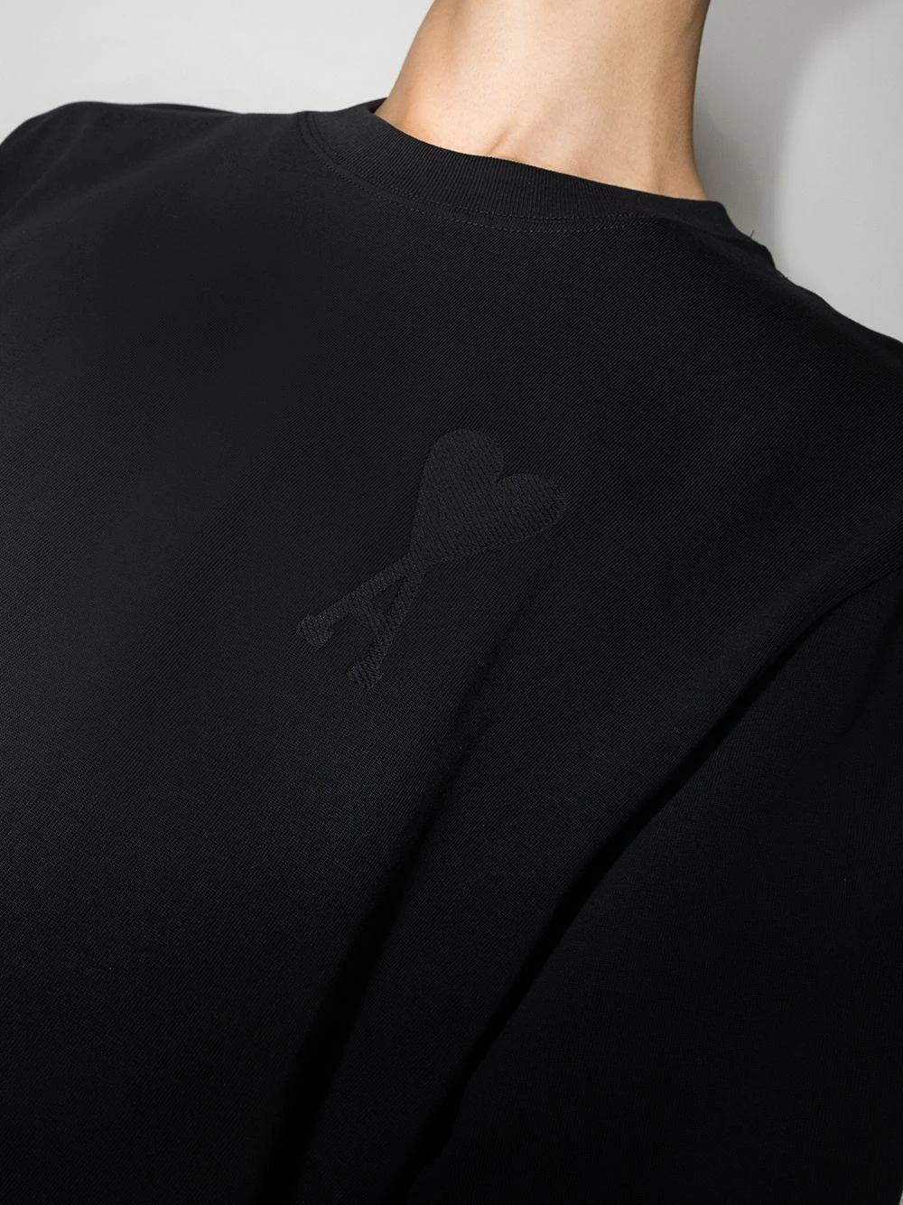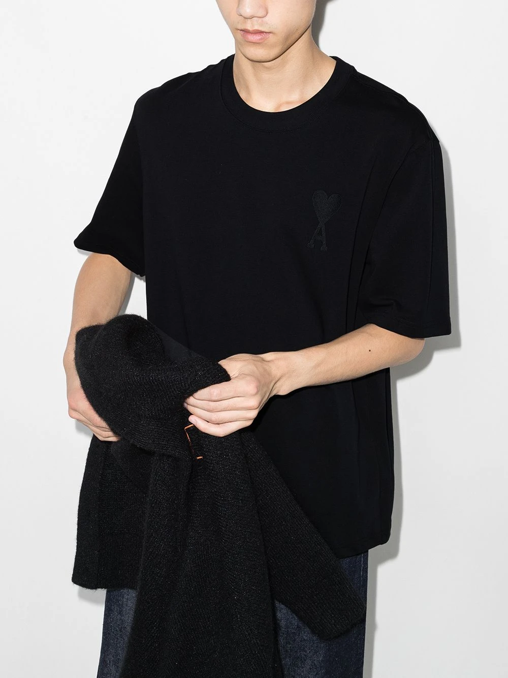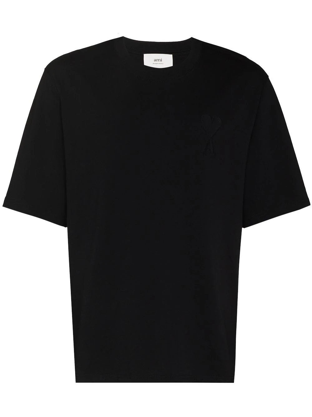 Black organic cotton Ami de Coeur T-shirt from AMI Paris featuring signature Ami de Coeur monogram motif, crew neck and short sleeves. When buying this unisex item, keep in mind that it is graded in standard men’s sizing.. POSITIVELY CONSCIOUS: This Conscious product contains organic cotton where the cultivation and manufacturing process restricts the use of chemicals, eliminates pesticides or artificial fertilisers and incorporates methods that respect biodiversity, improve soil quality, and reduce water consumption..