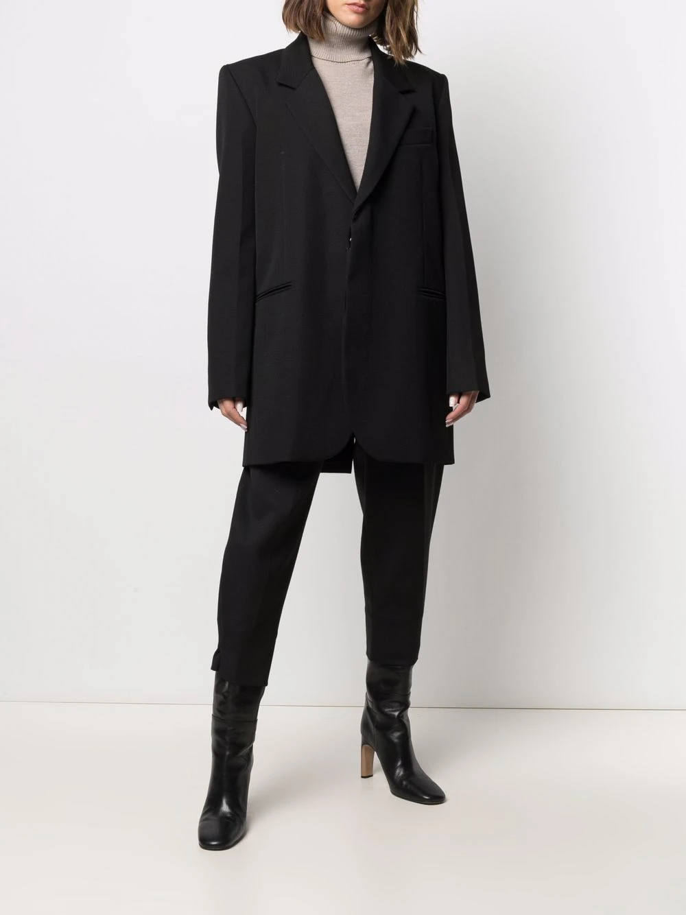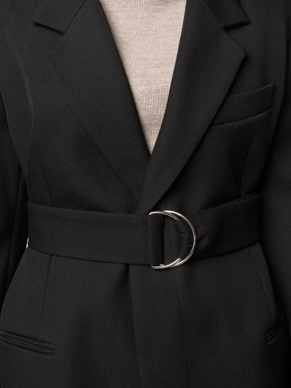 Revers crantés, épaulettes, fermeture à boucle D, poche passepoilée sur la poitrine, manches longues, poignets boutonnés, deux poches passepoilées latérales, fente arrière. Couleur : noir. Matière : laine vierge.