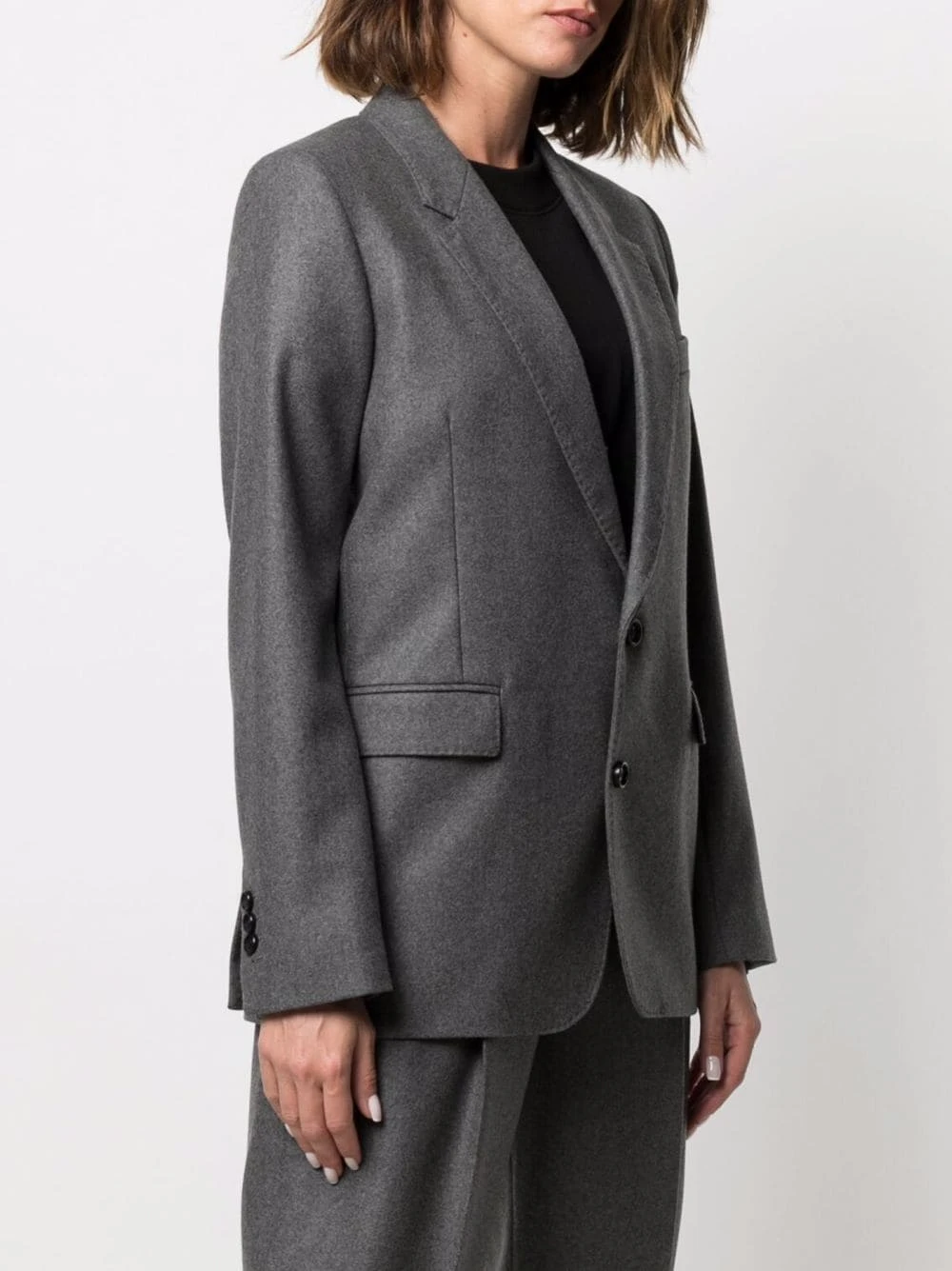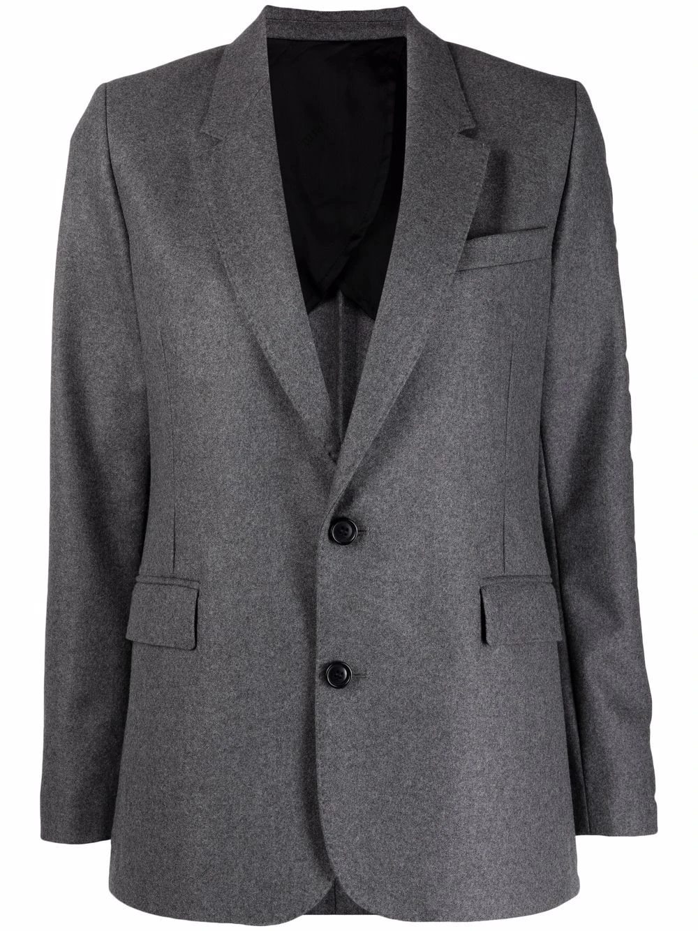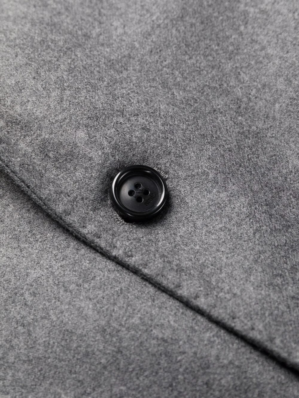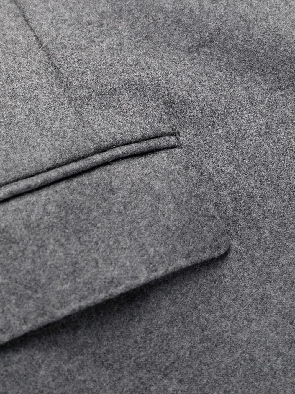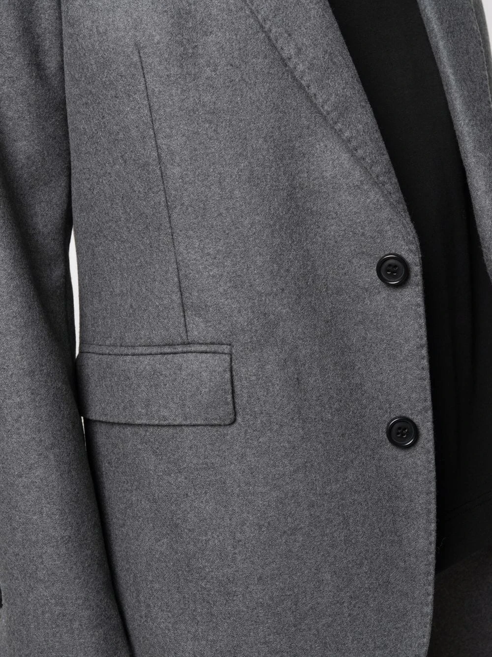 Coupe classique, col cranté, poche passepoilée sur la poitrine, deux poches à rabat sur le devant, manches longues, poignets boutonnés, double fente arrière. Couleur : gris.