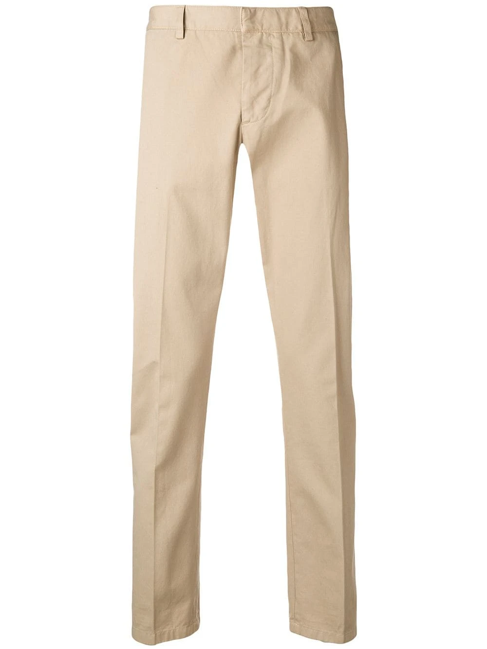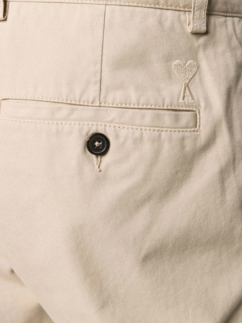 Pantalon chino en coton AMI Alexandre Mattiussi avec passants de ceinture, fermeture devant dissimulée, poches latérales et deux poches arrière passepoilées et boutonnées. Couleur: beige.