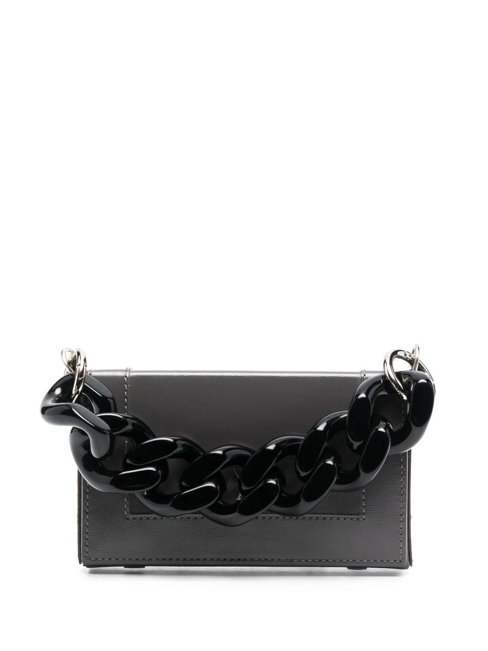 Logo Ami de Coeur signature, anse à maillons de chaîne, bride porté épaule détachable, rabat sur le dessus à fermeture magnétique, compartiment principal, logo imprimé à l’intérieur, ornements argentés. Couleur : gris. Matière : cuir.