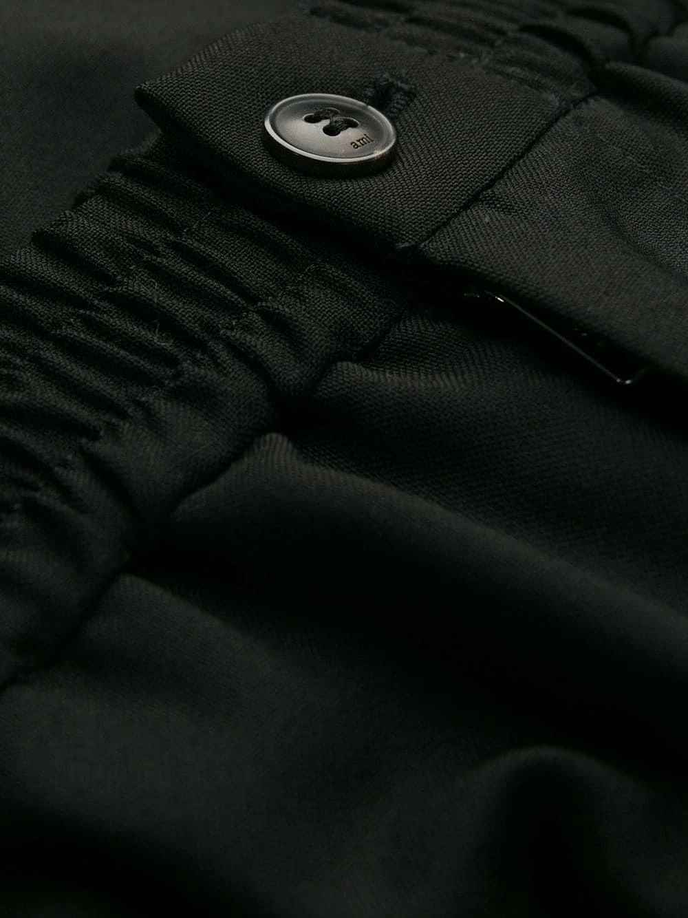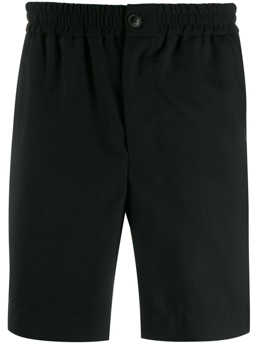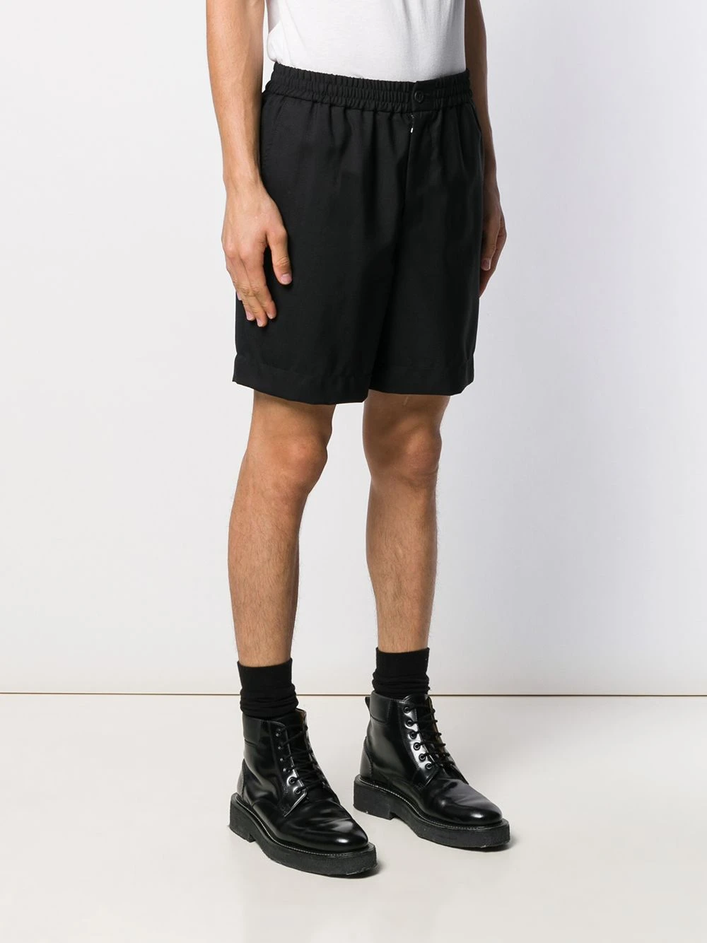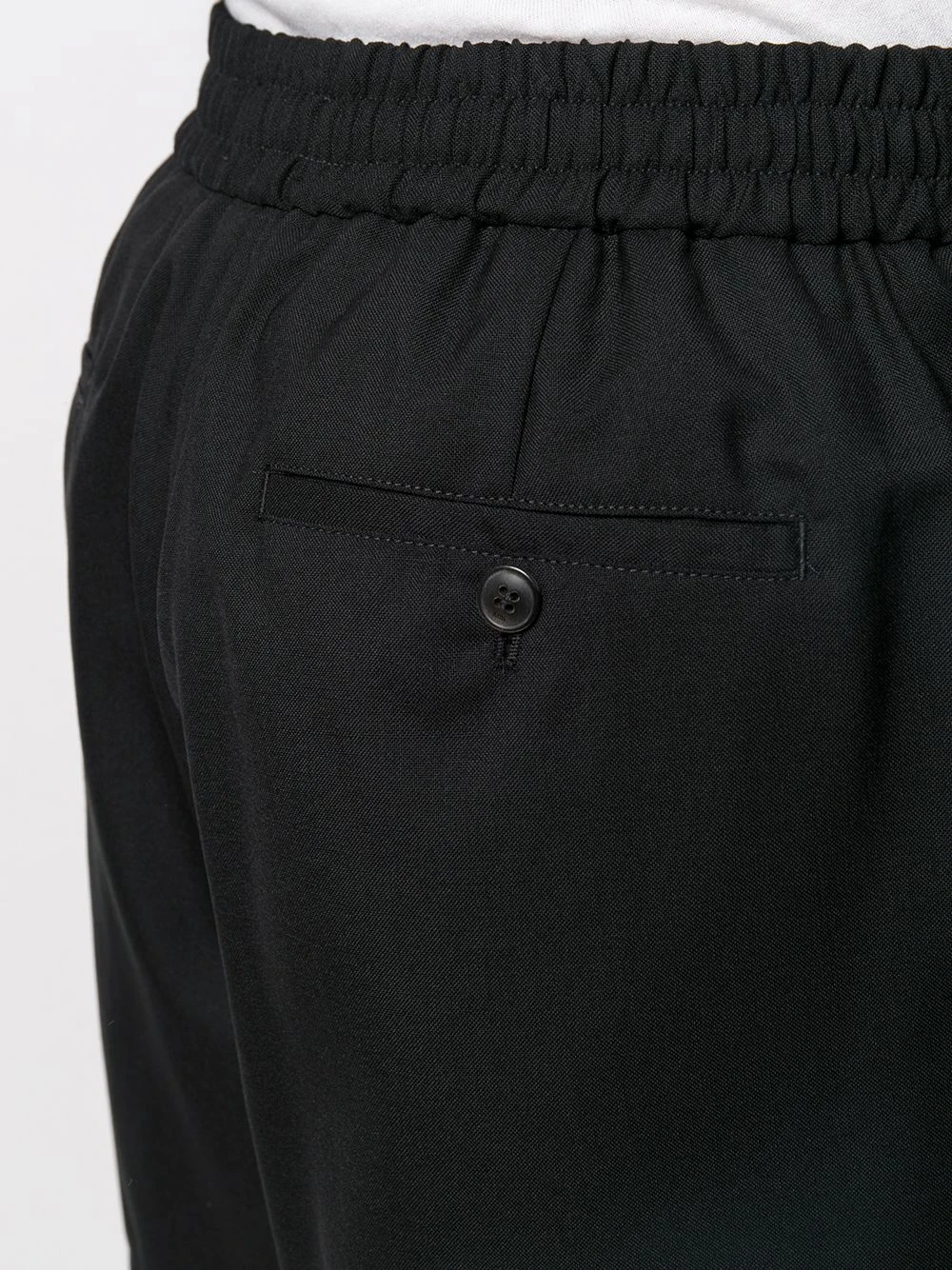 Bermuda à taille élastique en laine vierge AMI Alexandre Mattiussi avec ceinture élastique, boutonnière sur le devant, poches latérales et deux poches arrière passepoilées et boutonnées. Couleur : noir.