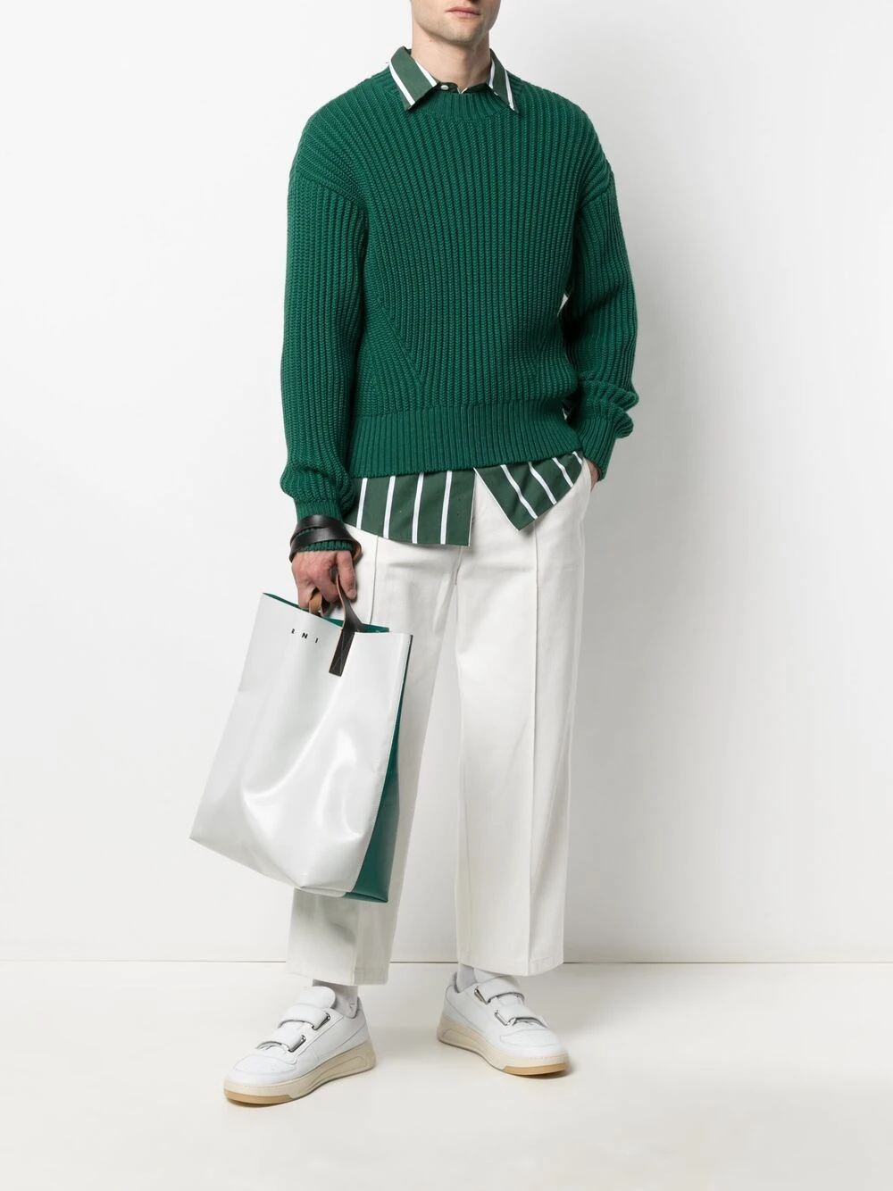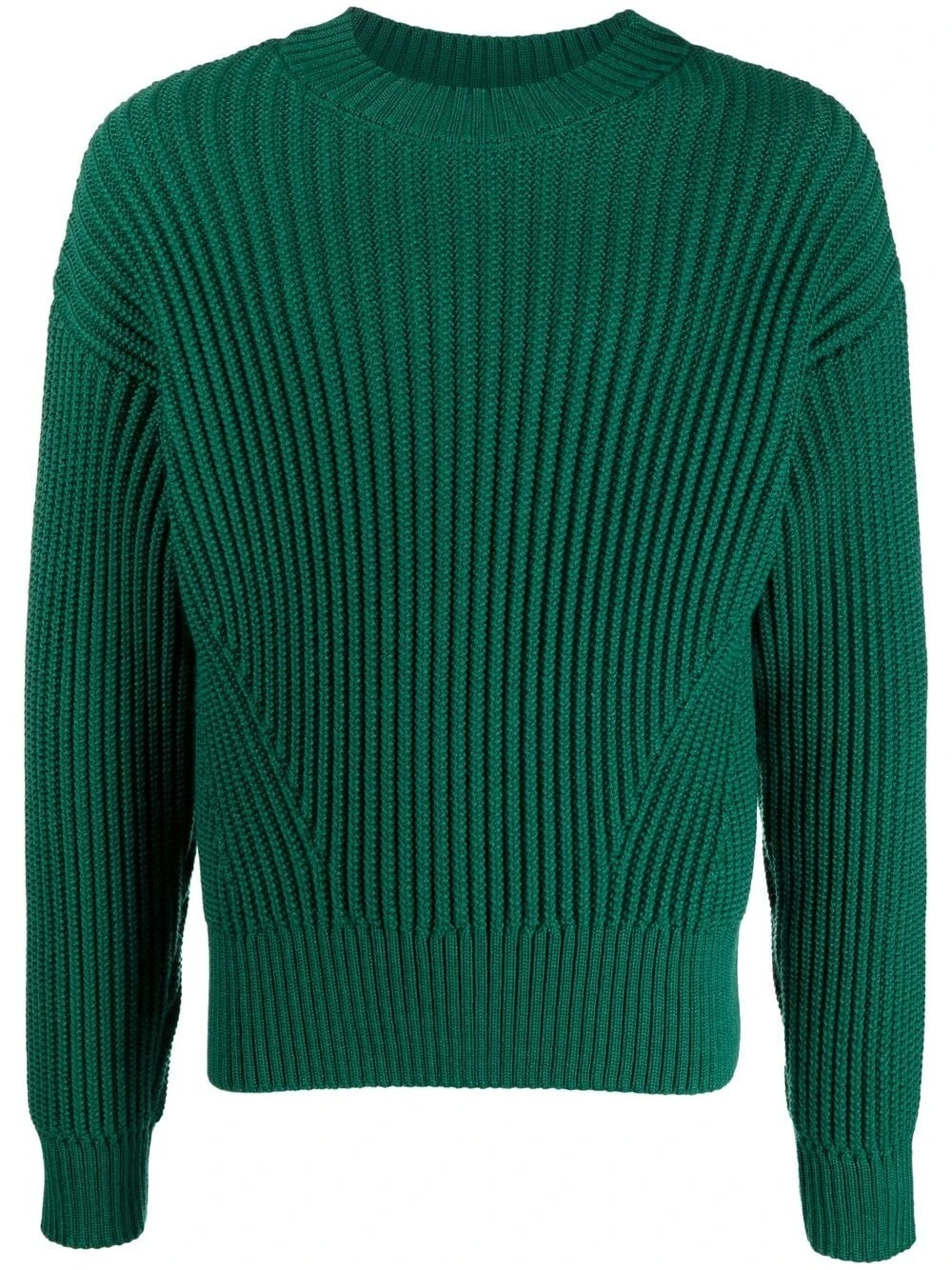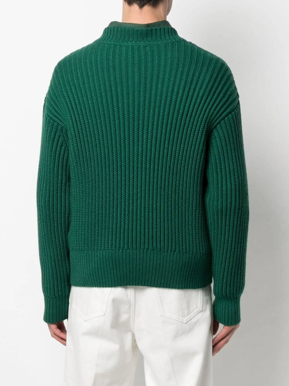 Maille nervurée, encolure ronde, effet d’épaules descendues, manches longues. Couleur : vert. Matière : laine vierge.