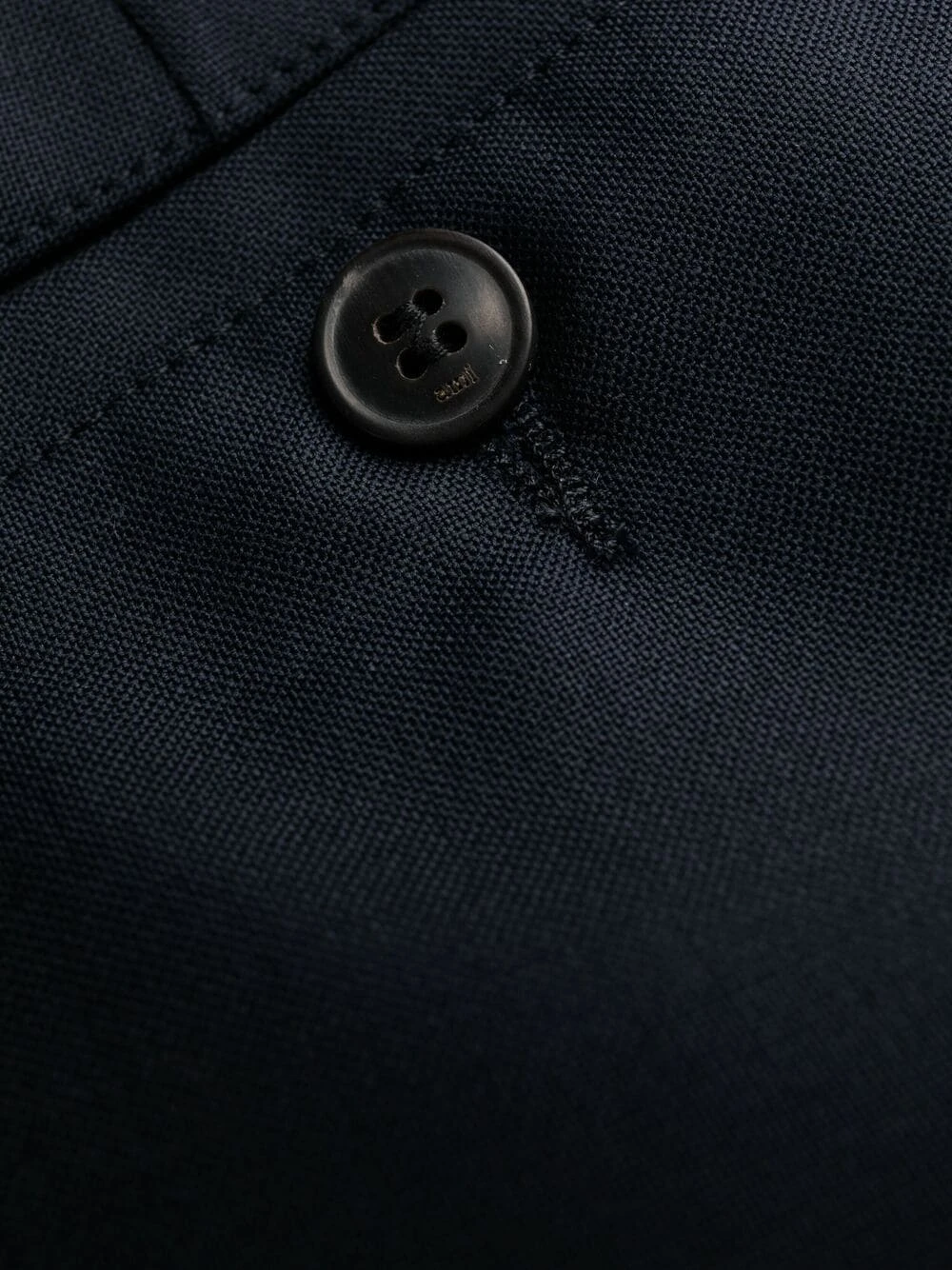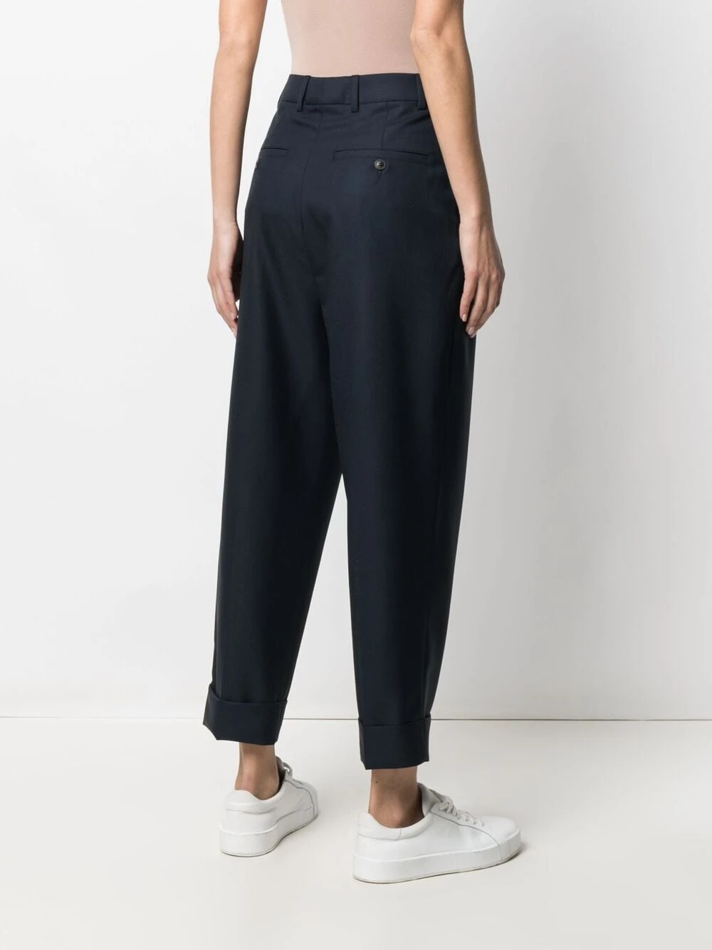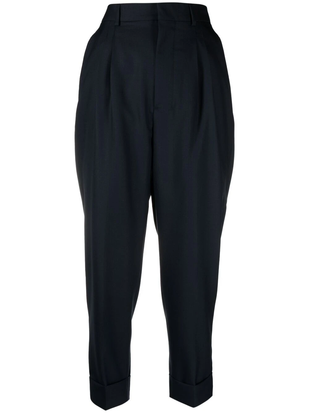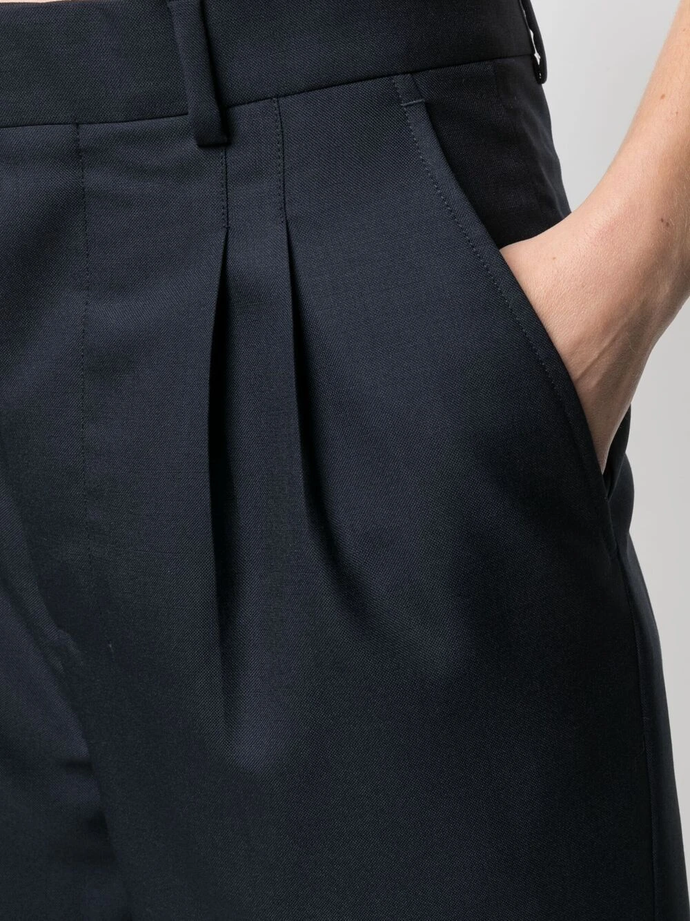 Pinces, poignets retroussés, passants de ceinture, taille haute, fermeture à zip et boutons sur le devant, coupe fuselé, poches latérales fendues, poches arrière passepoilées. Matière : laine vierge.