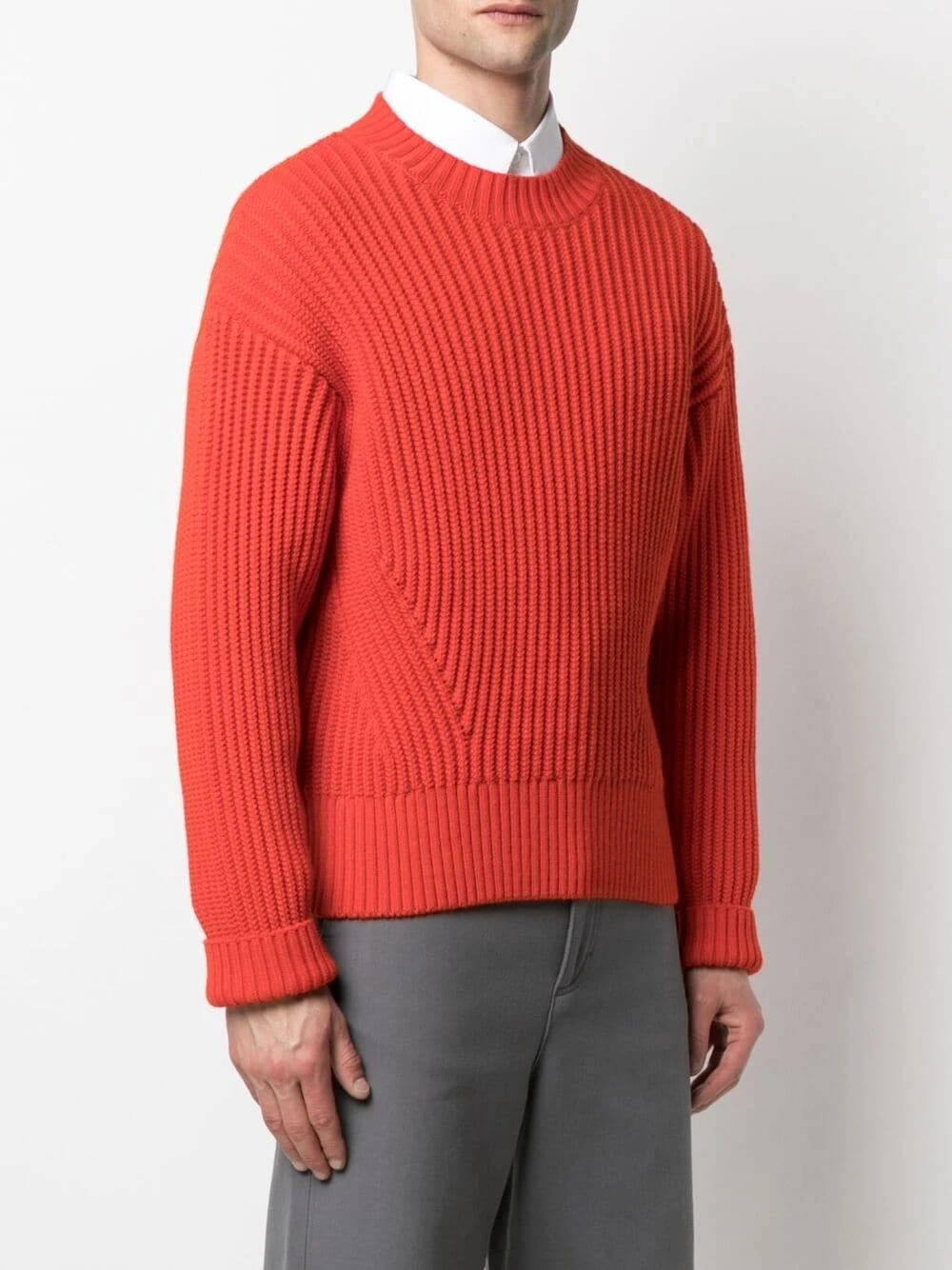 Maille nervurée, encolure ronde, effet d’épaules descendues, manches longues. Couleur : rouge. Matière : laine vierge.