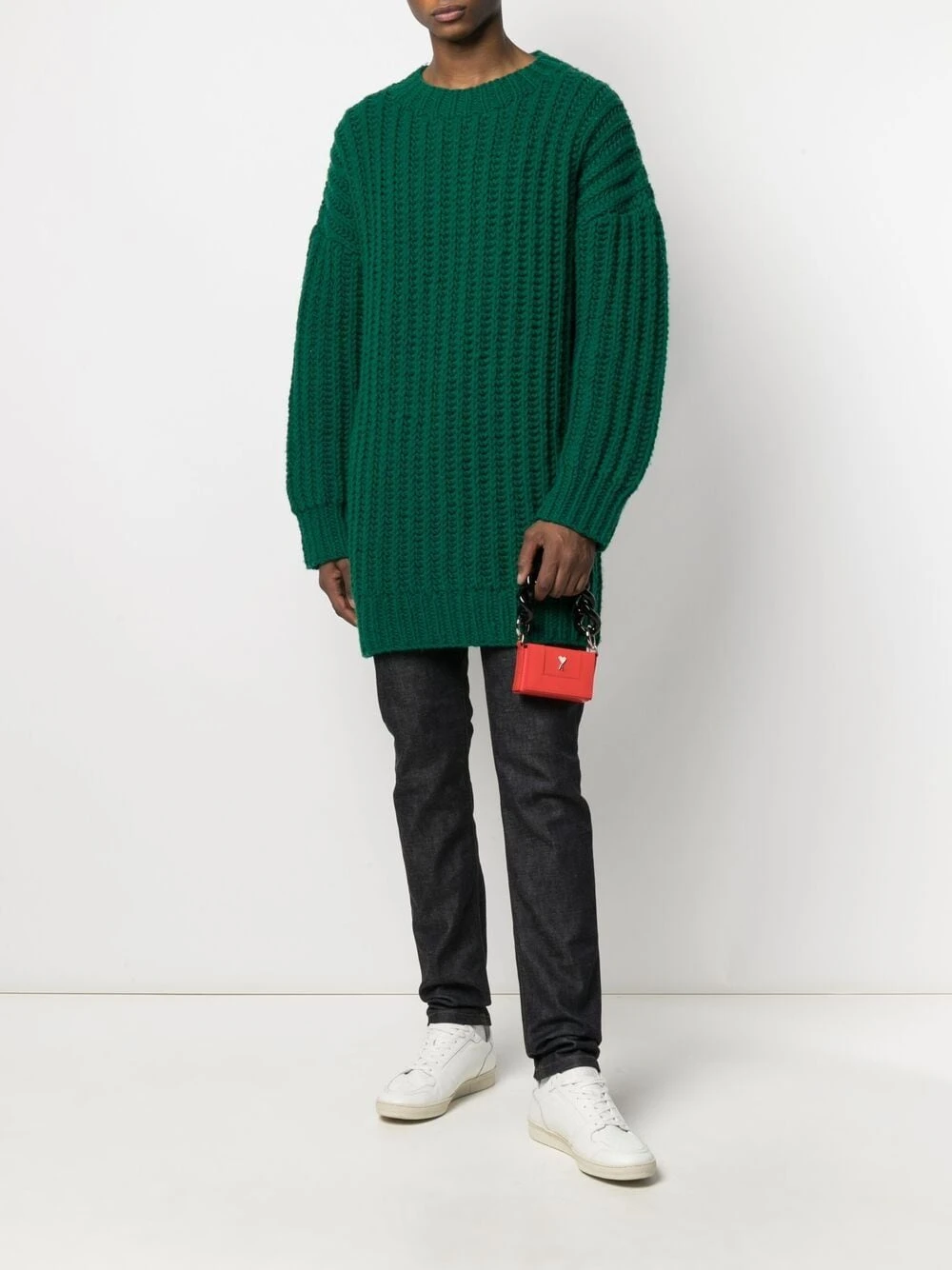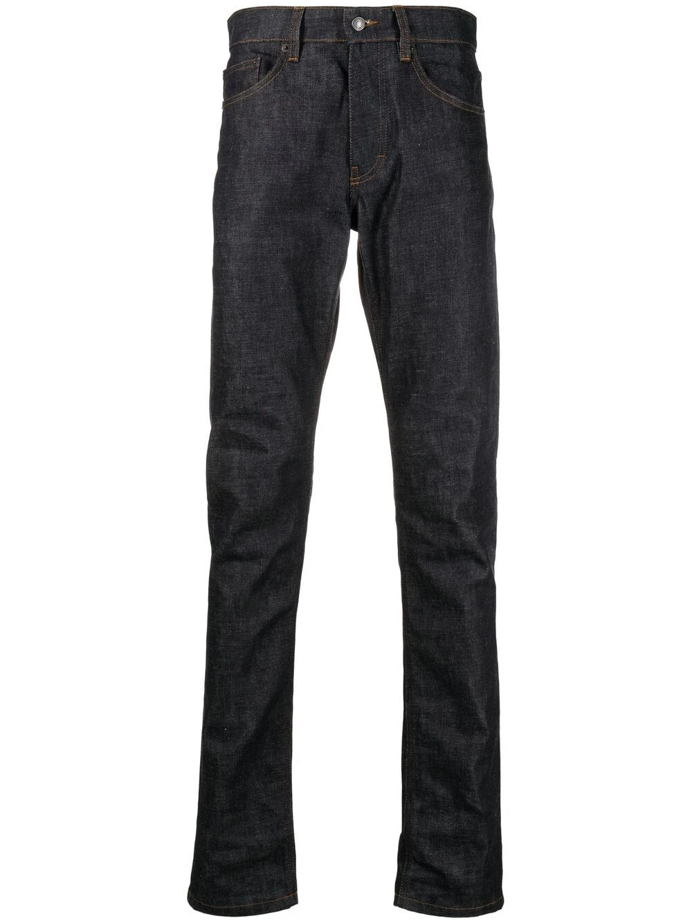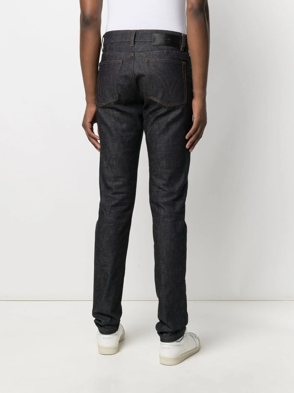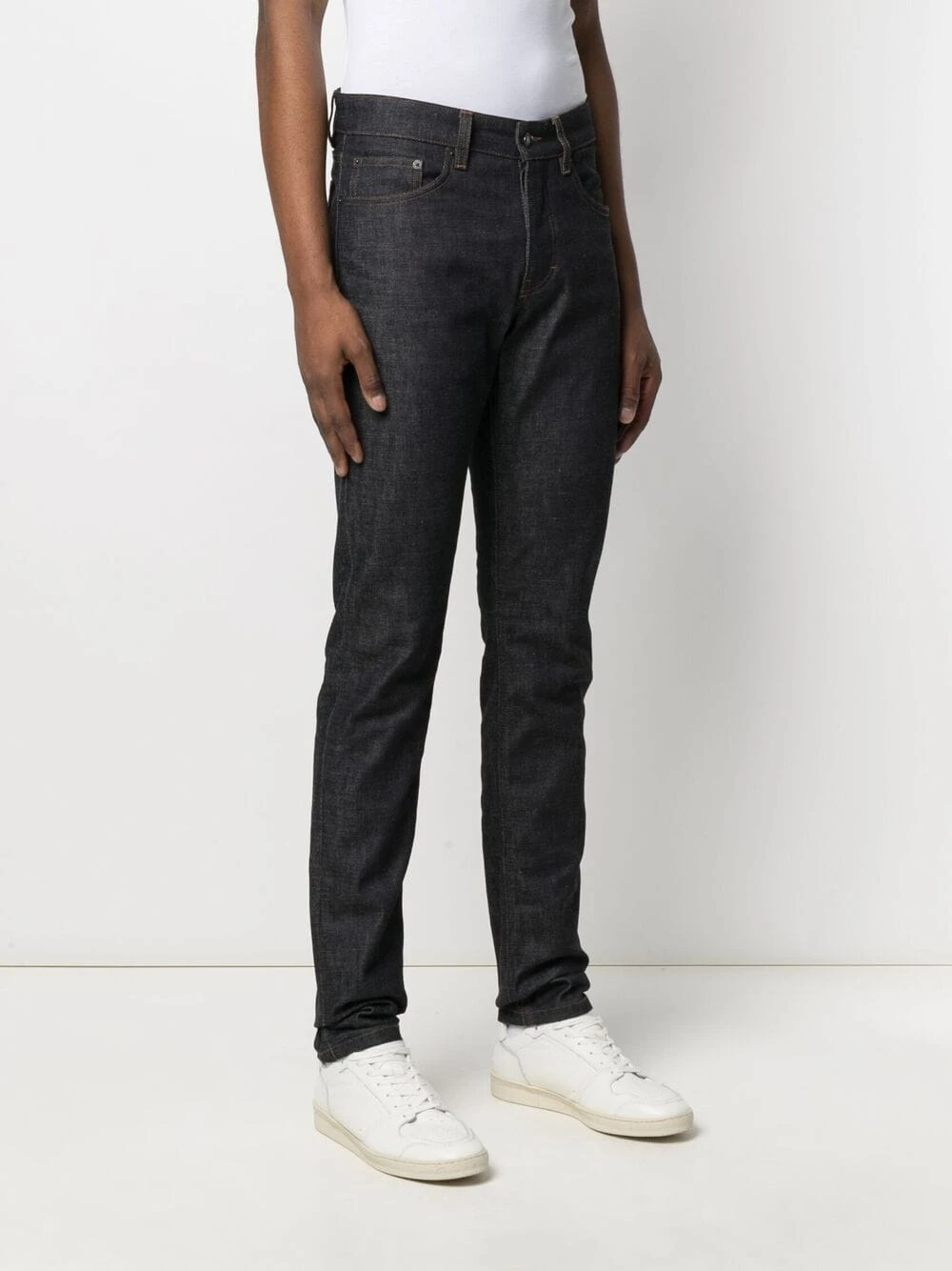 Taille mi-haute, fermeture boutonnée, coutures contrastantes, passants de ceinture, cinq poches classiques, coupe slim. Matière : coton.