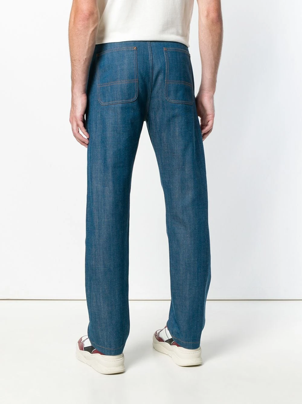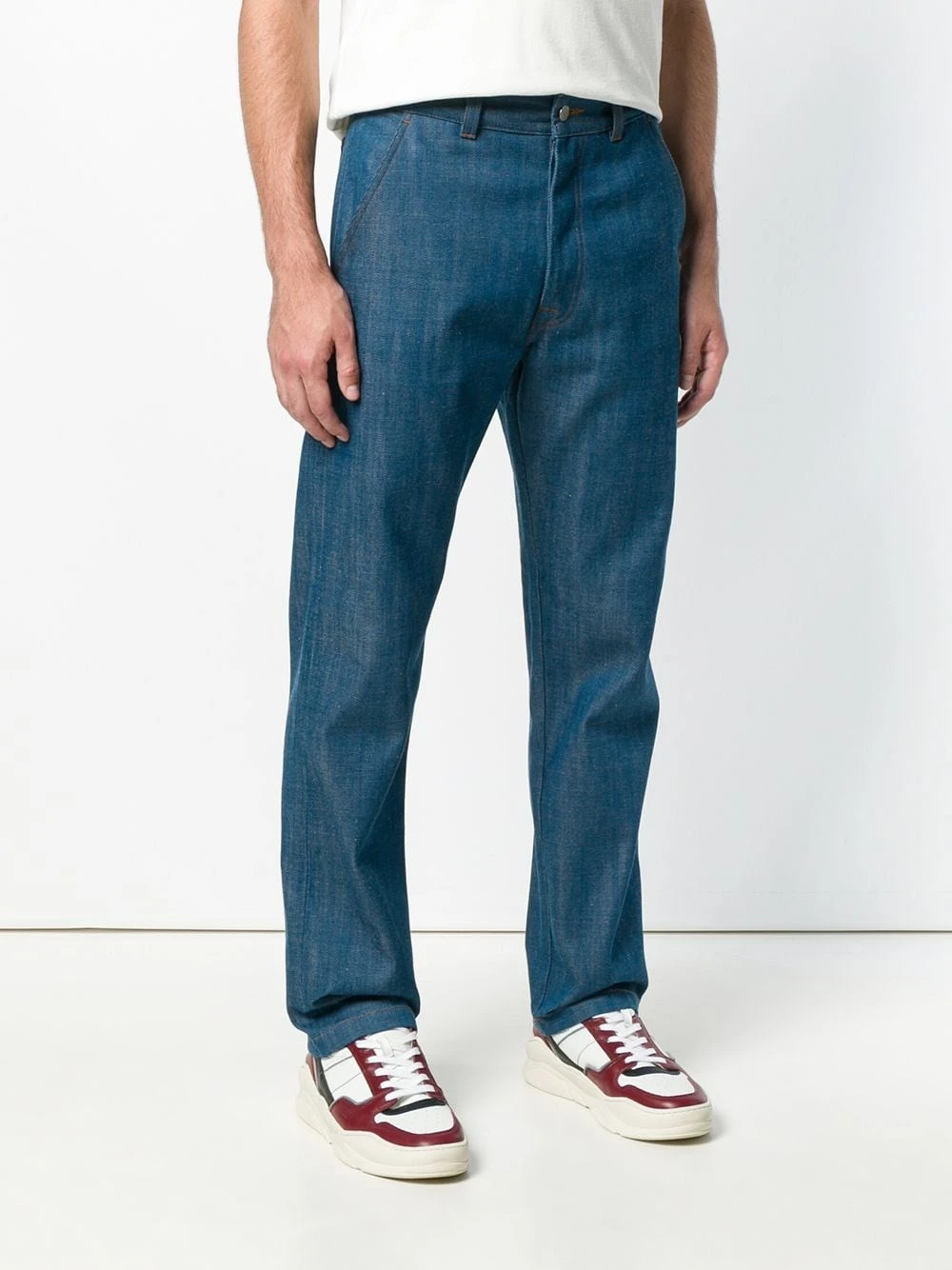 Jean droit en coton Ami Alexandre Mattiussi avec taille normale, coupe droite, bouton et zip, passants de ceinture à la taille, coupe classique cinq poches et détails de coutures.