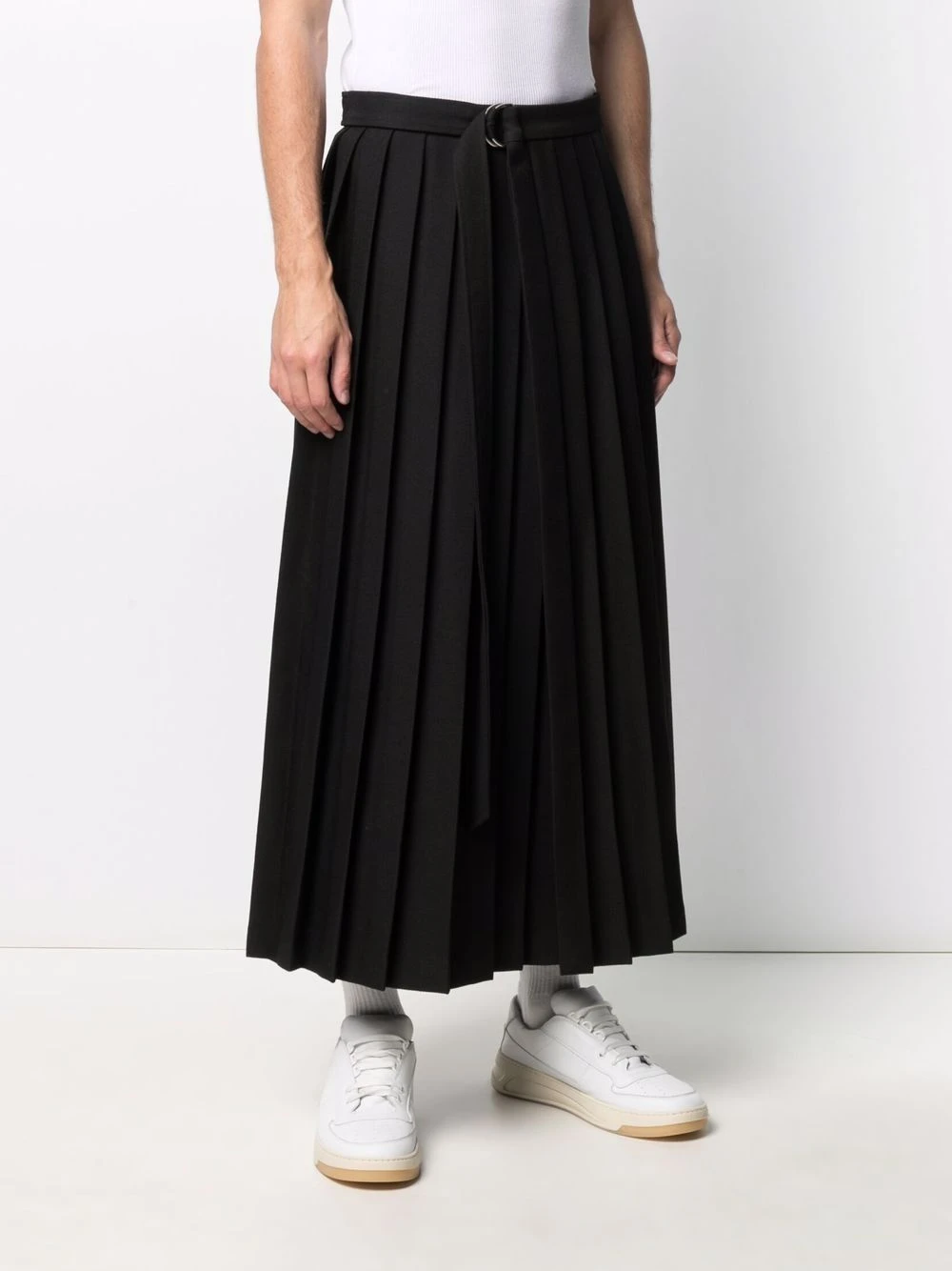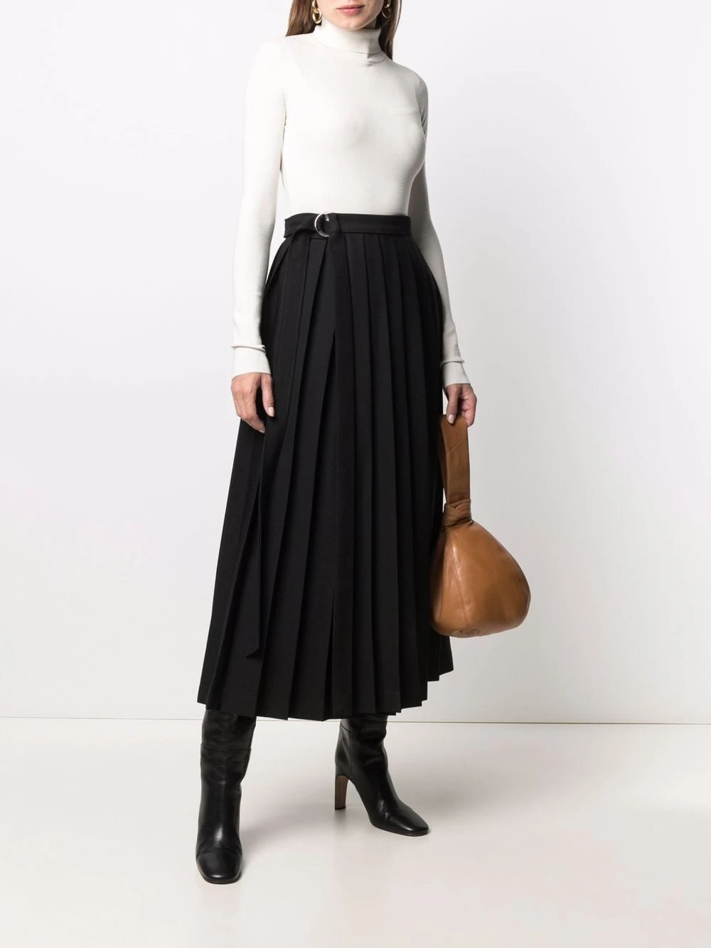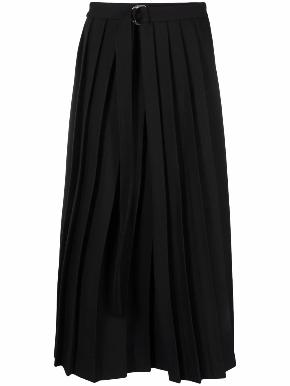 Détails de plis, fermeture à boucle D, taille ceinturée, coupe longue. Couleur : noir.
