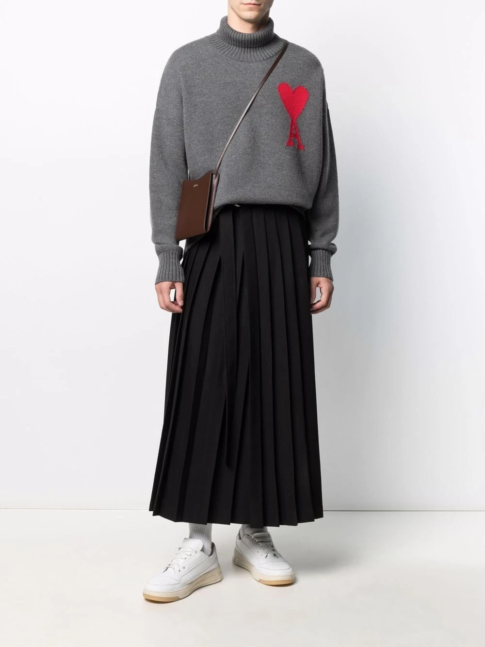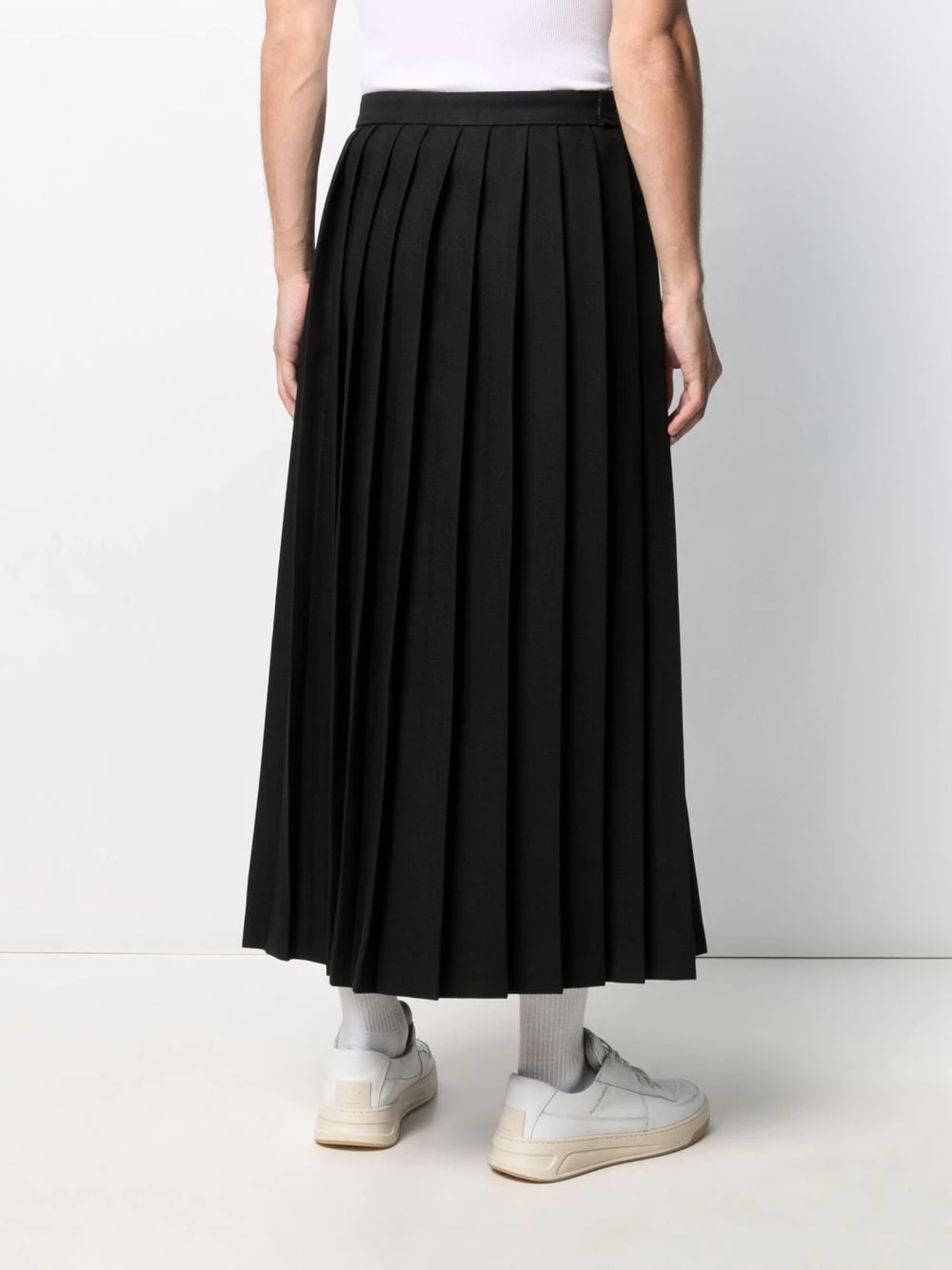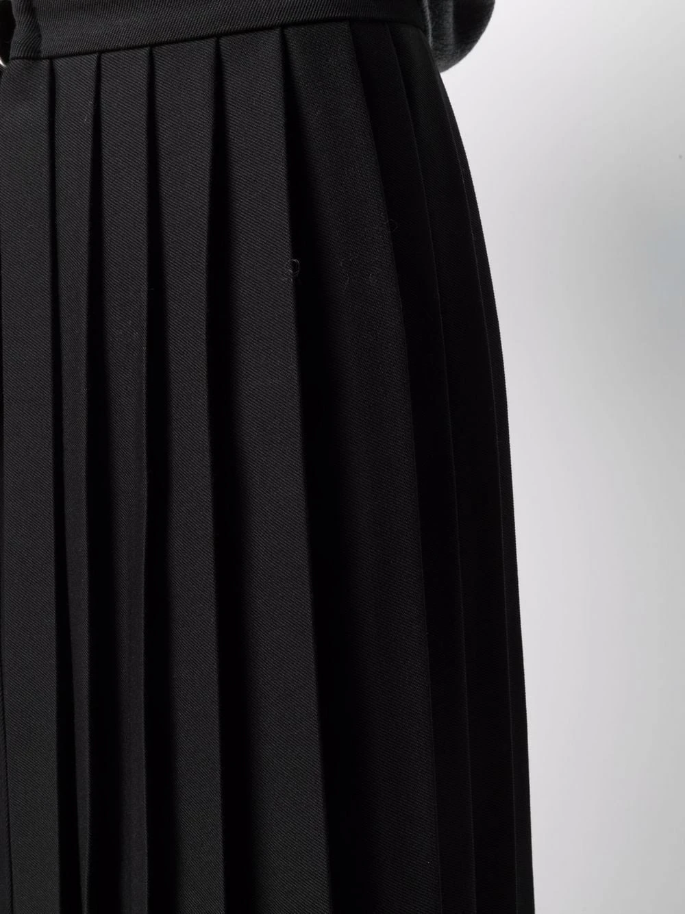 Détails de plis, fermeture à boucle D, taille ceinturée, coupe longue. Couleur : noir.