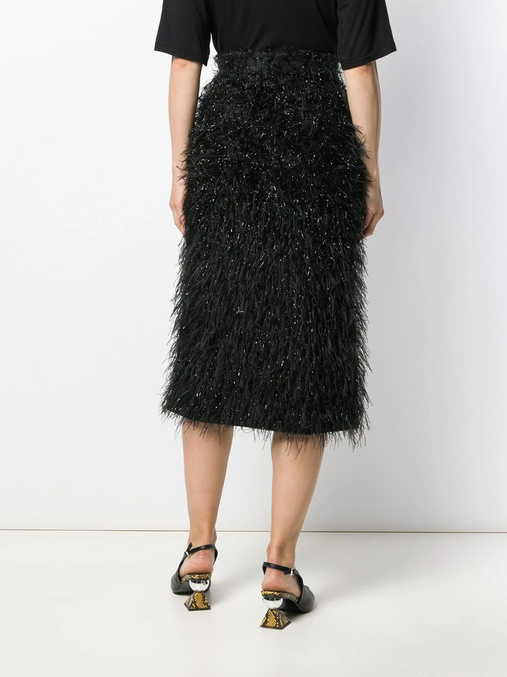Jupe mi-longue texturée AMI Paris avec taille haute, effet métallisé, longueur medium et fente sur le devant. Couleur : noir.