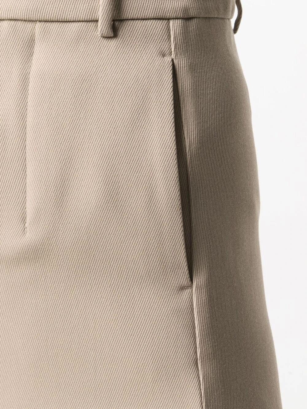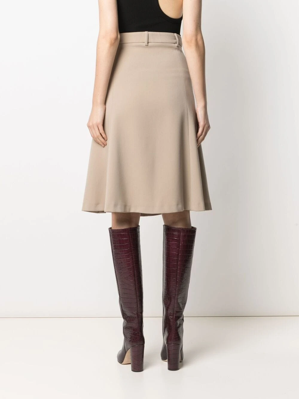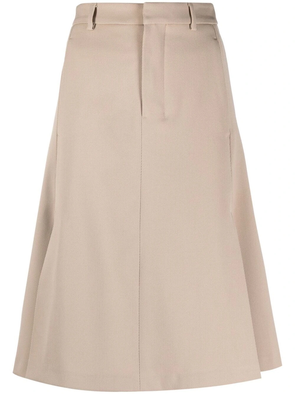 Passants de ceinture, taille haute, poches latérales fendues, coupe trapèze, hauteur genou.