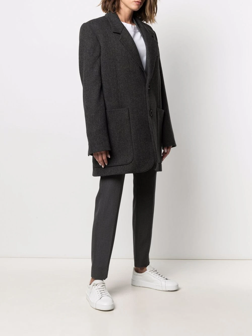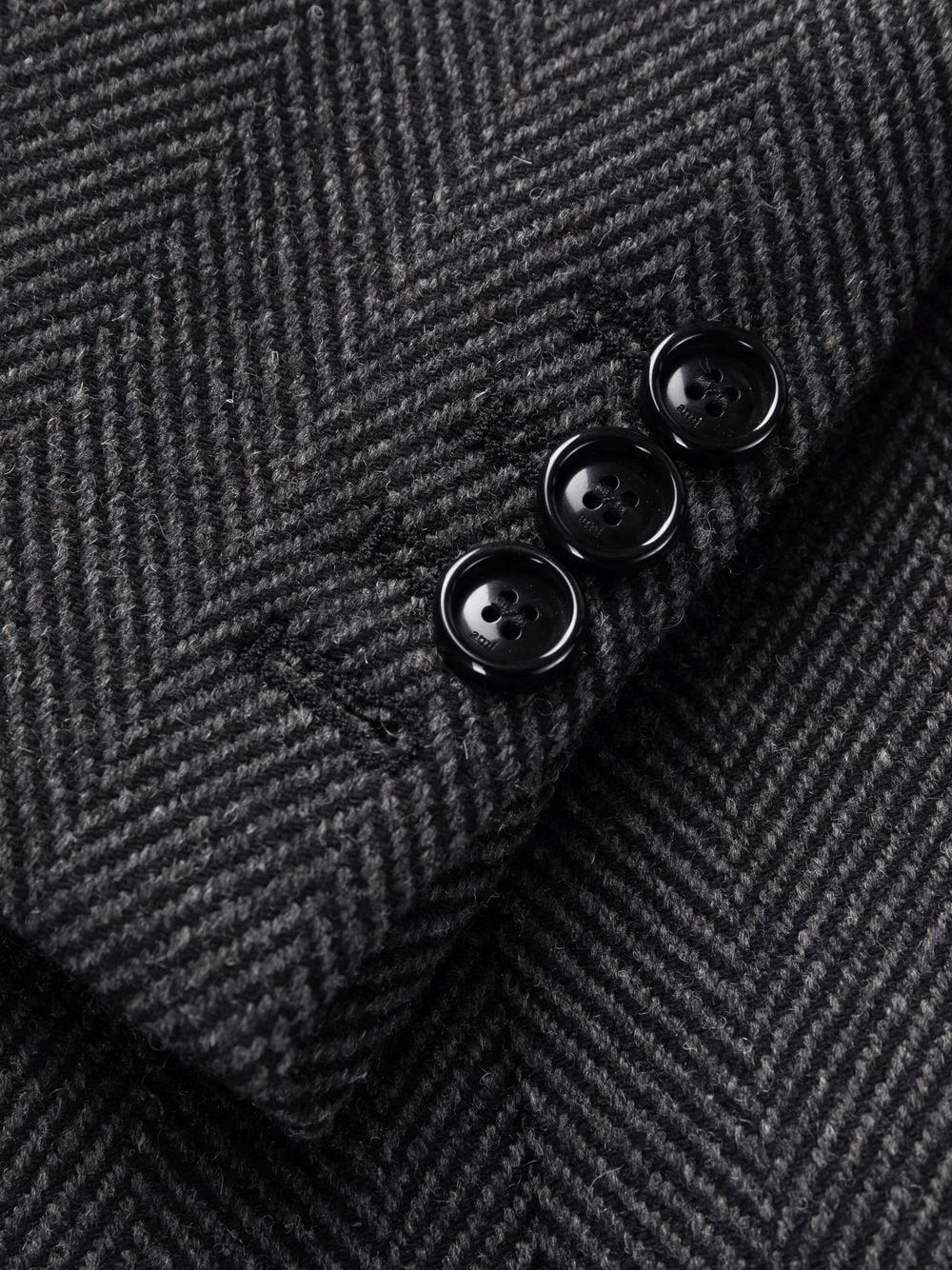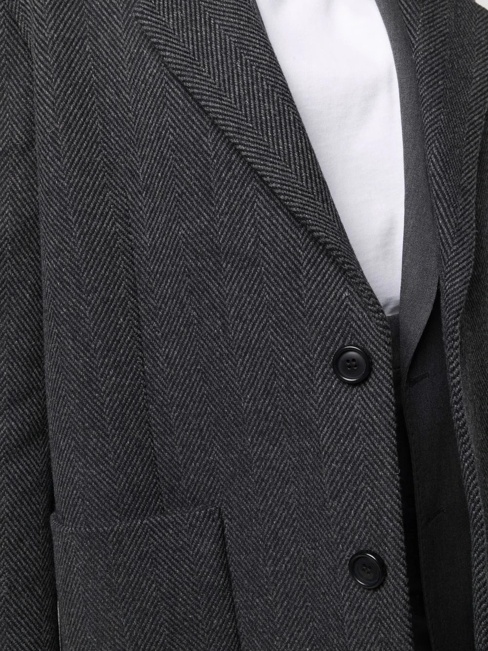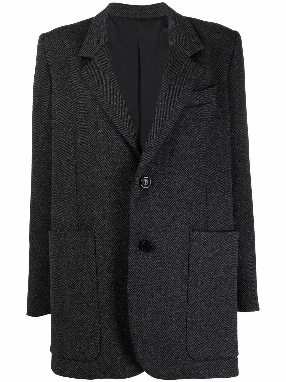 Revers crantés, motif de chevrons, poche passepoilée sur la poitrine, boutonnière sur le devant, manches longues, deux poches plaquées avant, fente arrière. Matière : laine.