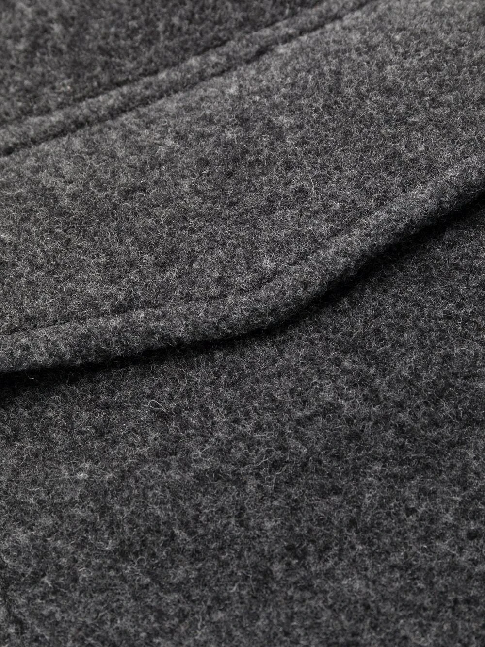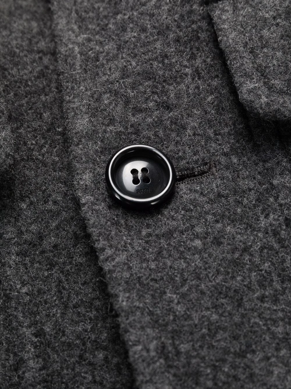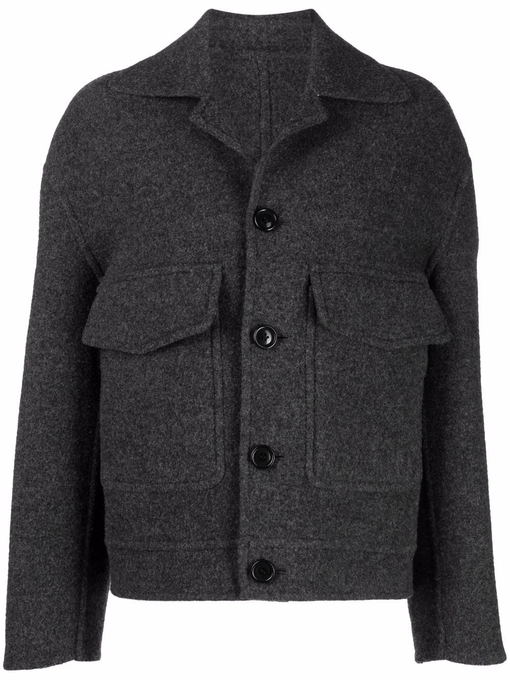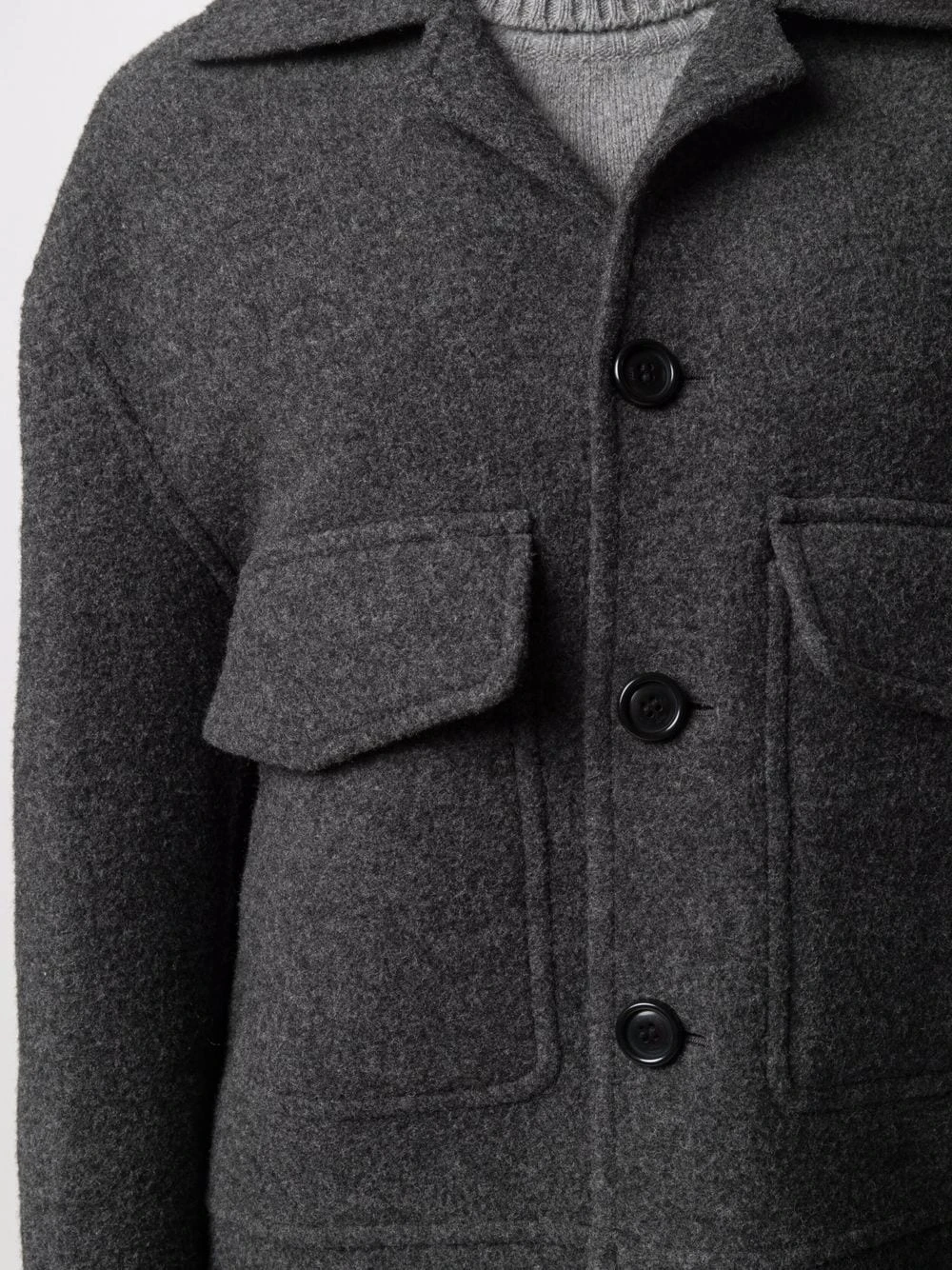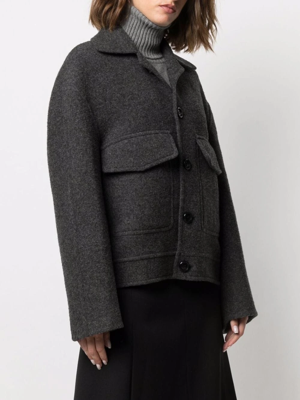 Col cranté, boutonnière sur le devant, deux poches à rabat sur le devant, manches longues, ourlet droit. Couleur : gris. Matière : laine.
