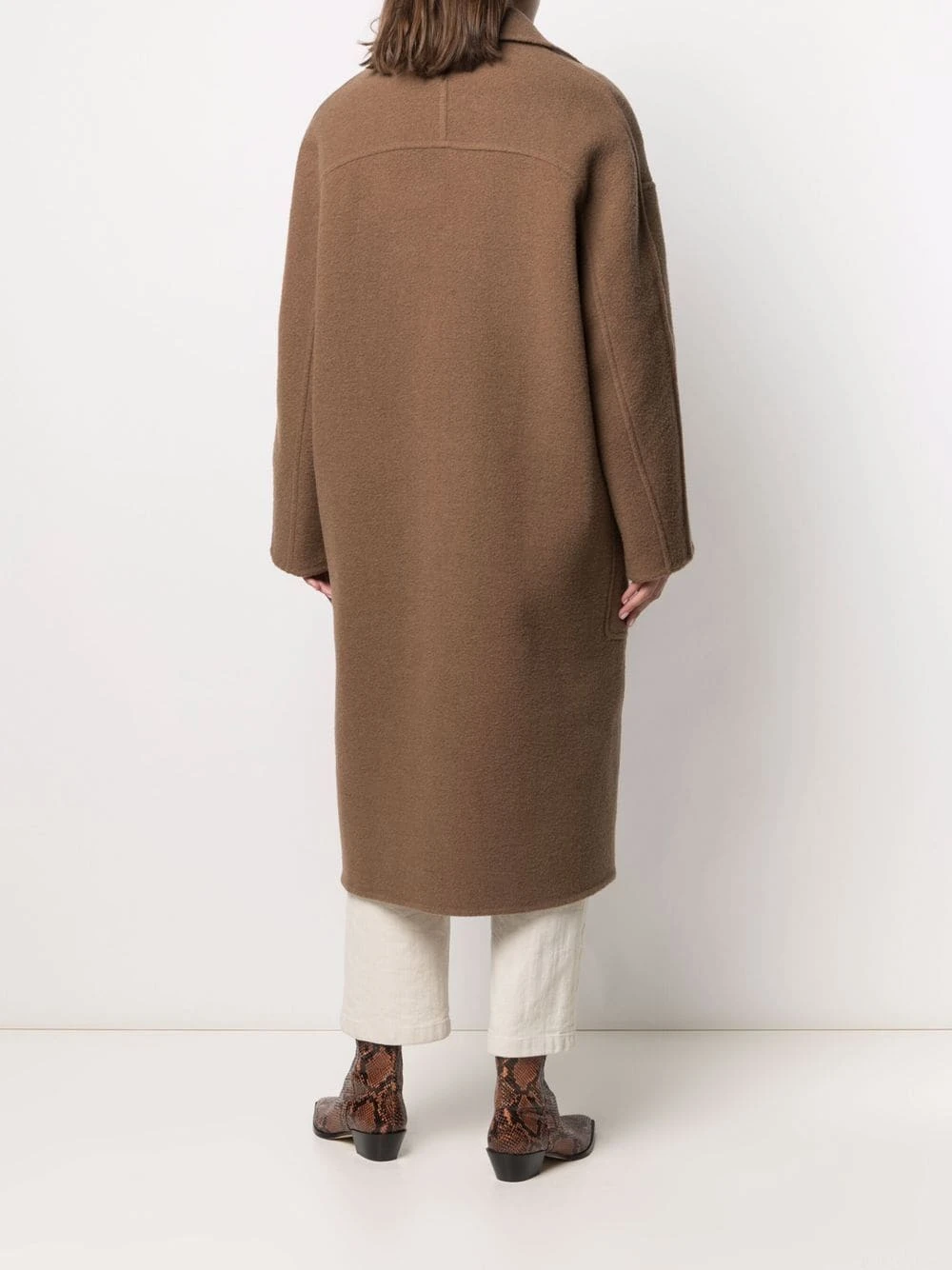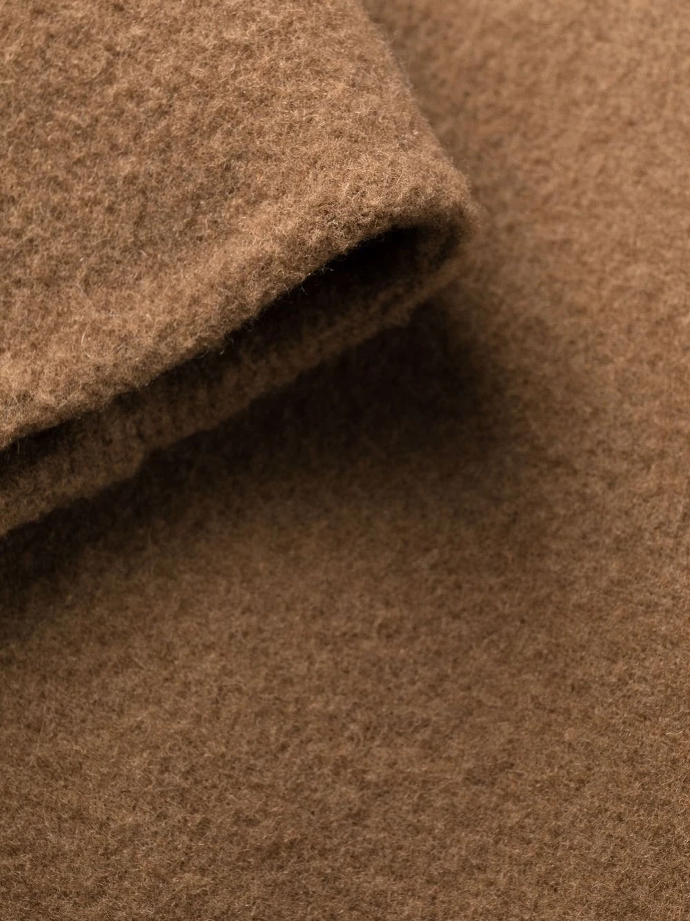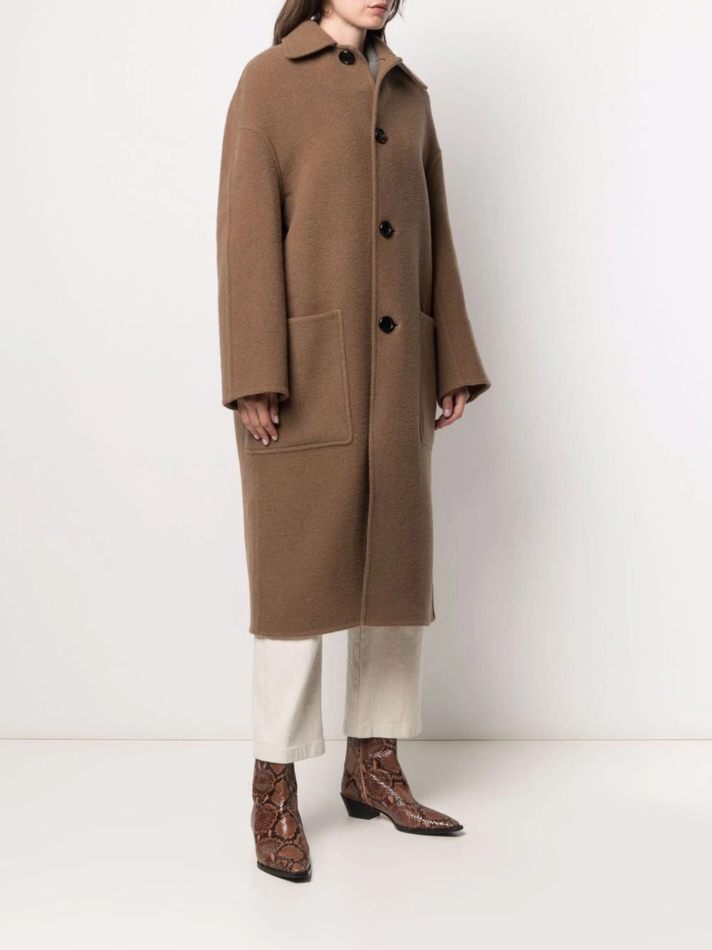 Col cubain, manches longues, boutonnière sur le devant, deux poches plaquées, coupe mi-longue. Couleur : marron. Matière : laine.