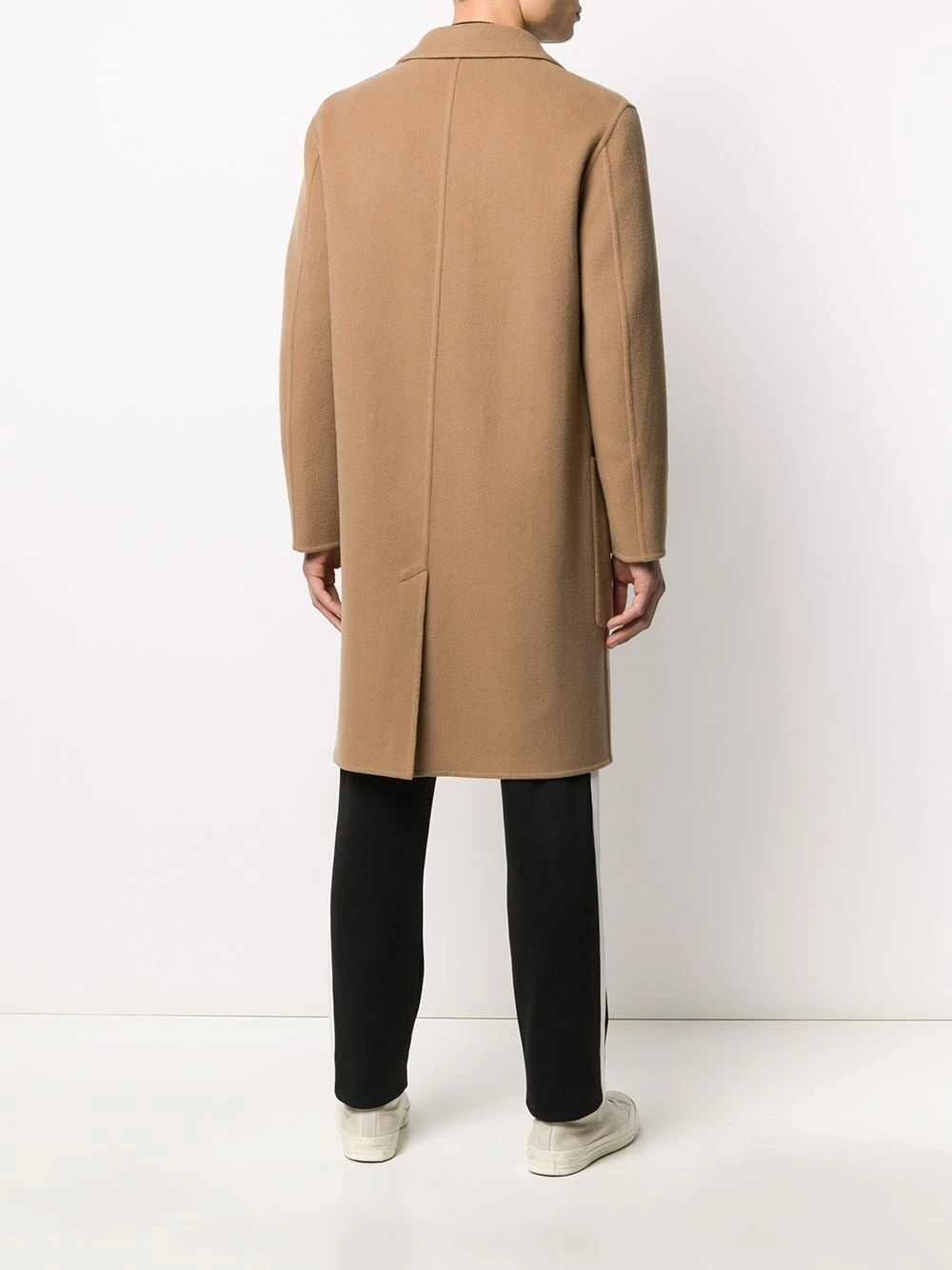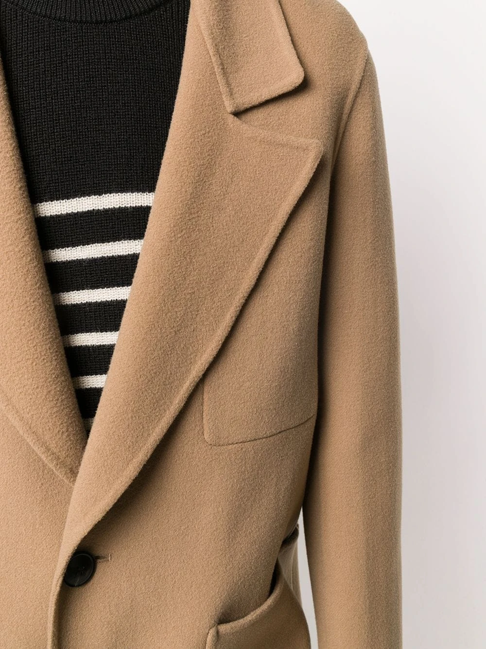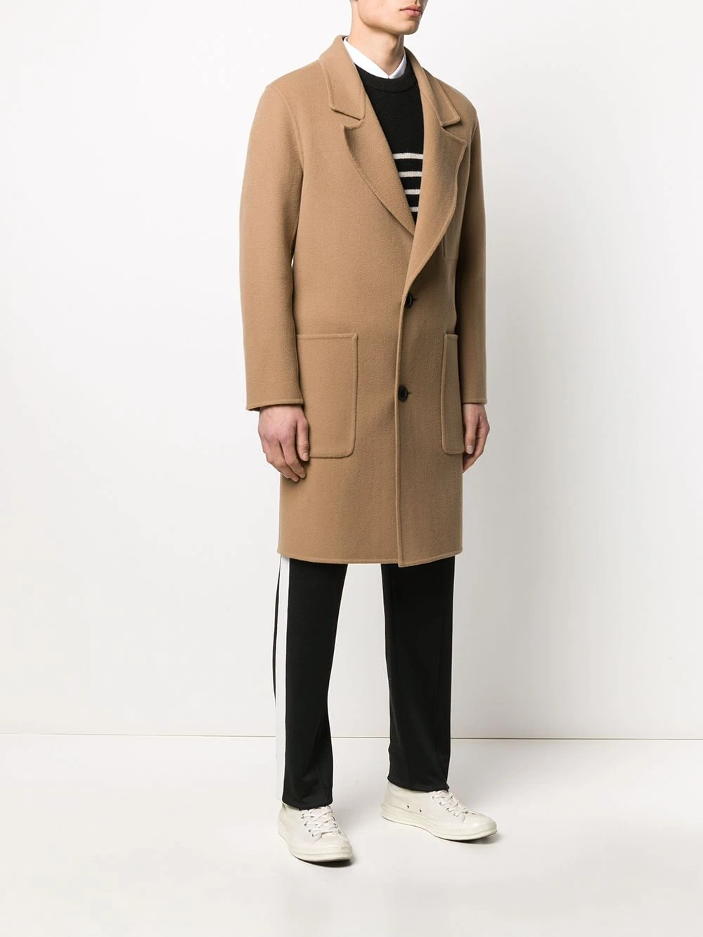 Manteau droit à boutonnière devant AMI Paris avec col à revers crantés, boutonnière sur le devant, poche poitrine, poches devant, manches longues, fente arrière et ourlet droit.