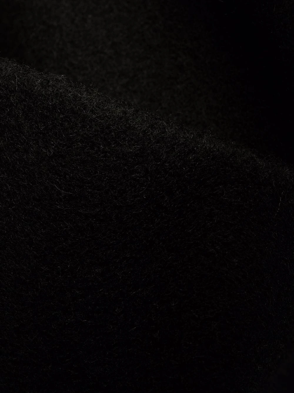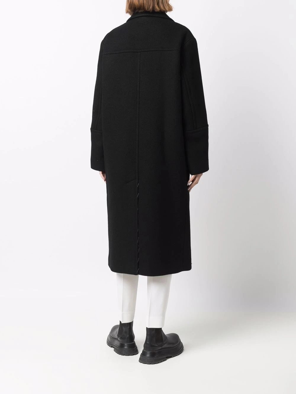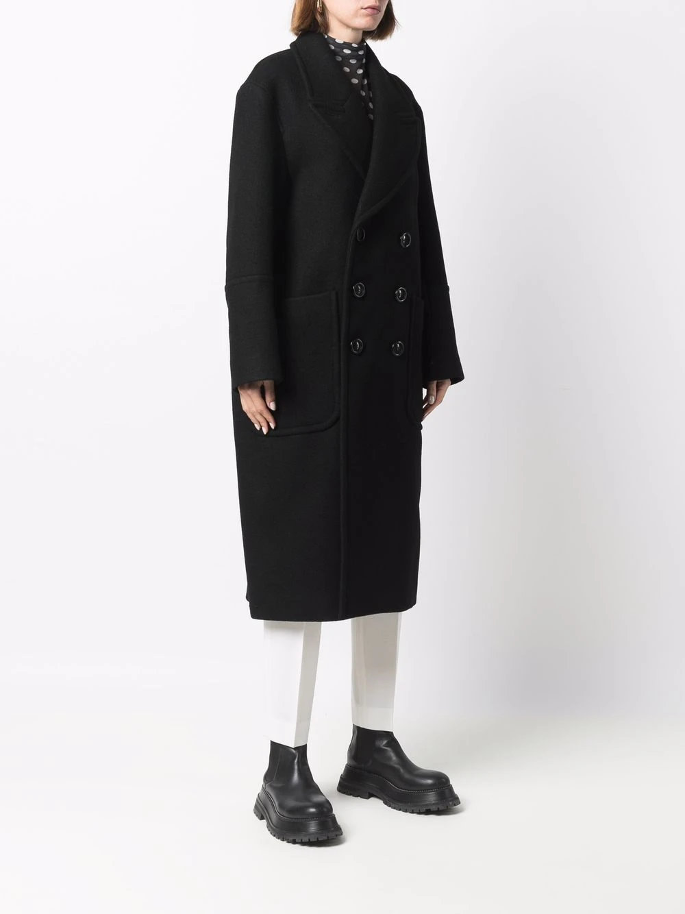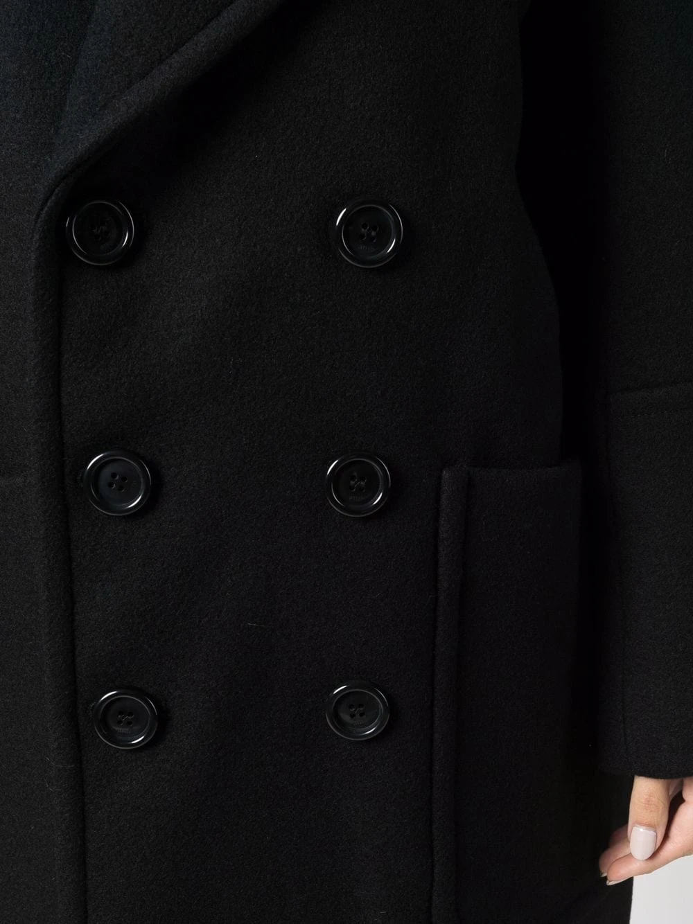 Boutonnière croisée, revers crantés, deux poches plaquées avant, manches longues, fente arrière centrale, ourlet droit, coupe mi-longue. Couleur : noir.