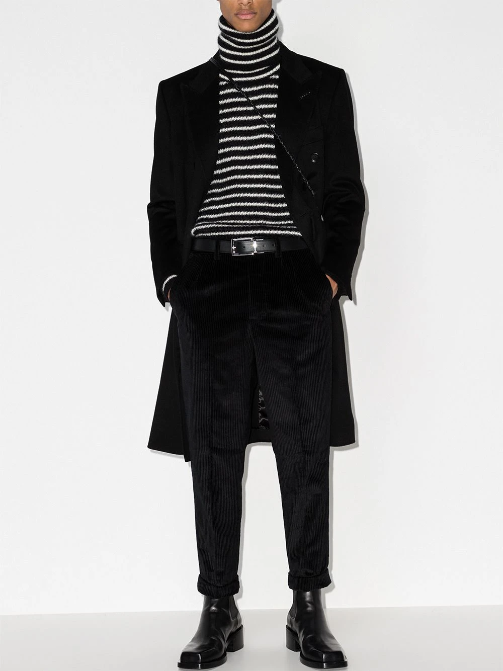 Velours côtelé, ourlet retroussé, passants de ceinture, fermeture dissimulée sur le devant, coupe fuselée, poches latérales fendues, poches arrière passepoilées. Couleur : noir. Matière : coton.
