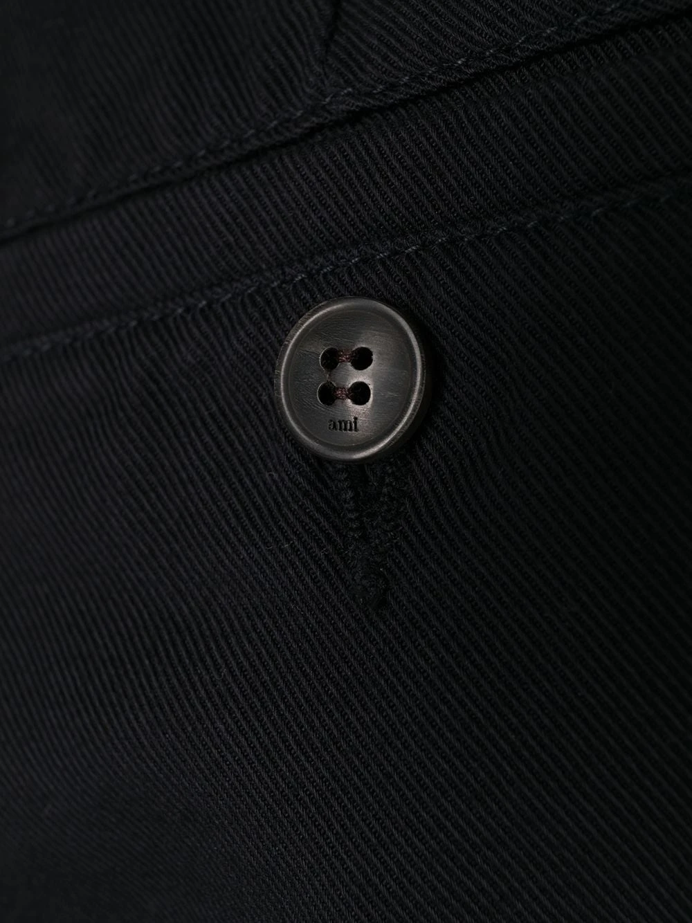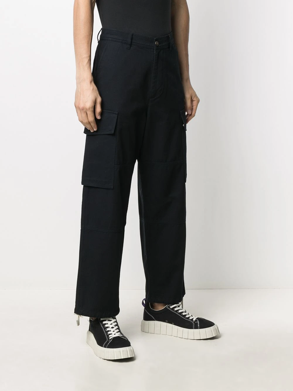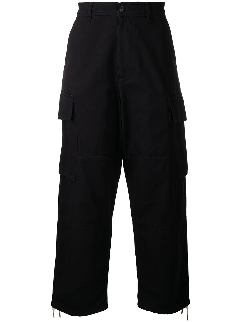 Pantalon ample à poches cargo en coton AMI Paris avec bouton et zip, passants de ceinture, poches latérales fendues, deux poches passepoilées boutonnées au dos et coupe ample.
