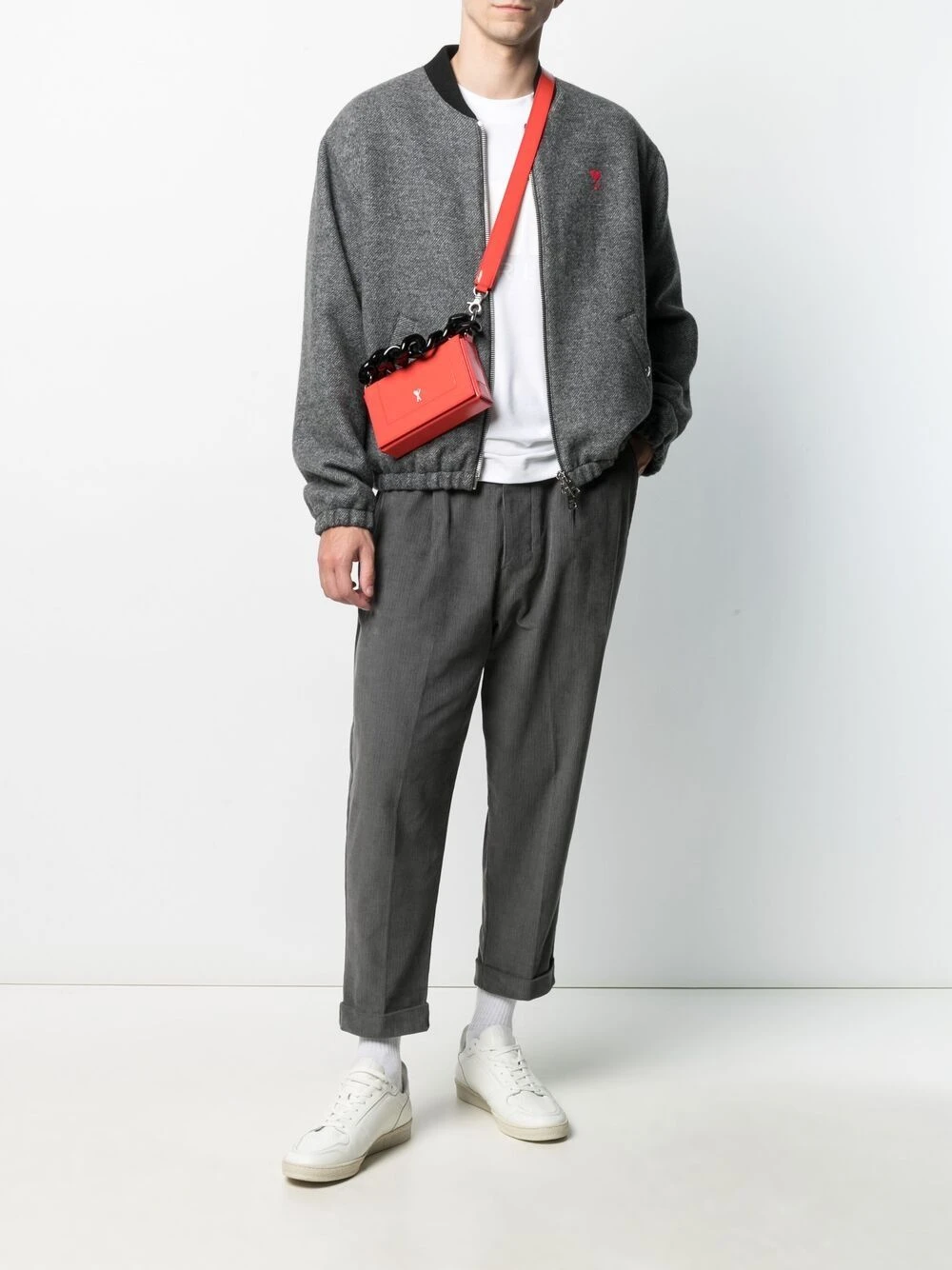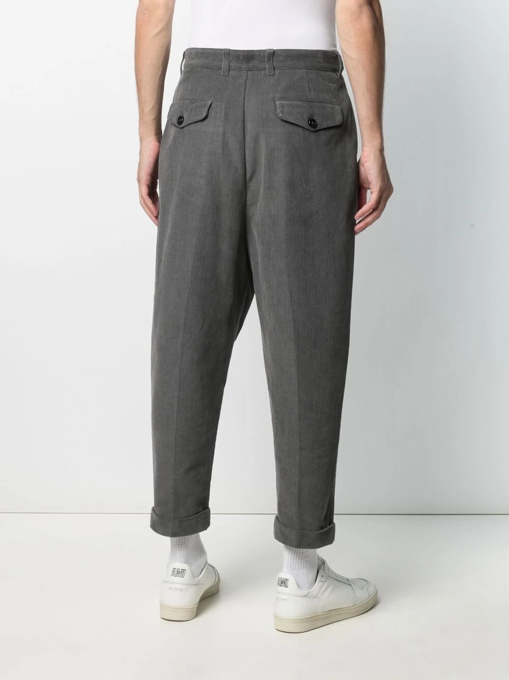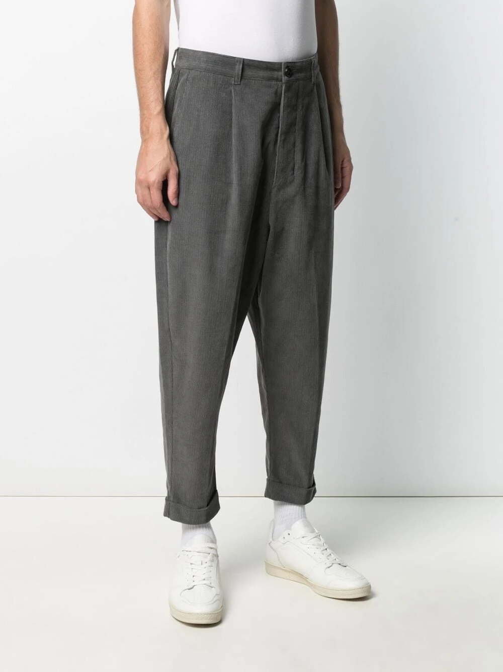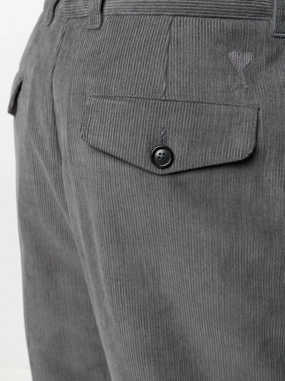 Logo Ami de Coeur signature, velours côtelé, passants de ceinture, fermeture à zip et boutons sur le devant, effet sarouel, deux poches latérales fendues, poches arrière à rabat, coupe fuselée, ourlet retroussé, longueur crop. Couleur : gris. Matière : coton.