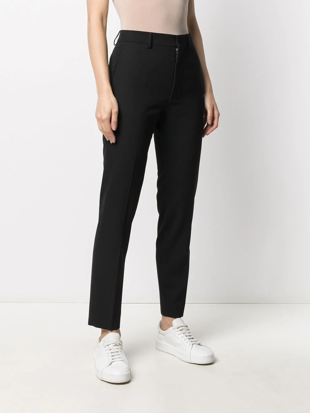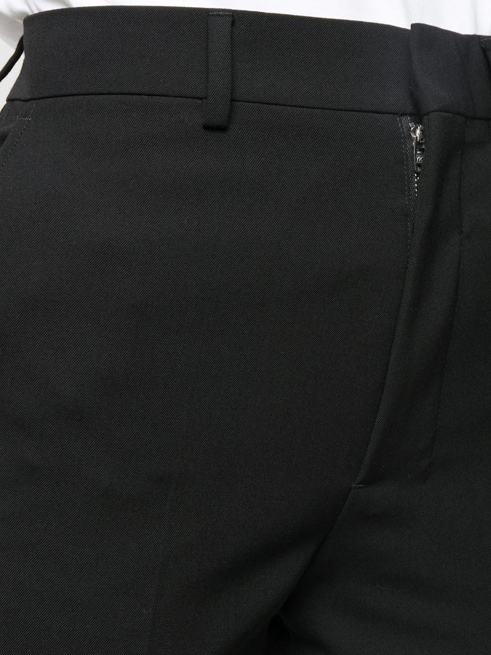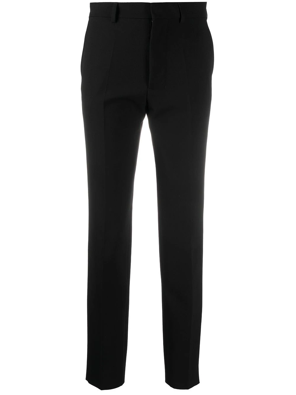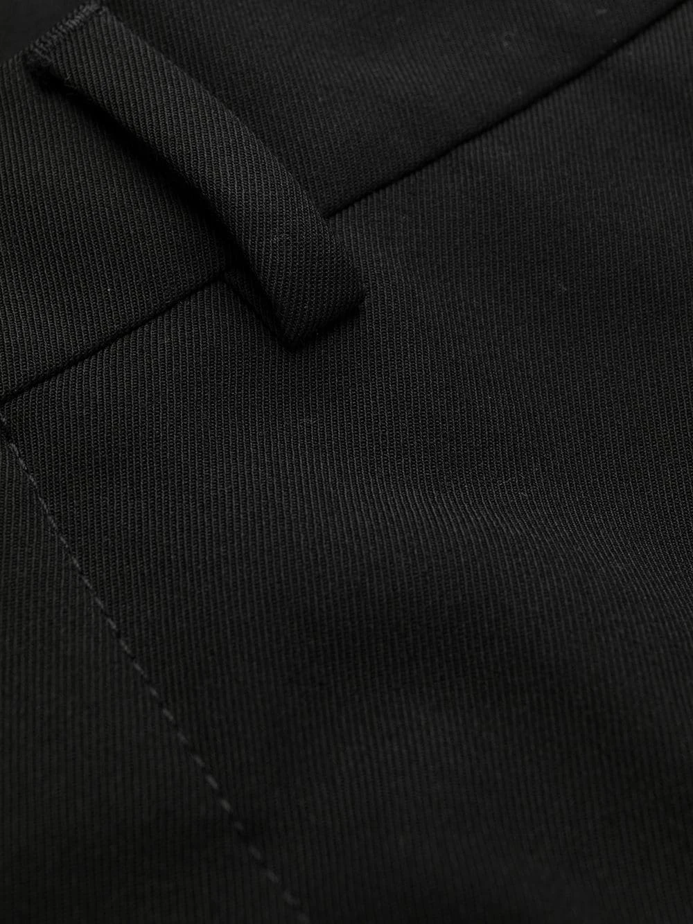 Taille mi-haute, passants de ceinture, fermeture dissimulée sur le devant, poches latérales fendues, deux poches arrières boutonnées, coupe ajustée. Couleur : noir.