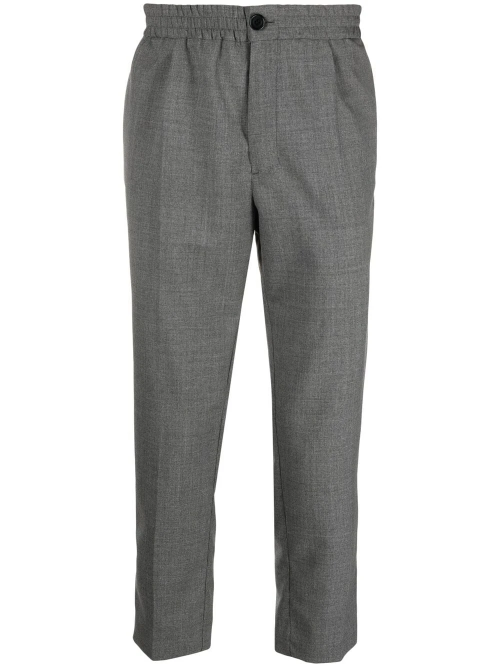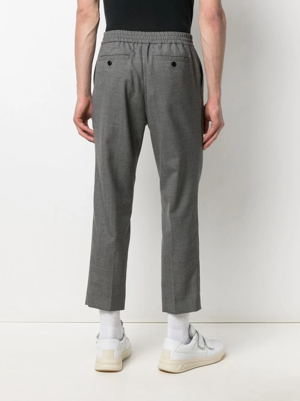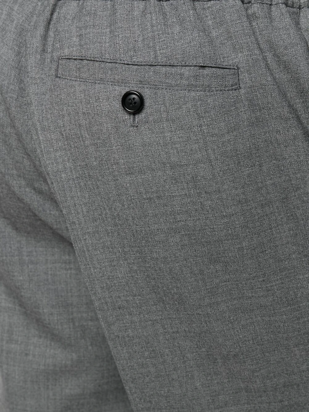 Ceinture élastique, plis marqués, fermeture à zip et boutons sur le devant, deux poches latérales fendues, poches arrière passepoilées, longueur crop. Couleur : gris.