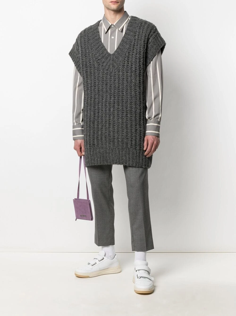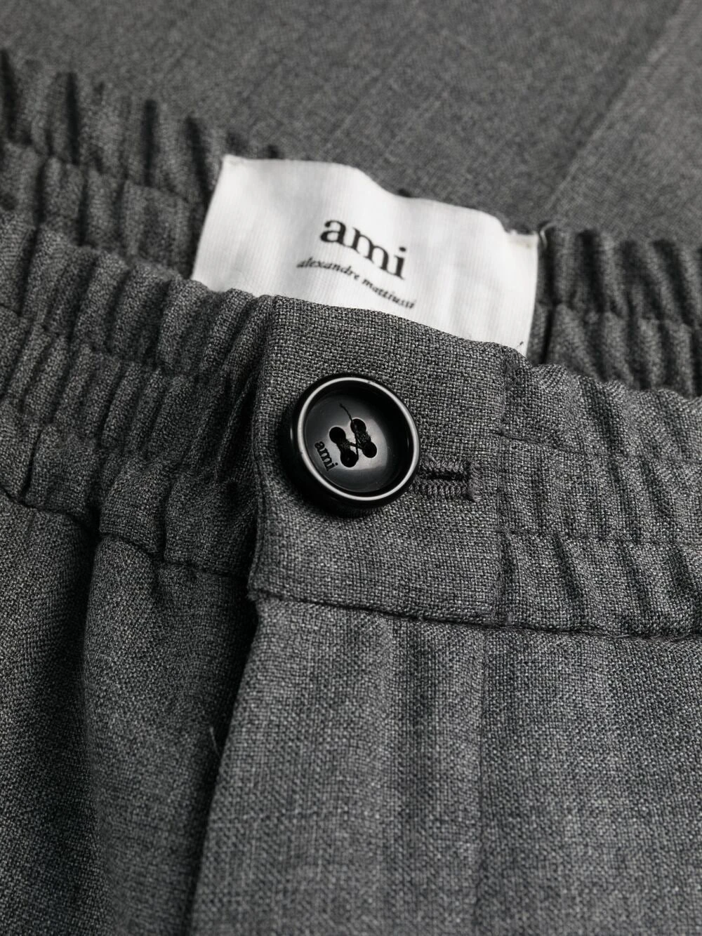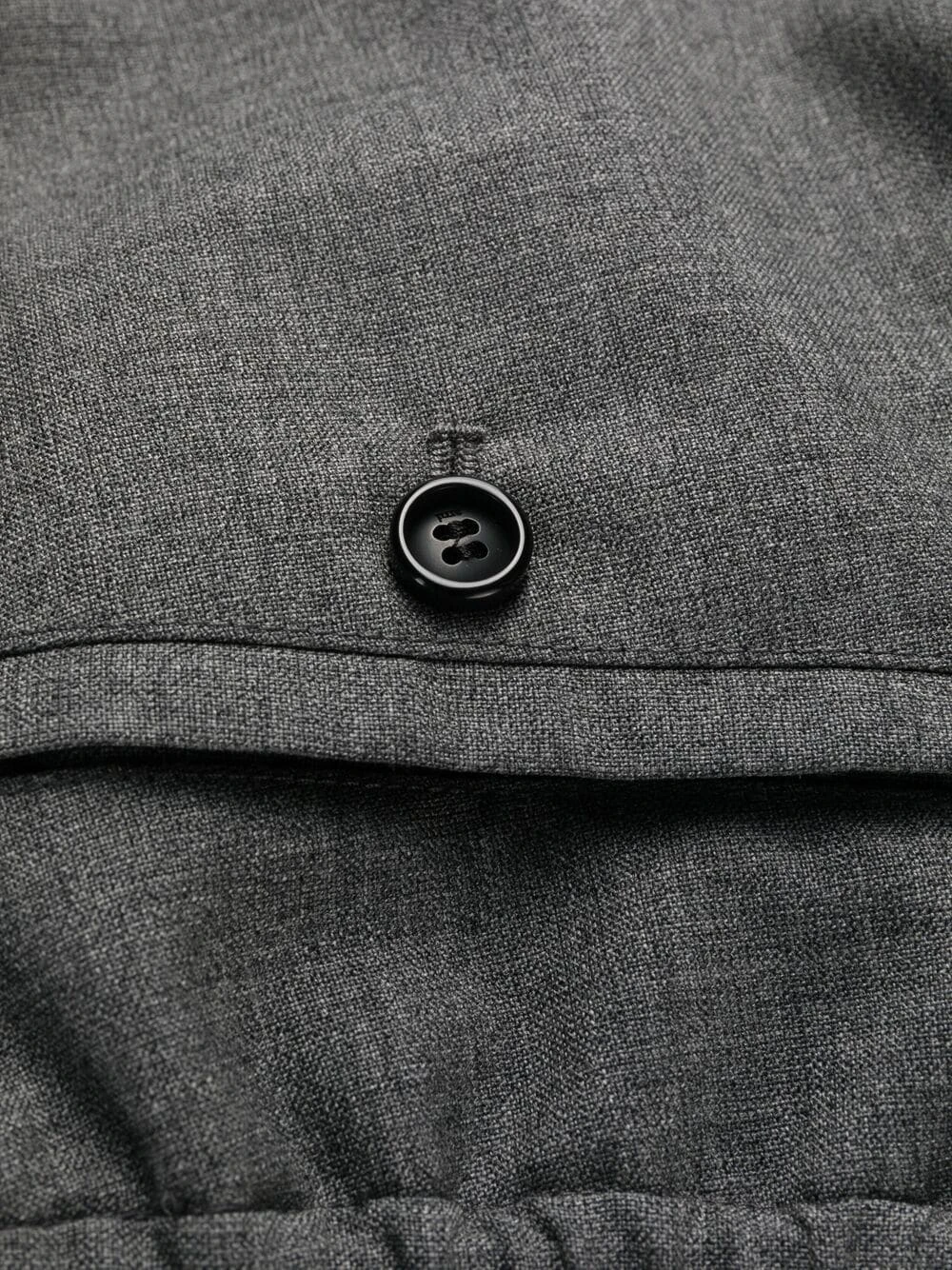 Ceinture élastique, plis marqués, fermeture à zip et boutons sur le devant, deux poches latérales fendues, poches arrière passepoilées, longueur crop. Couleur : gris.