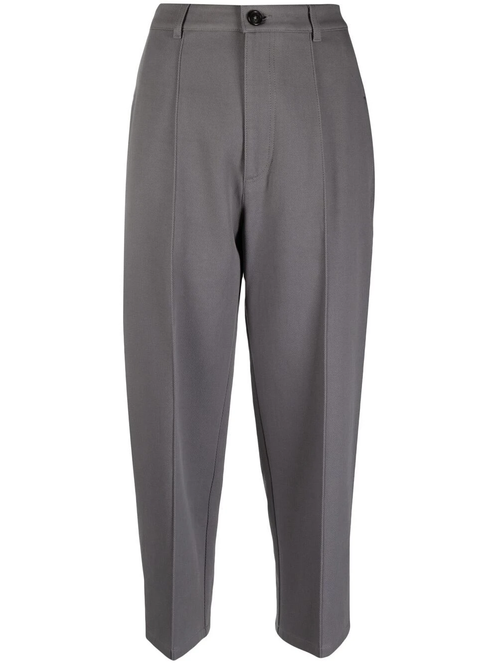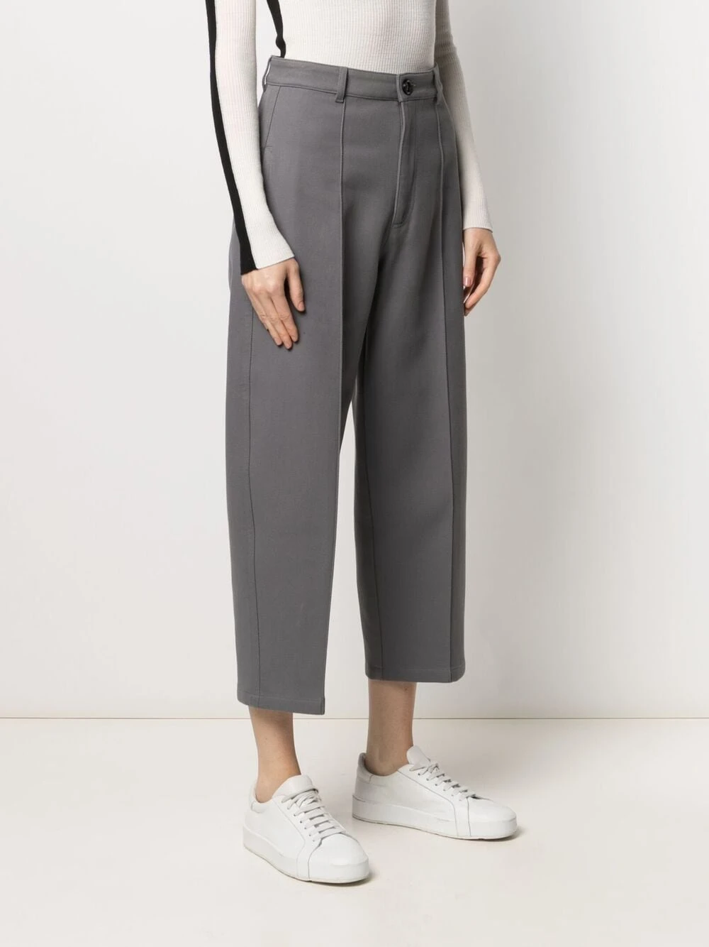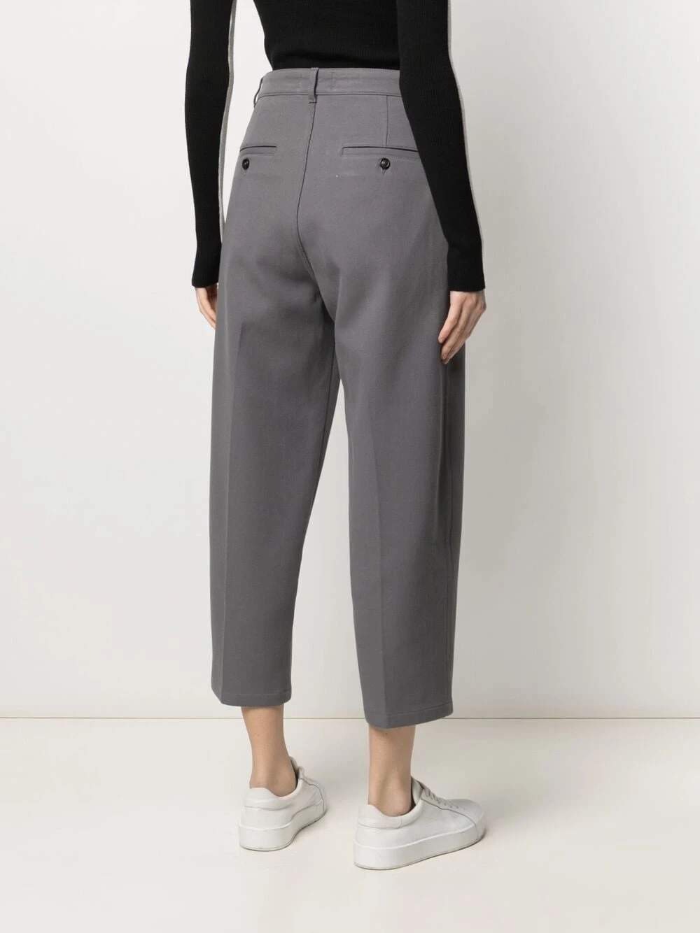 Taille haute, passants de ceinture, fermeture à zip et boutons sur le devant, deux poches latérales fendues, deux poches arrières boutonnées, longueur crop. Couleur : gris. Matière : coton.