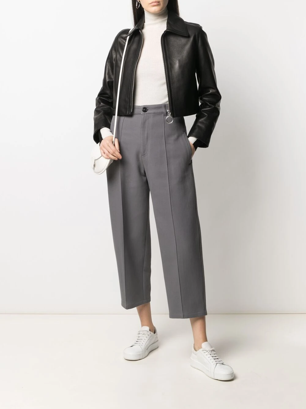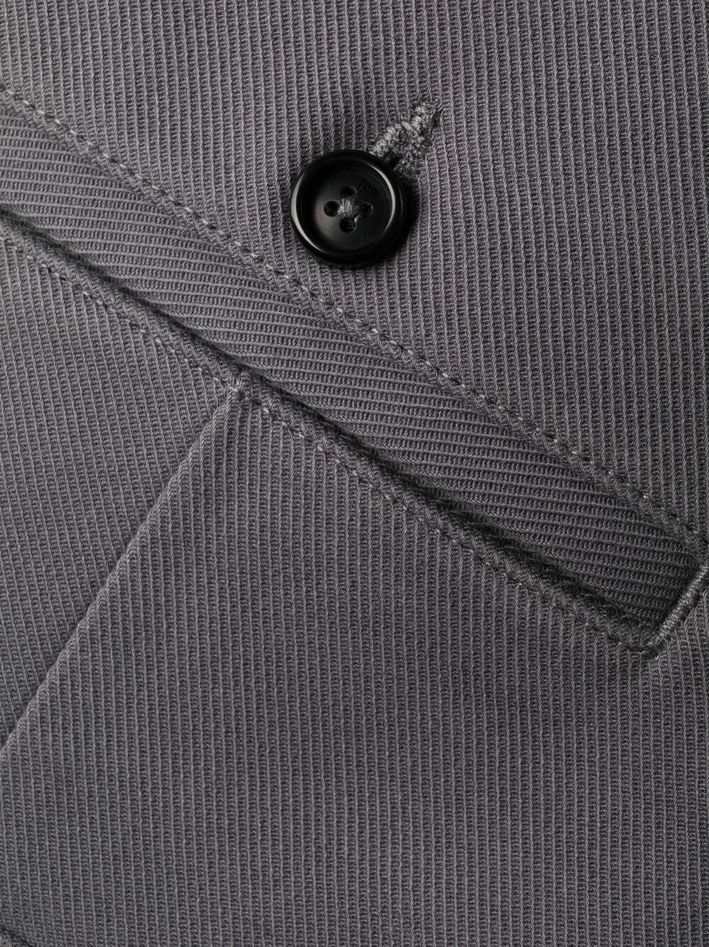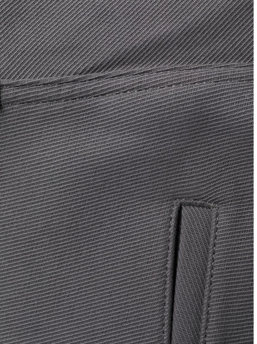 Taille haute, passants de ceinture, fermeture à zip et boutons sur le devant, deux poches latérales fendues, deux poches arrières boutonnées, longueur crop. Couleur : gris. Matière : coton.
