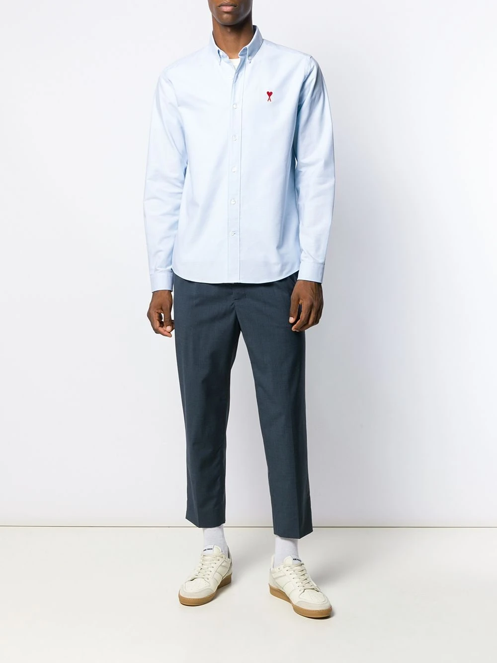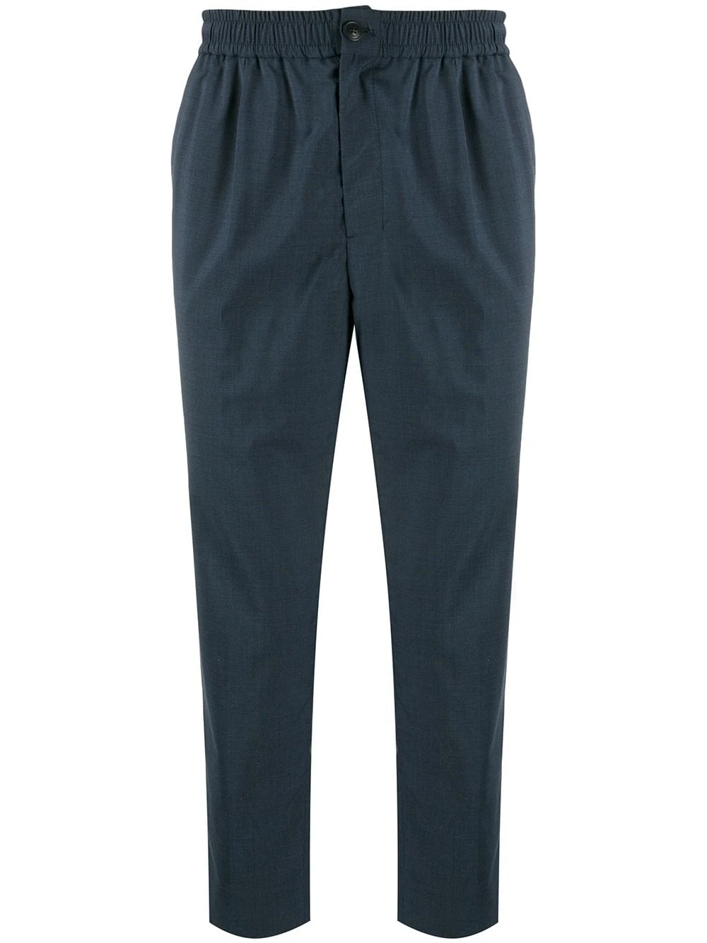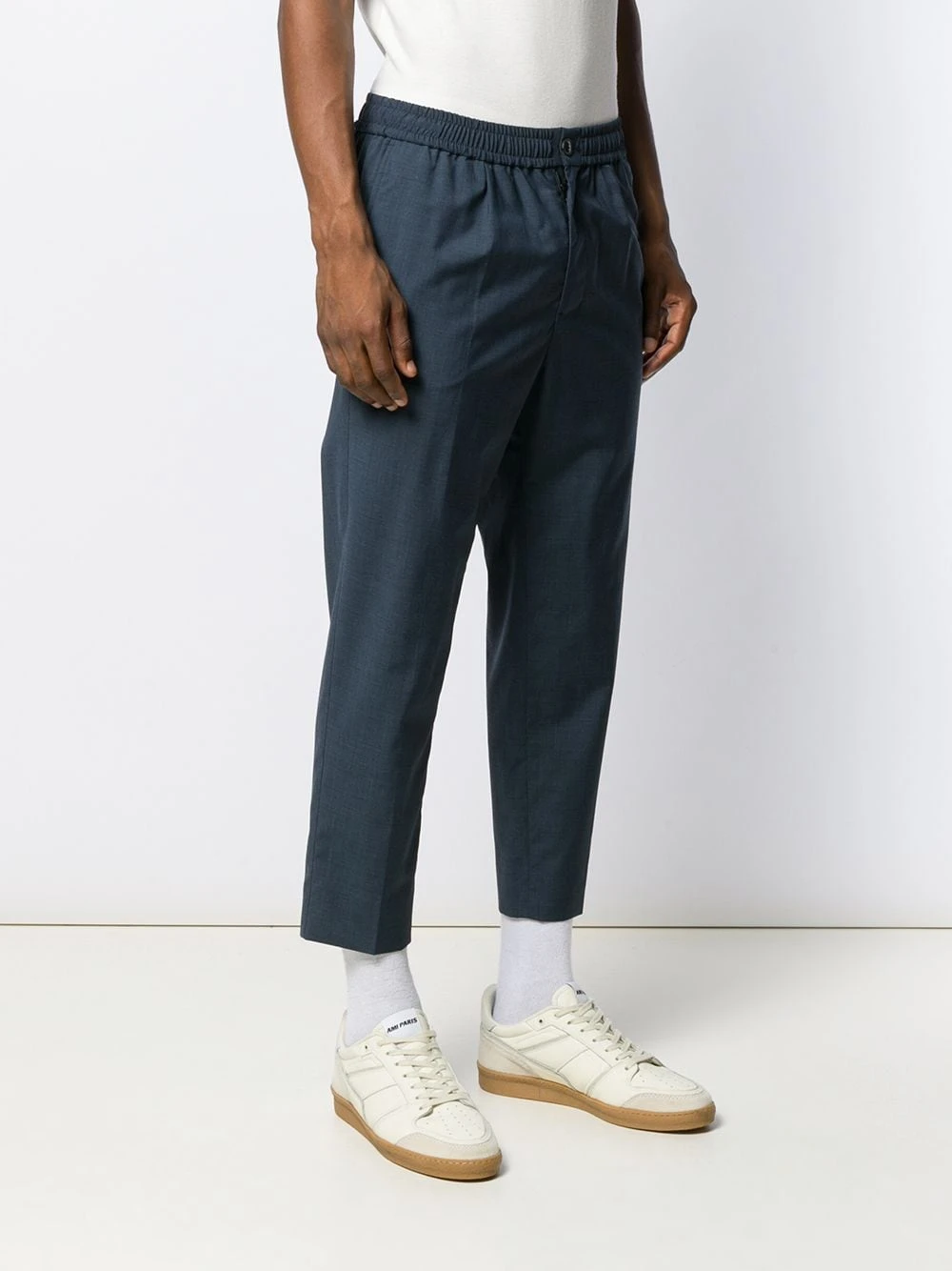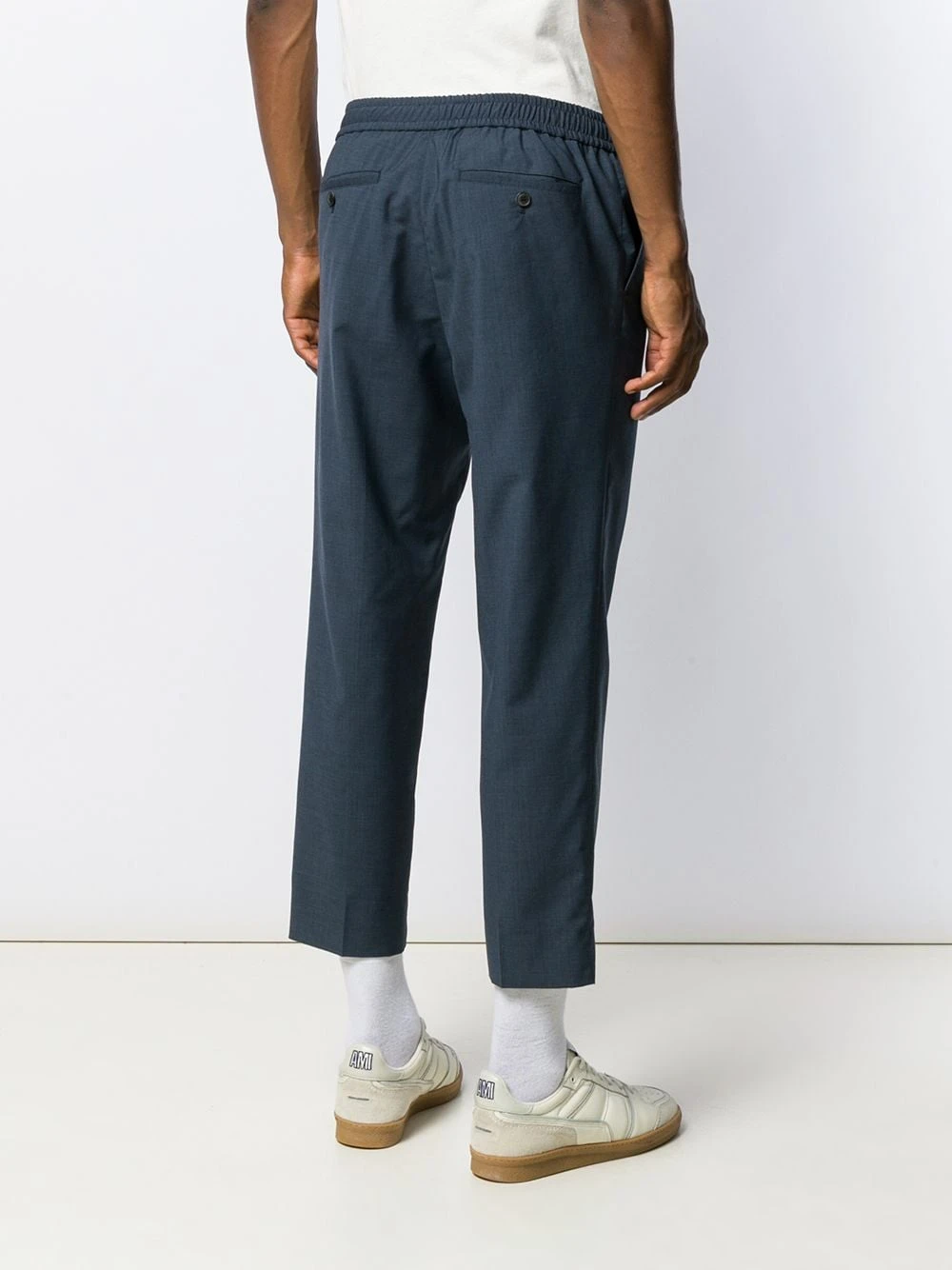 Pantalon cropped taille élastique en coton AMI Alexandre Mattiussi avec ceinture élastique, bouton et zip, poches latérales, deux poches arrière passepoilées et boutonnées et longueur crop.