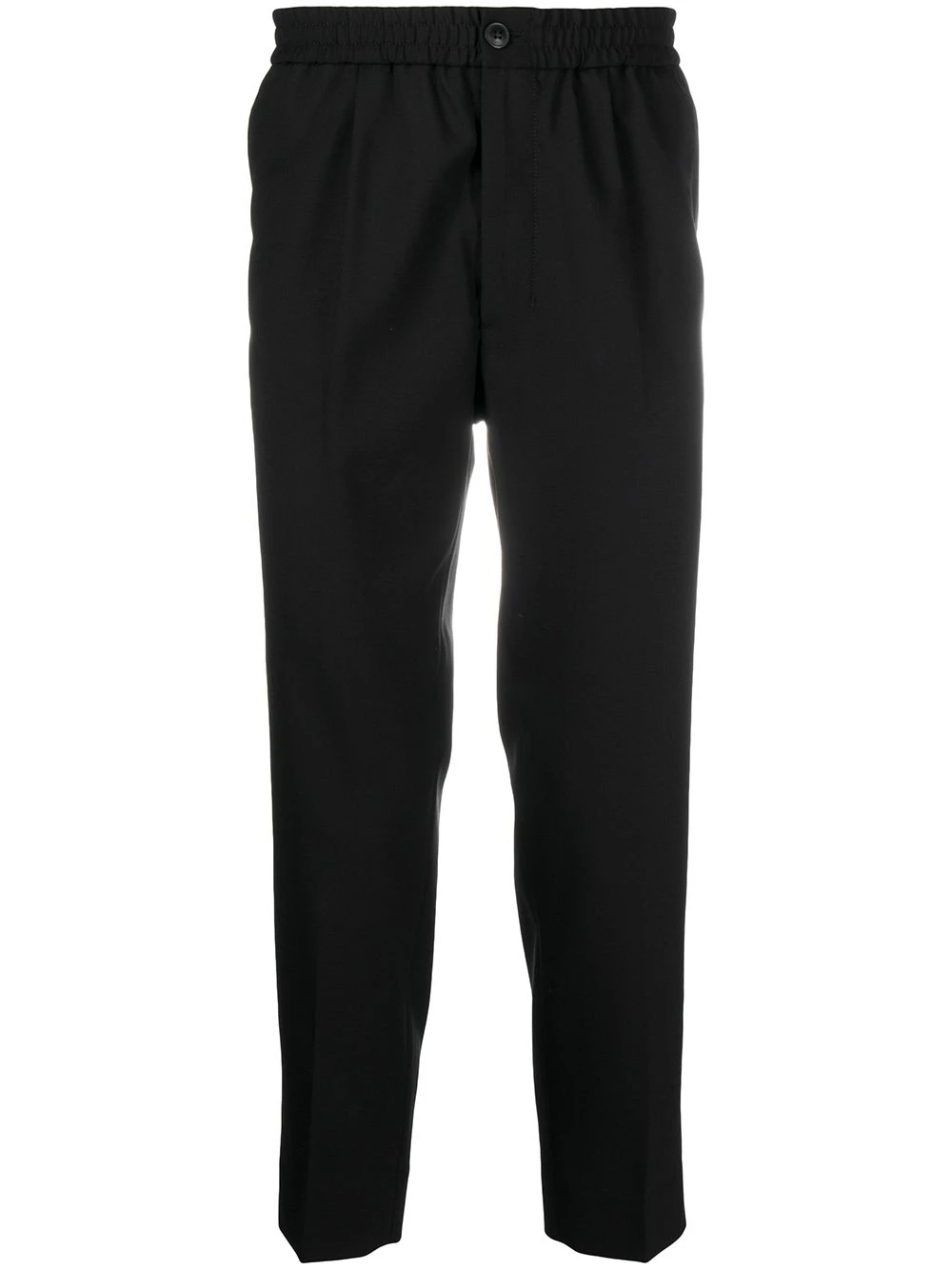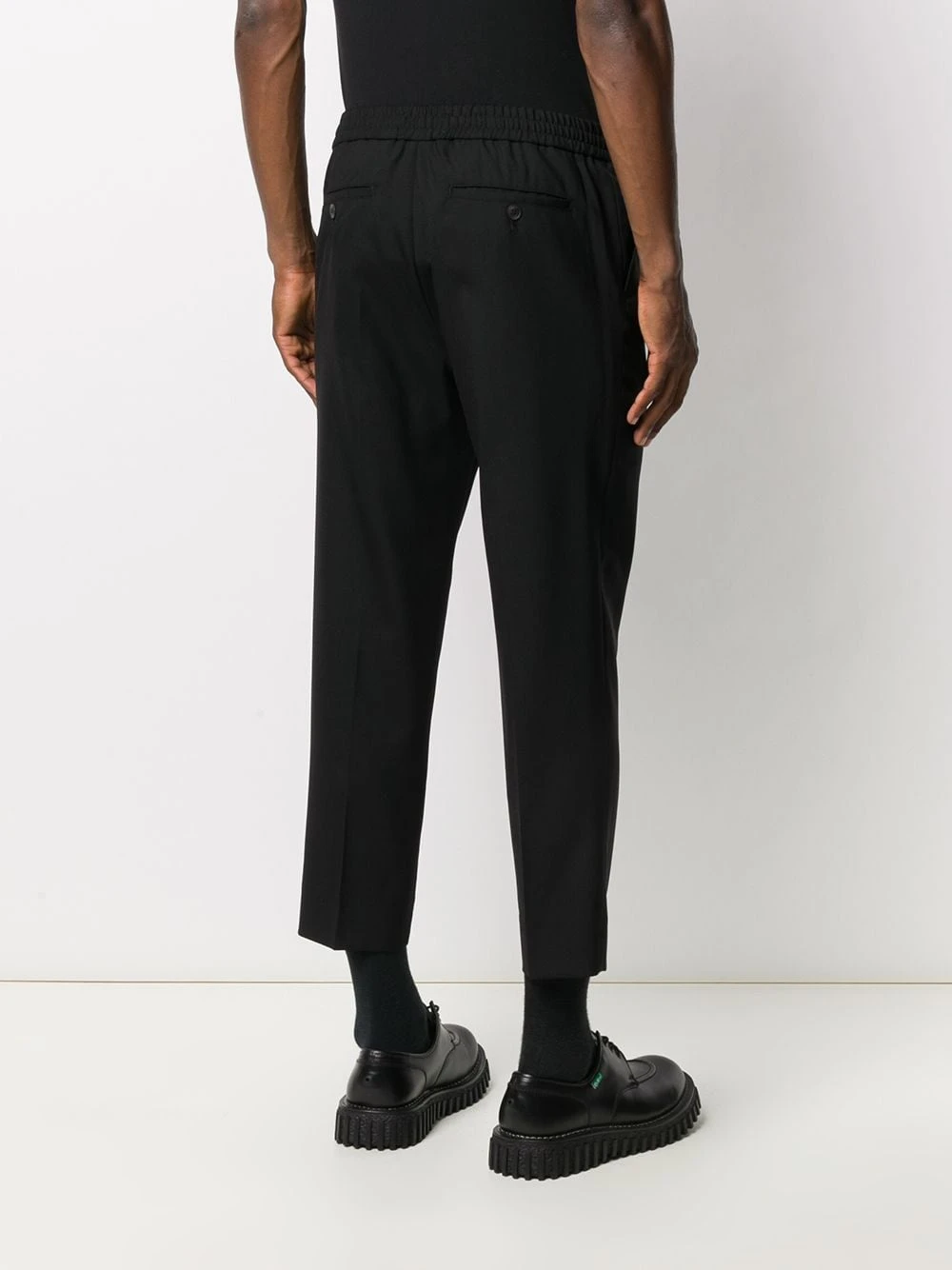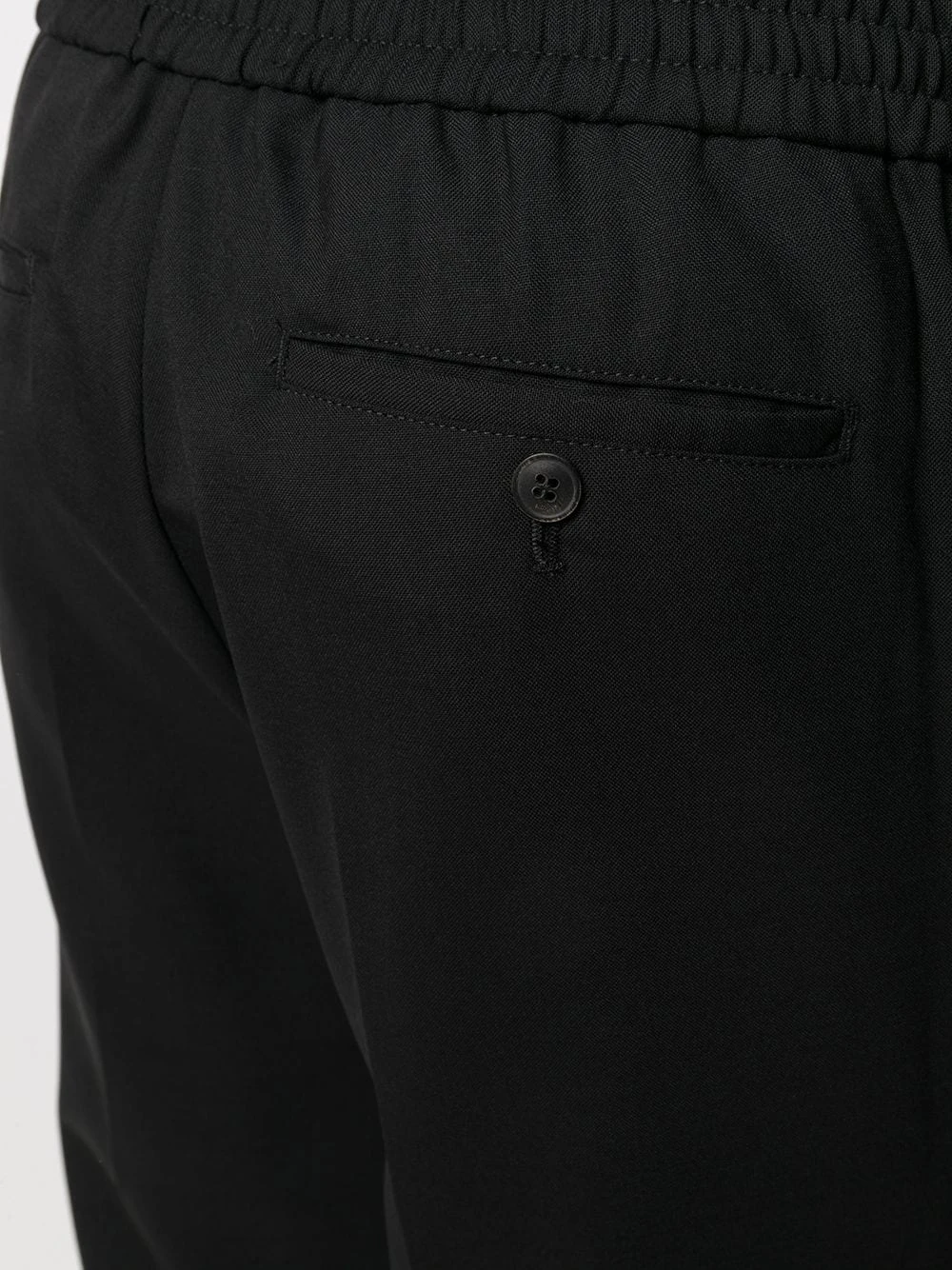 Ceinture élastique, fermeture à zip et boutons sur le devant, deux poches latérales passepoilées. Couleur : noir. Matière : laine vierge.