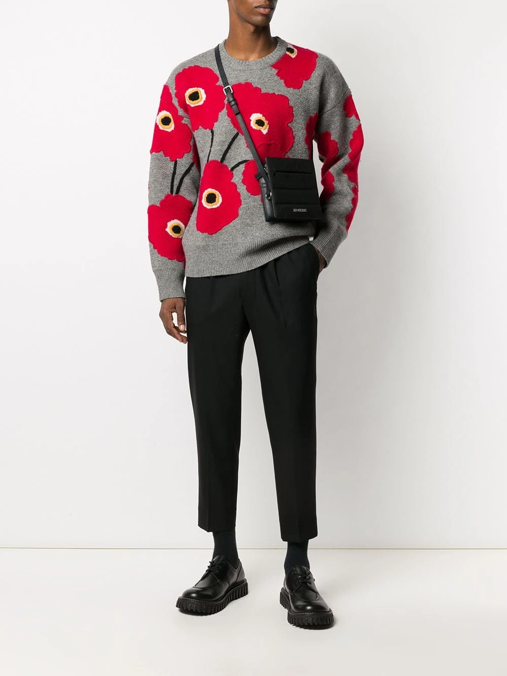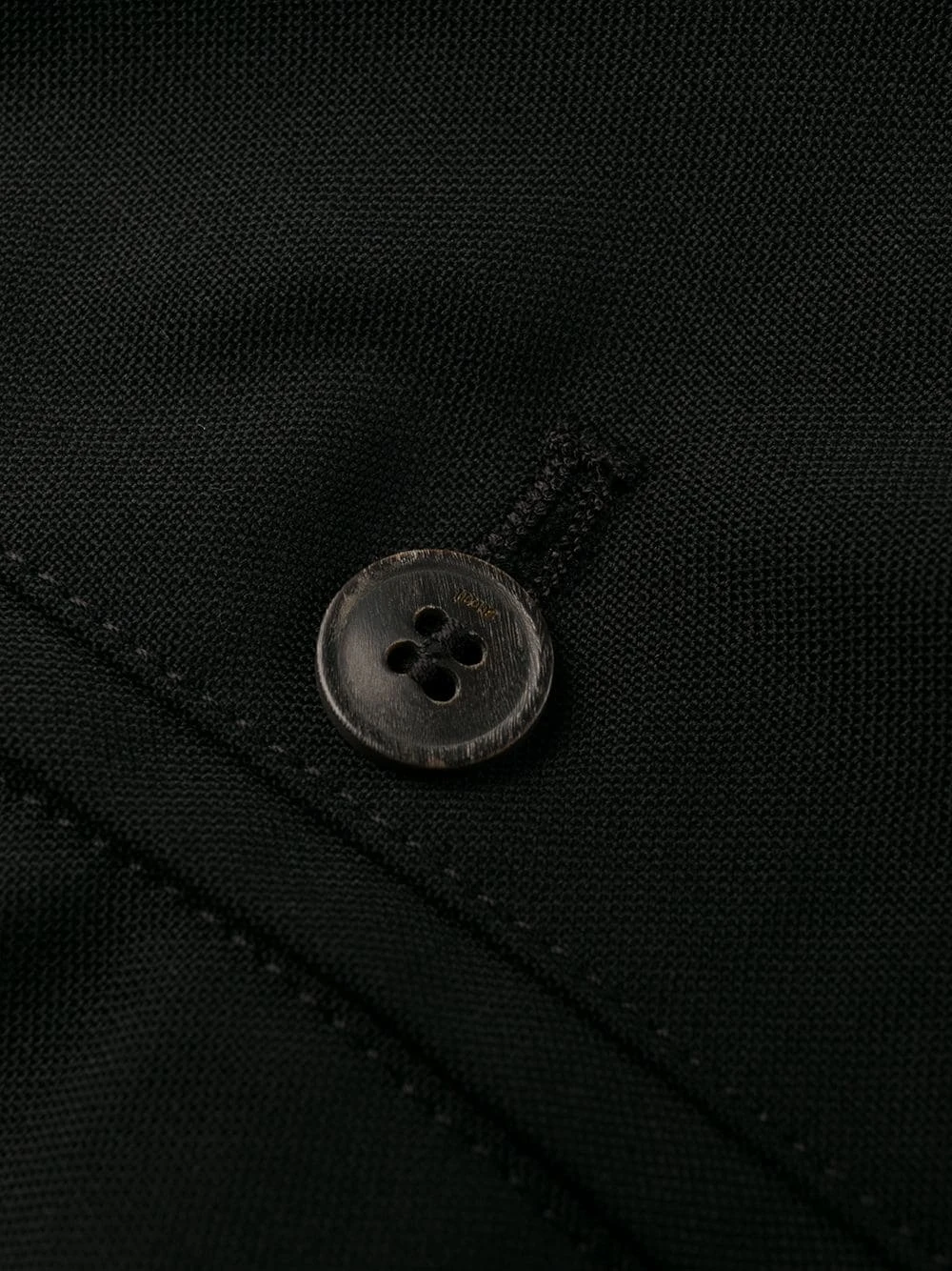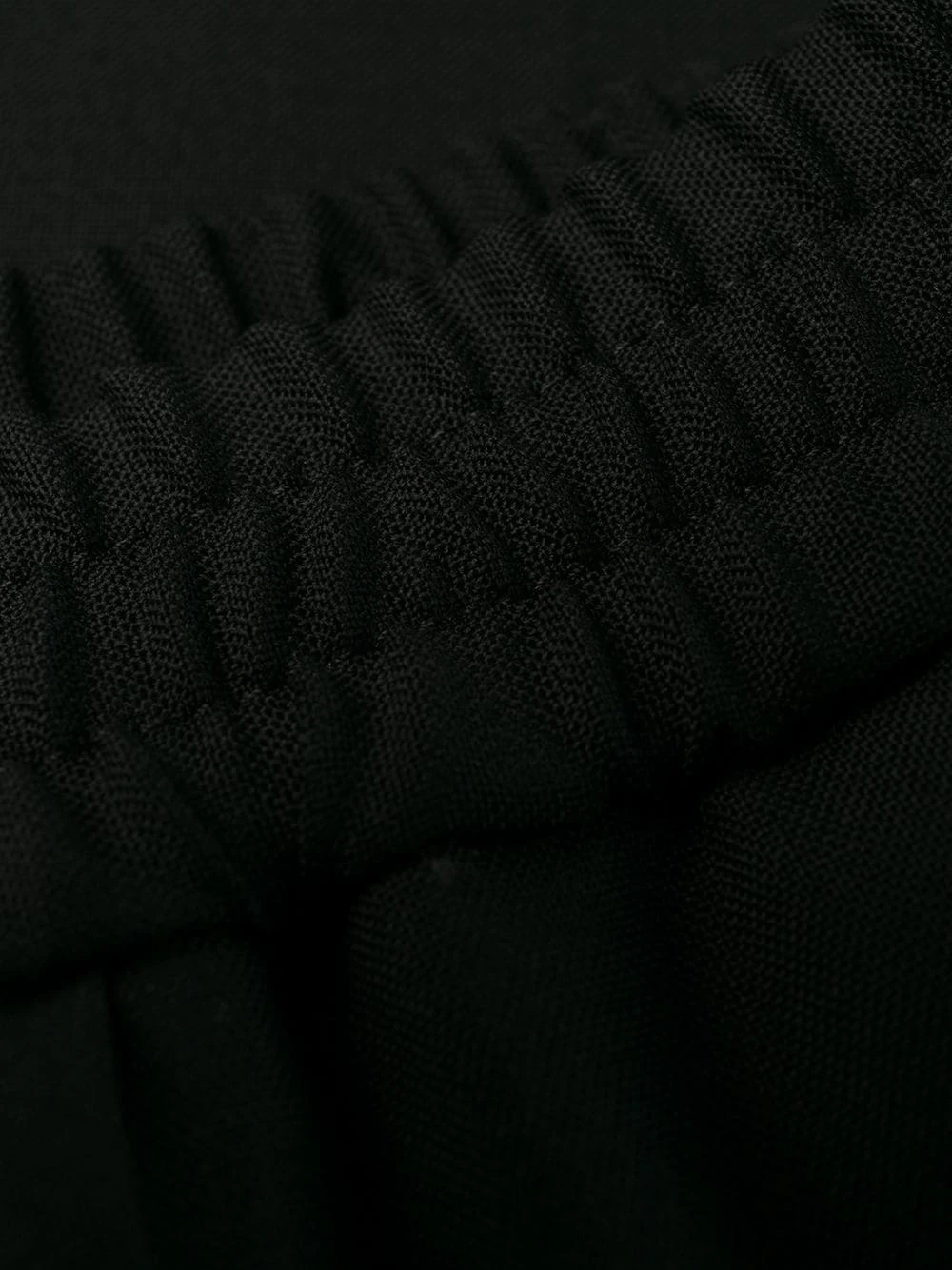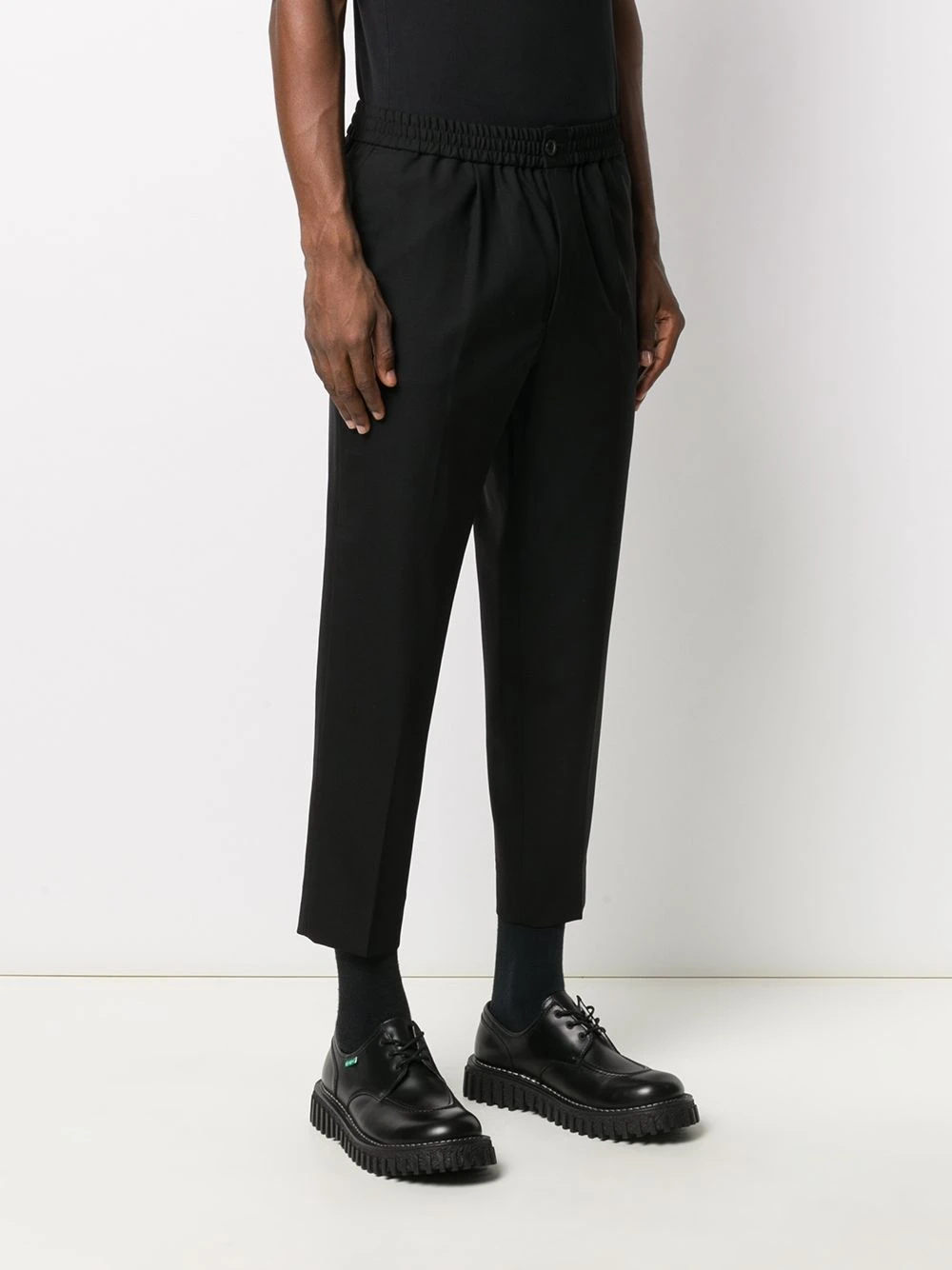 Ceinture élastique, fermeture à zip et boutons sur le devant, deux poches latérales passepoilées. Couleur : noir. Matière : laine vierge.