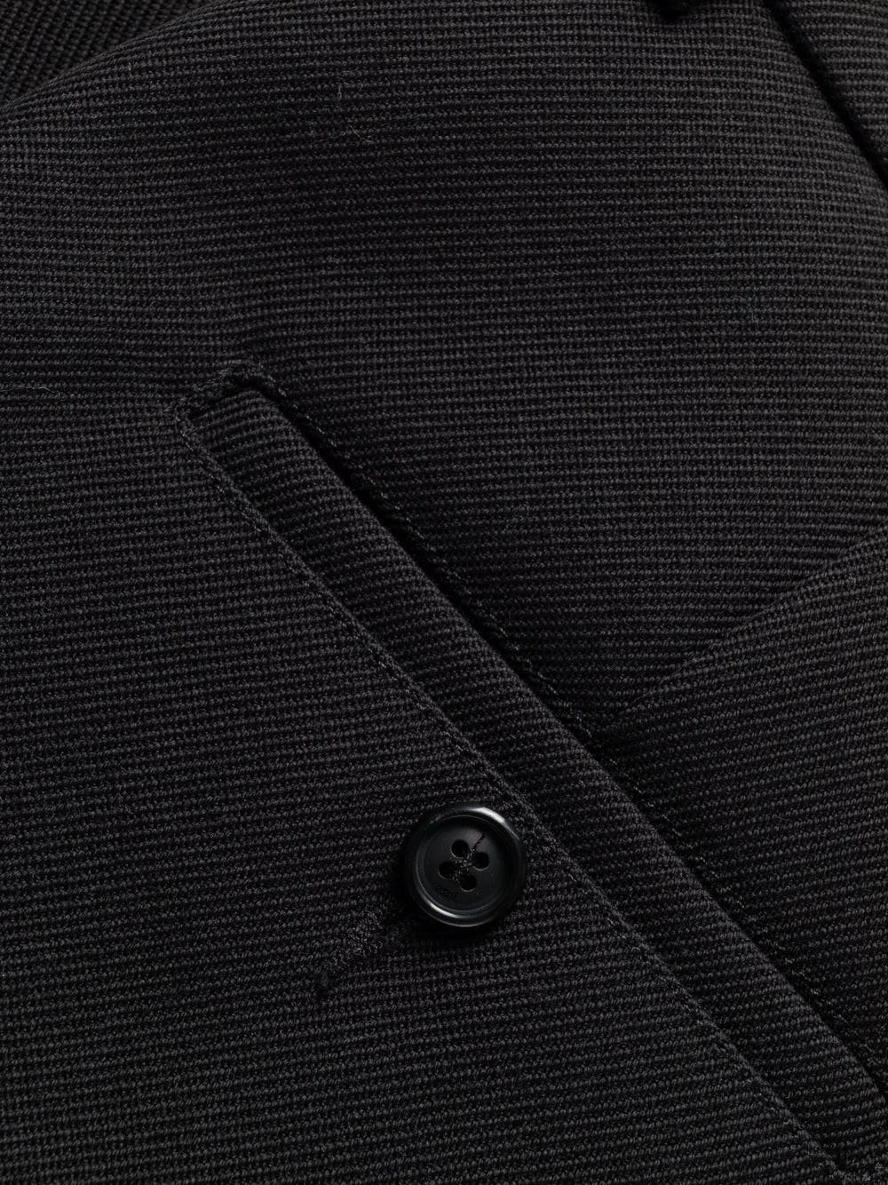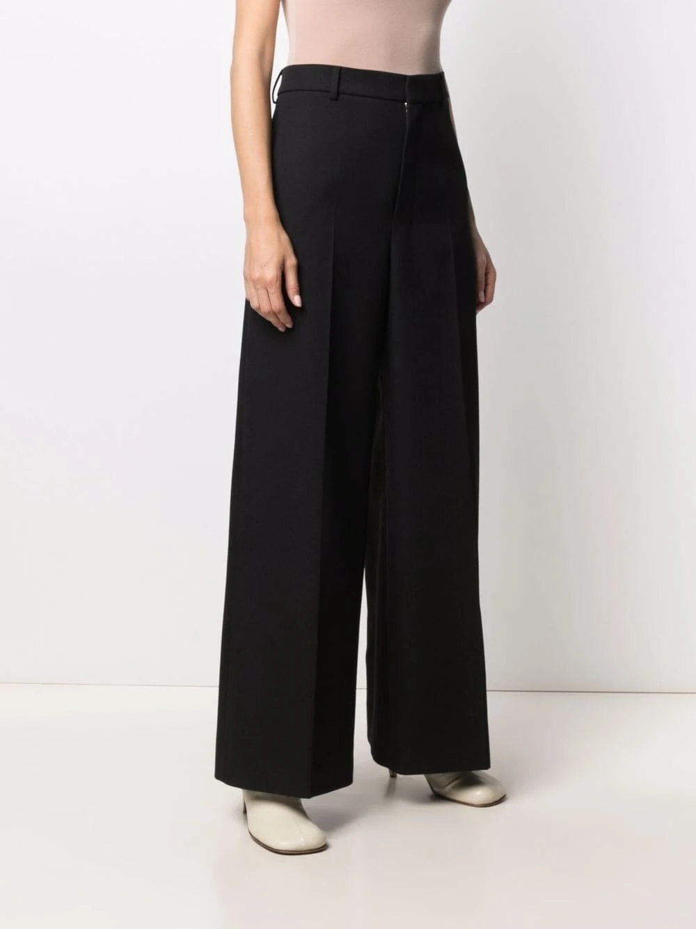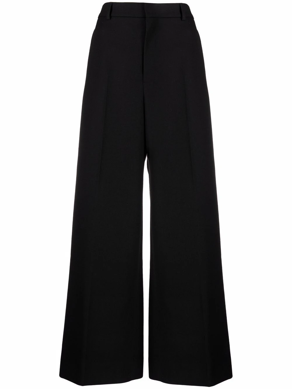 Taille haute, passants de ceinture, fermeture dissimulée sur le devant, poches latérales fendues, deux poches arrières boutonnées, coupe ample. Couleur : noir. Matière : laine vierge.