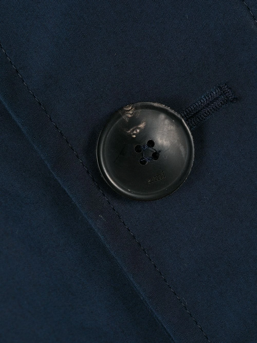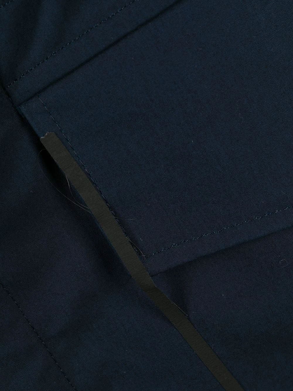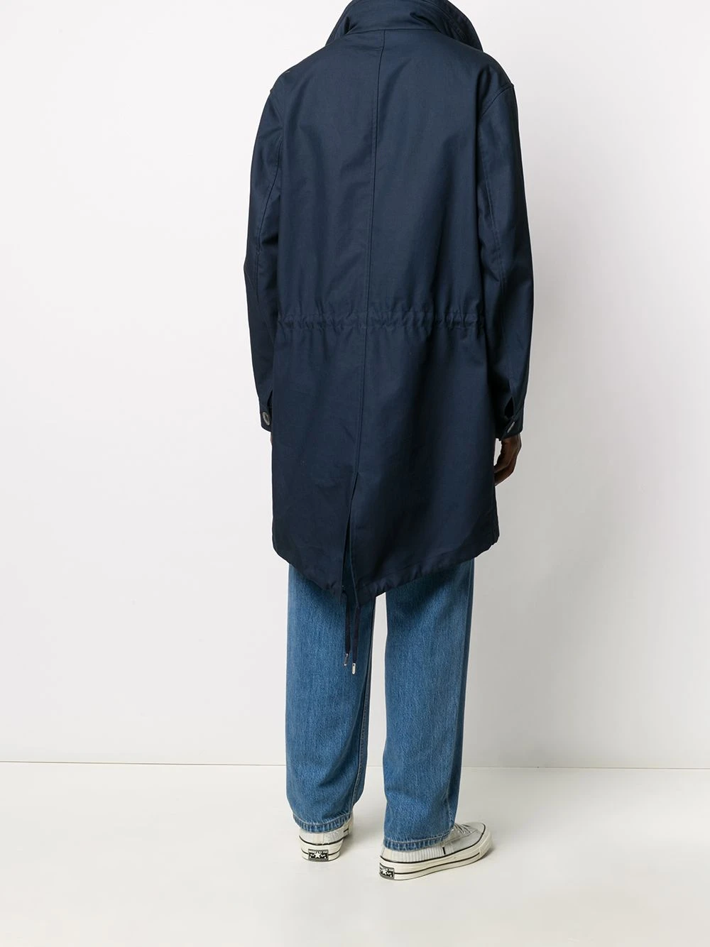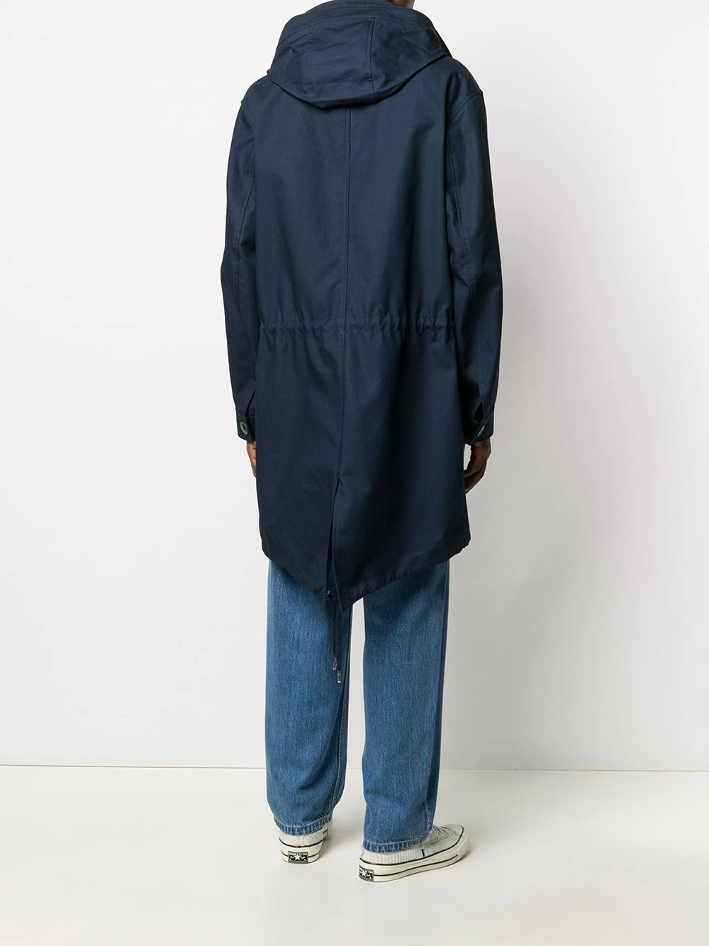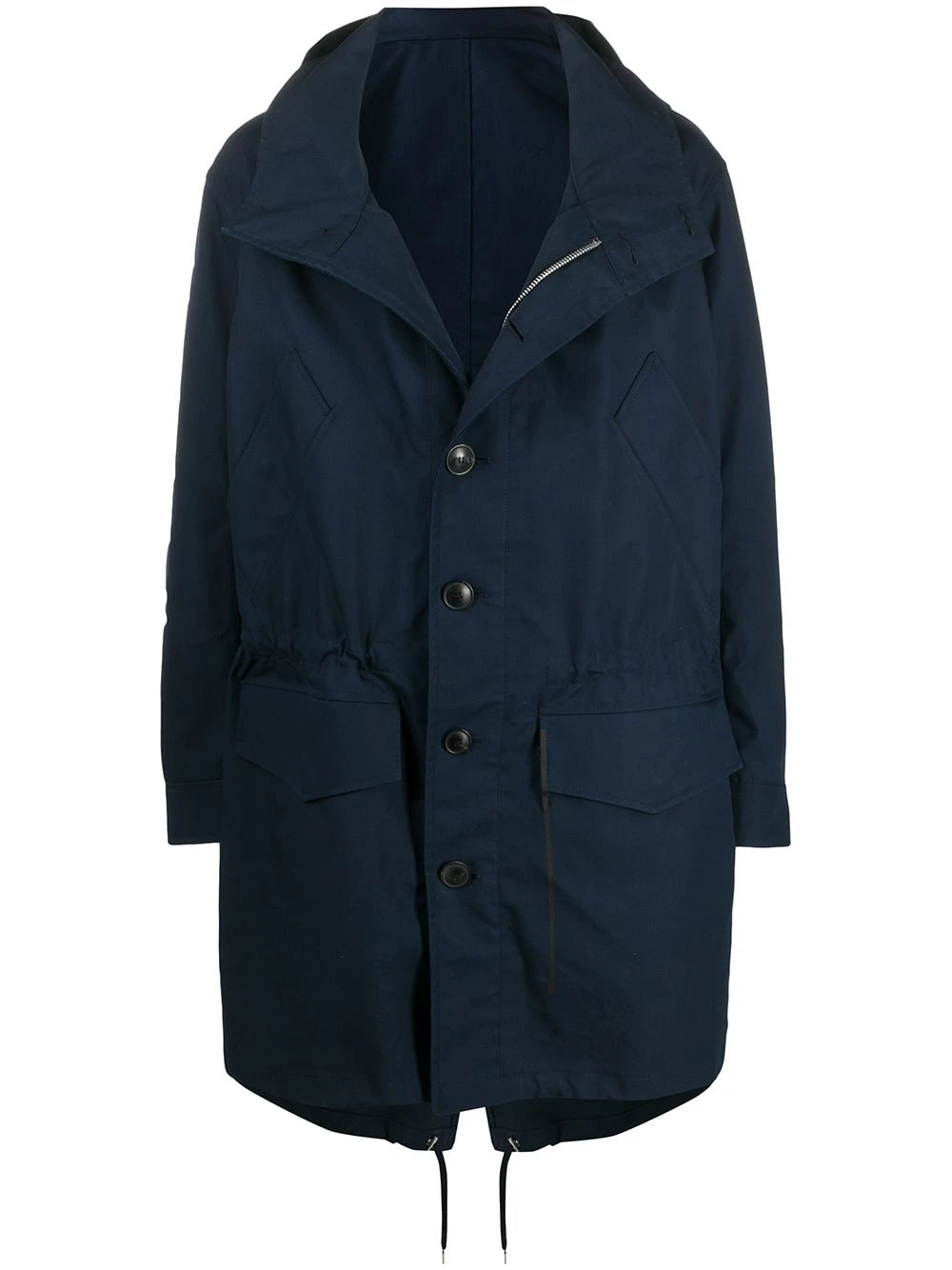 Capuche détachable, taille à lien de resserrage, fermeture à zip et boutons sur le devant, poignets boutonnés, manches longues, deux poches plaquées avant, deux poches poitrine passepoilées, fente arrière. Couleur : bleu.
