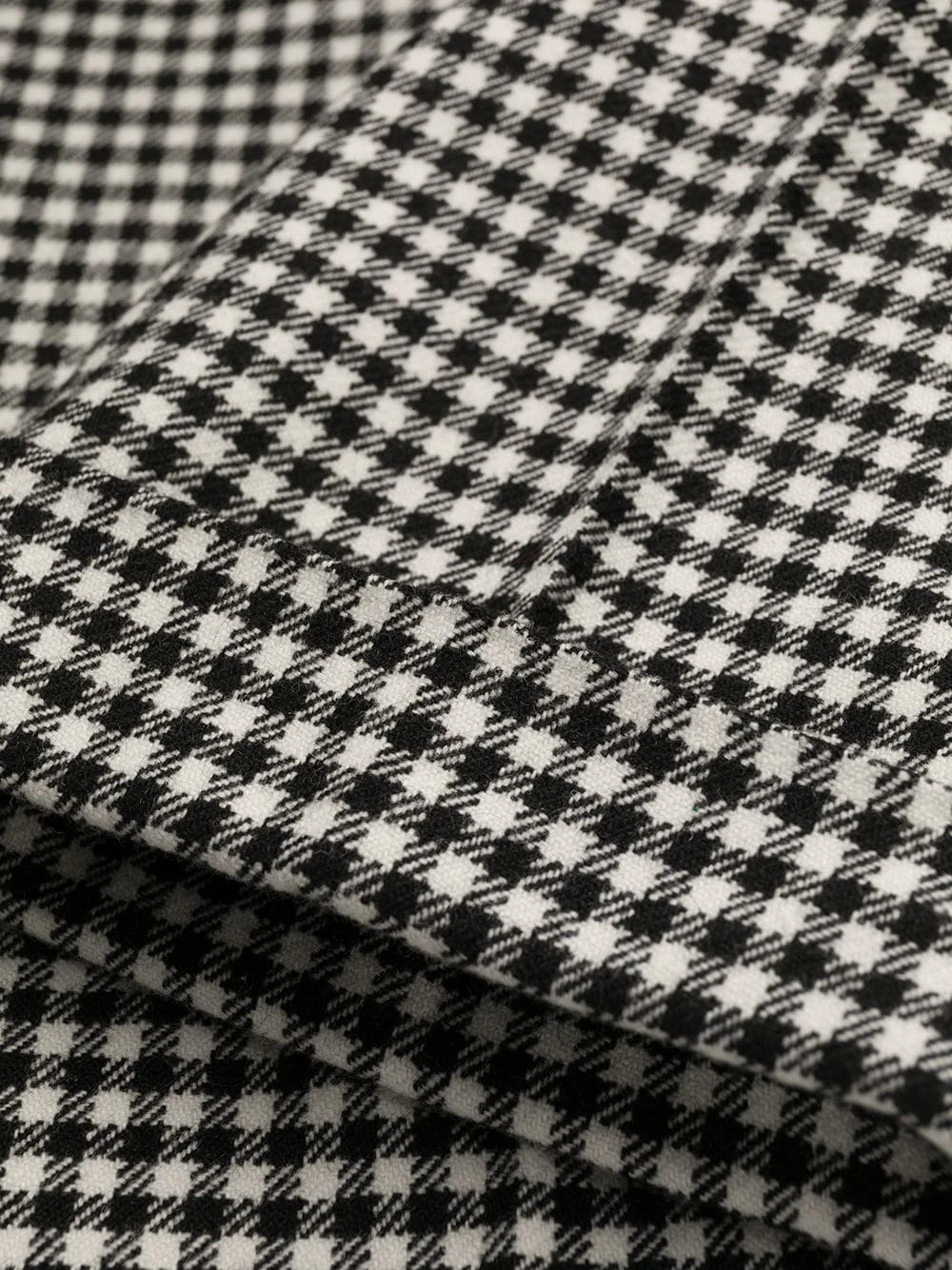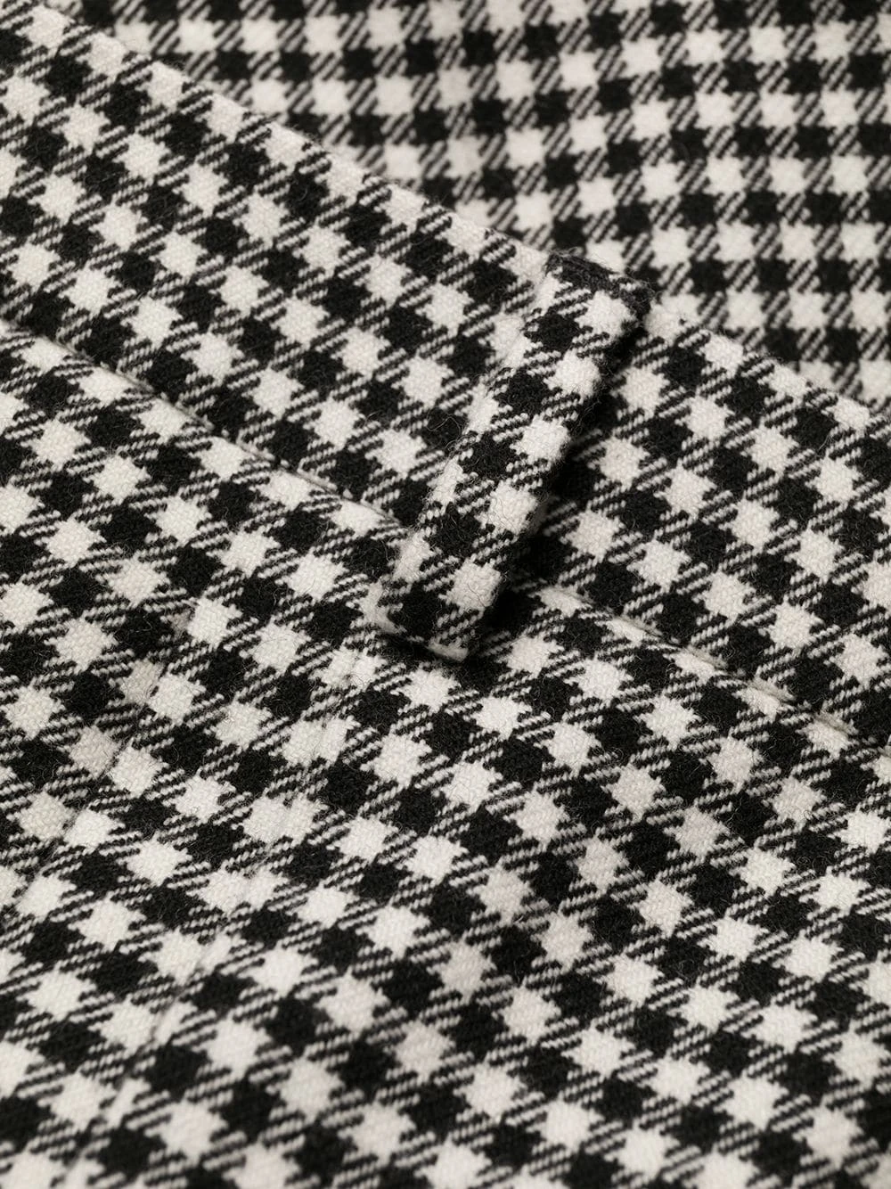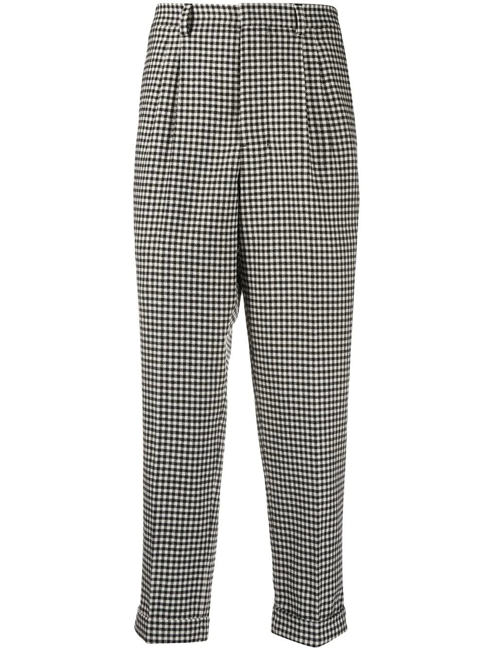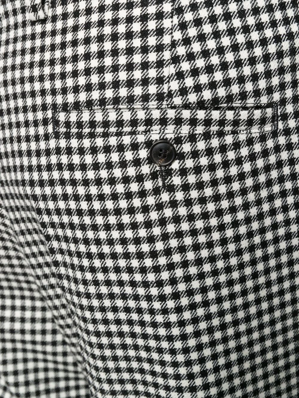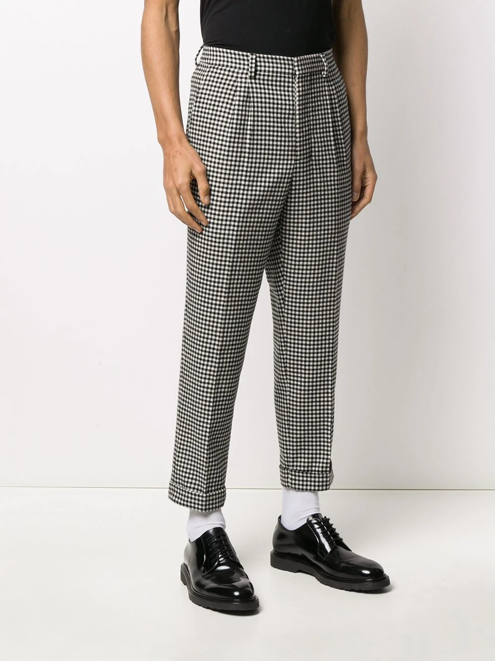 Pantalon fuselé à carreaux AMI Paris avec motif à carreaux, longueur crop, ourlet retroussé, boutonnière sur le devant, passants de ceinture à la taille, deux poches arrière passepoilées et boutonnées et détails plissés.