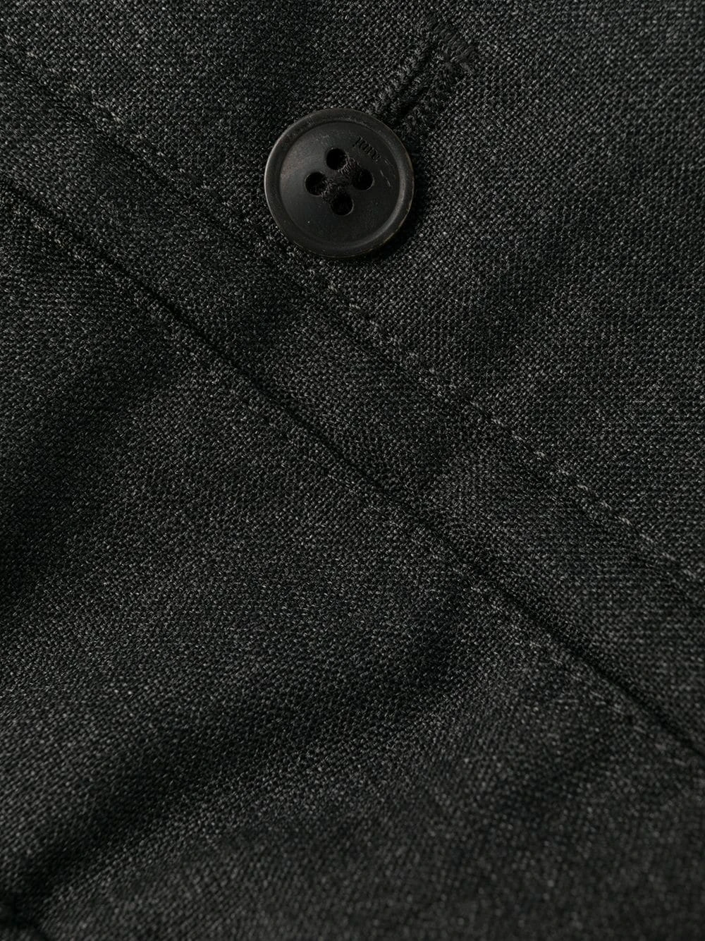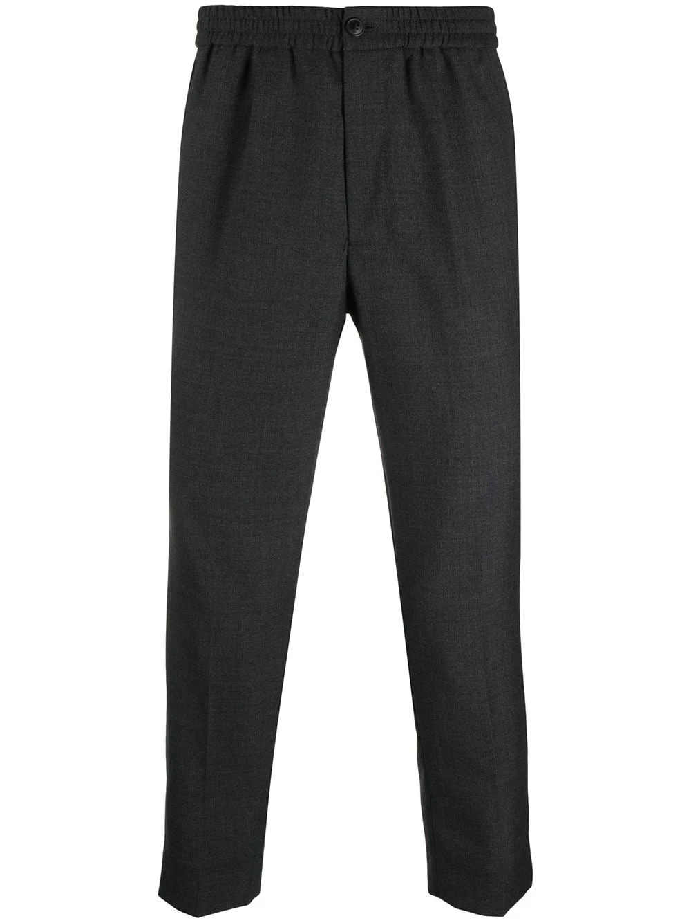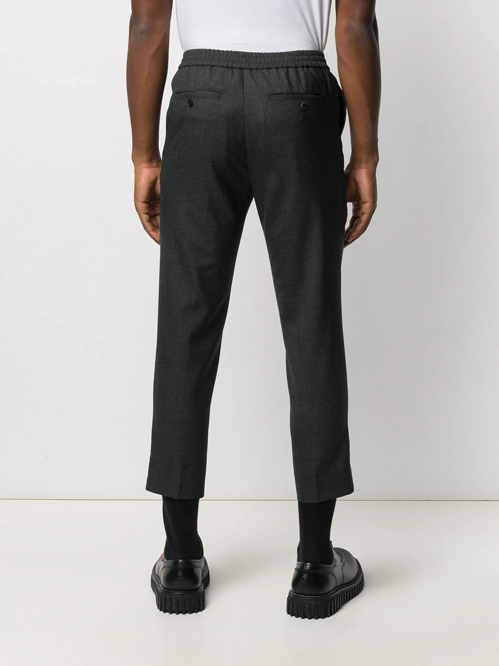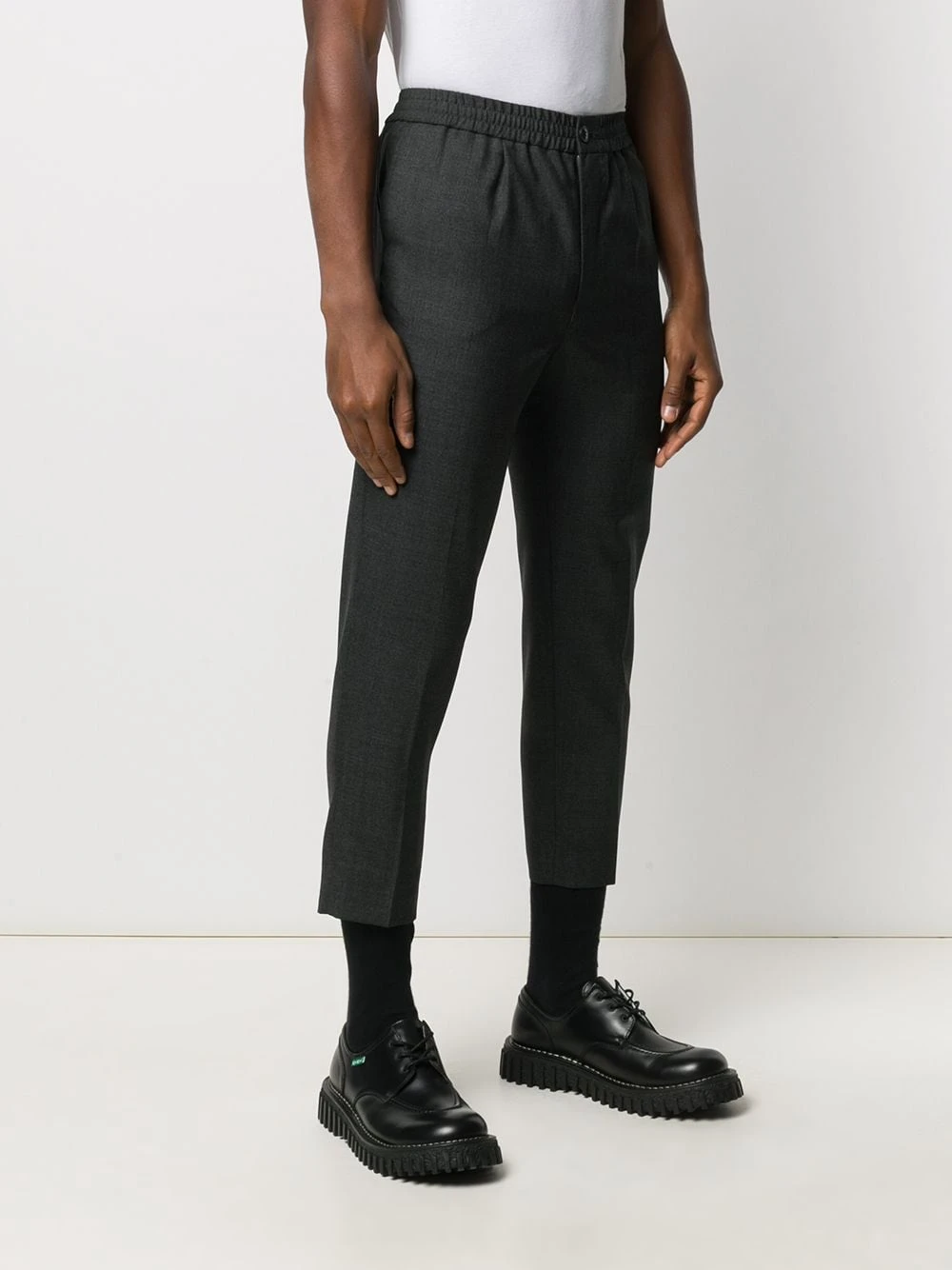 Ceinture élastique, fermeture à zip et boutons sur le devant, deux poches latérales passepoilées, deux poches arrières boutonnées, longueur crop, coupe classique. Couleur : noir. Matière : laine vierge.