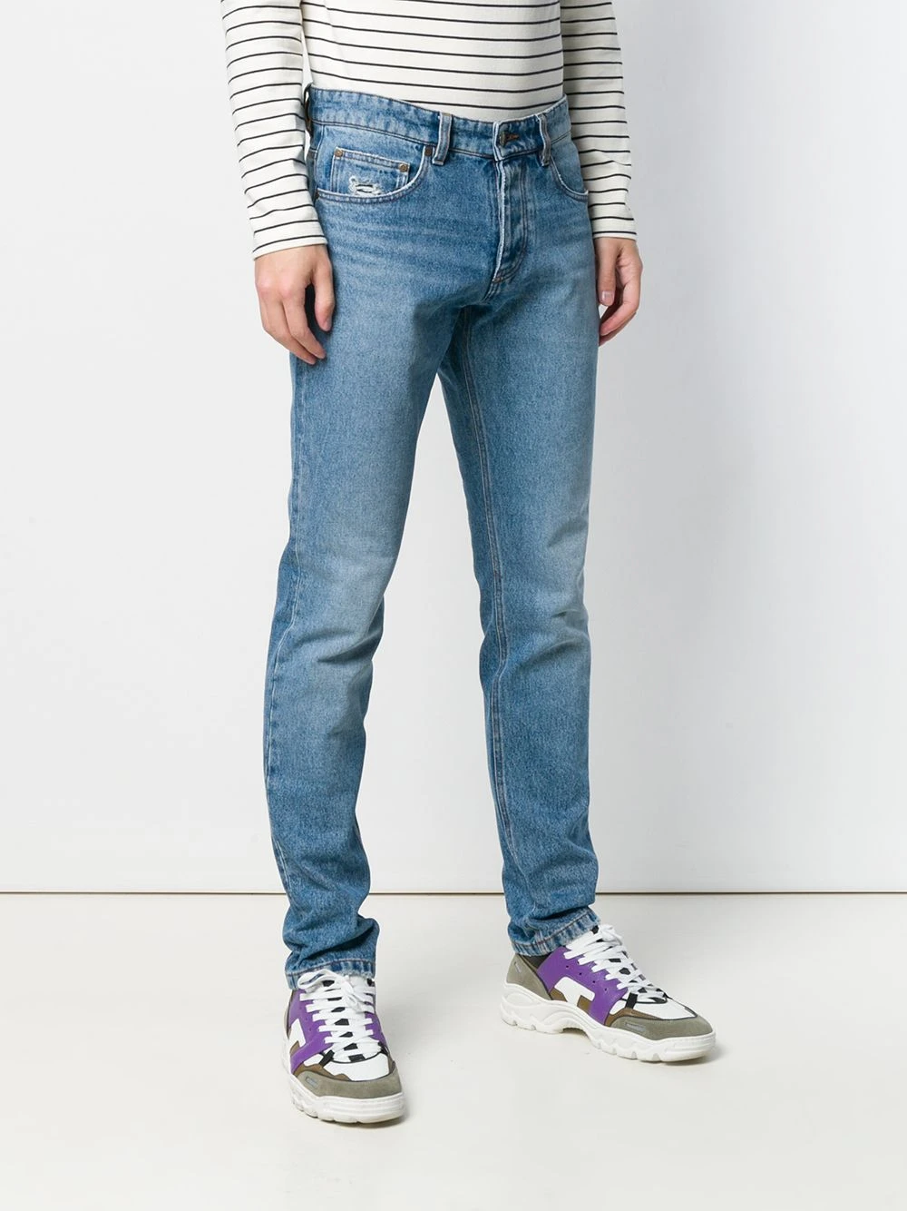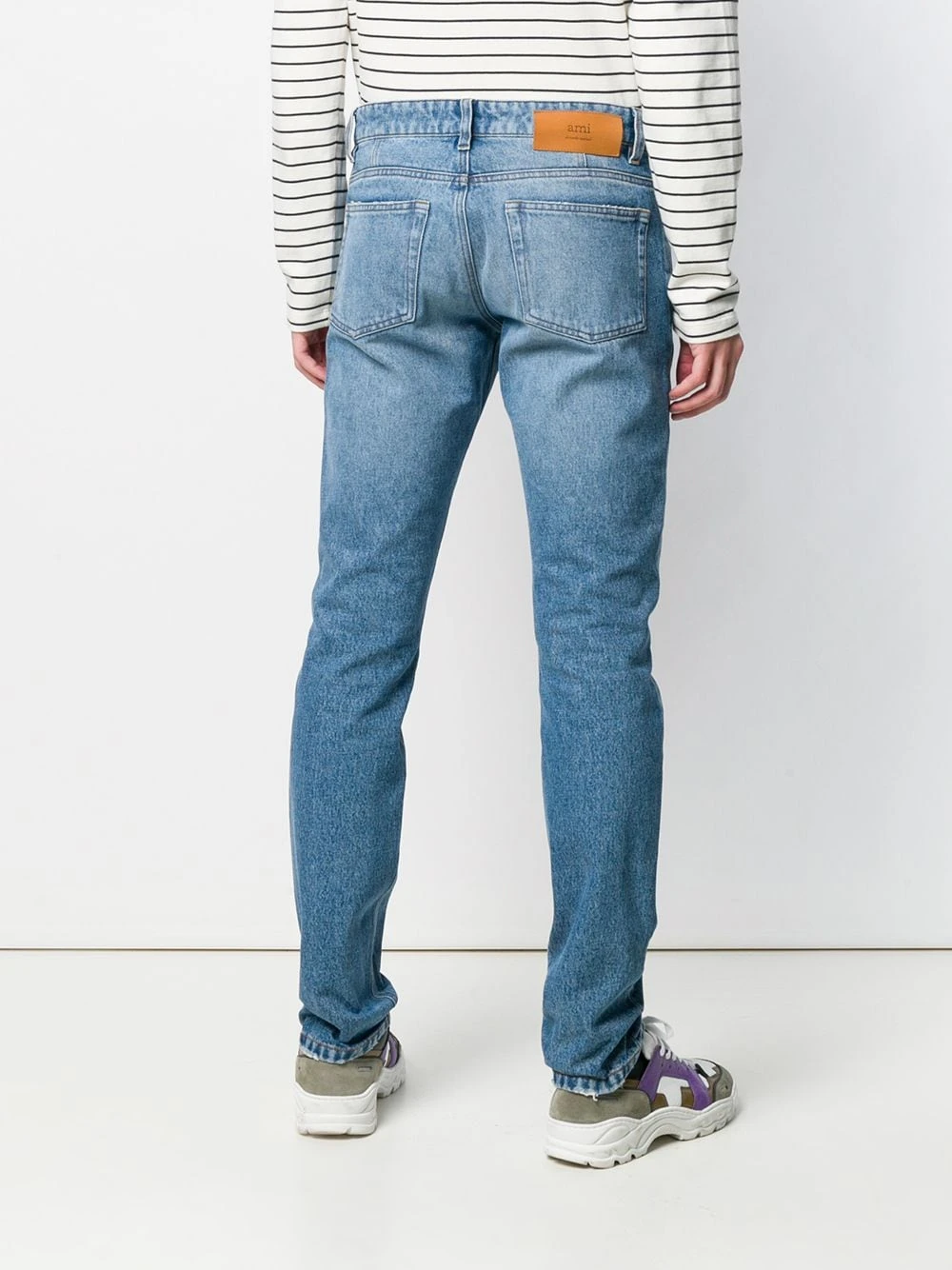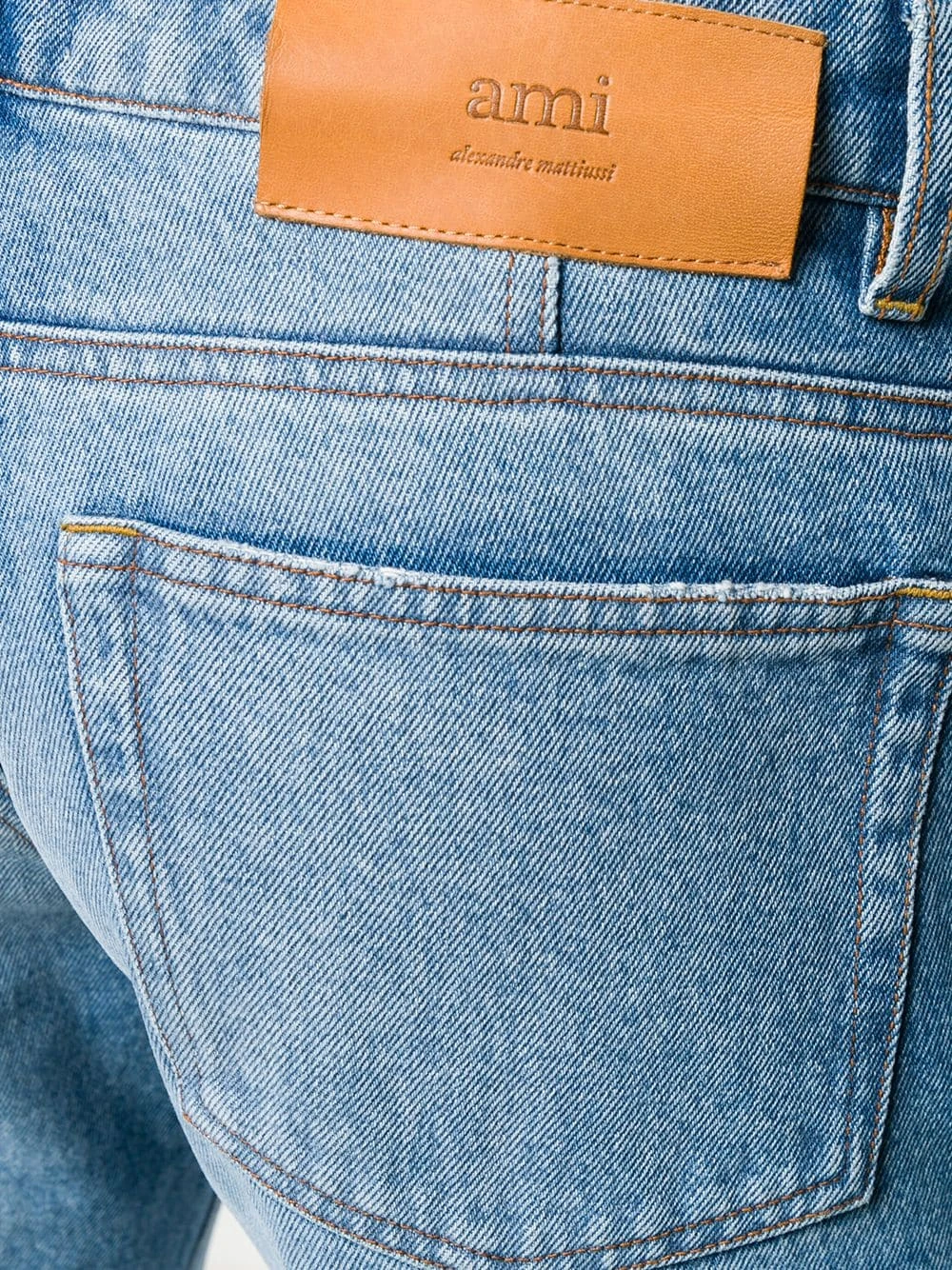 Jean Ami en coton AMI Alexandre Mattiussi avec taille normale, passants de ceinture à la taille, bouton et zip, coupe slim, coupe classique cinq poches et patch logo en cuir sur l’arrière.