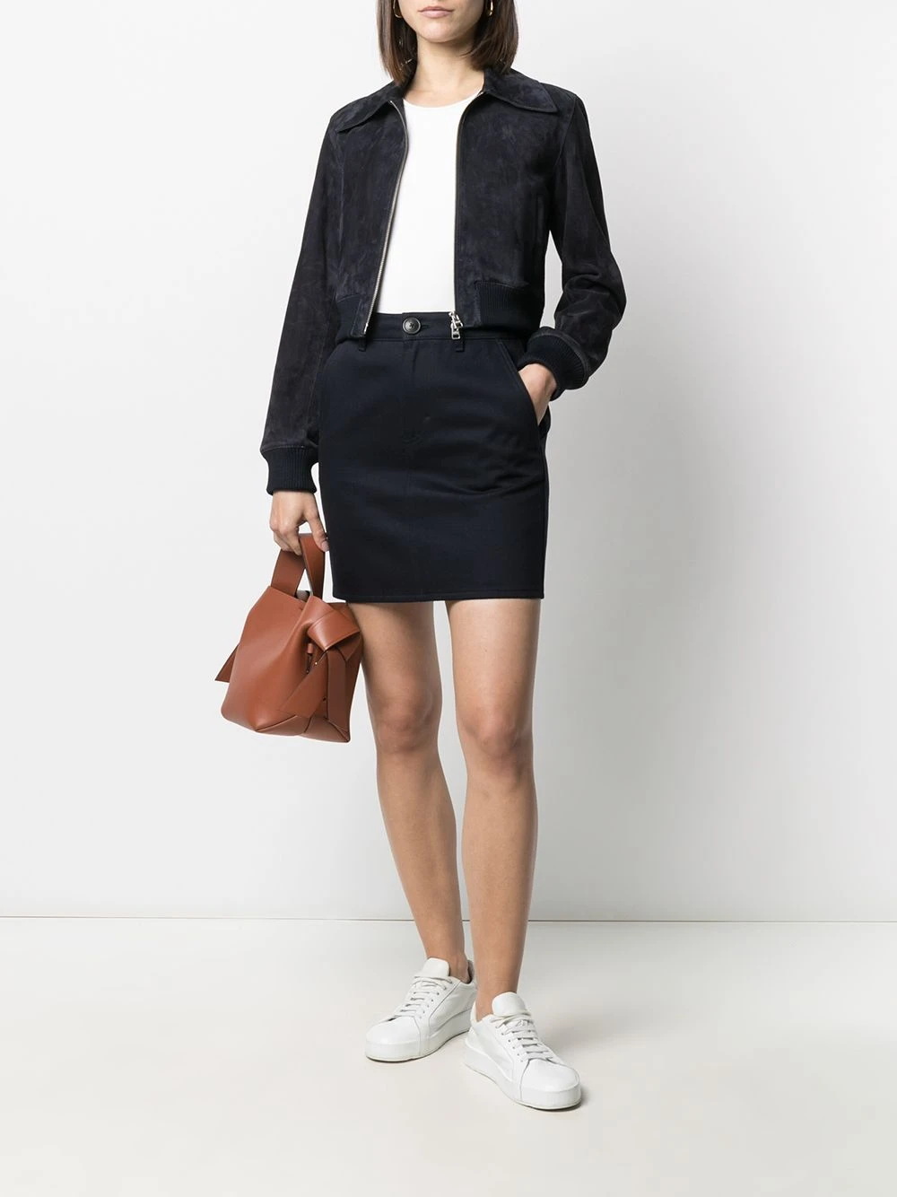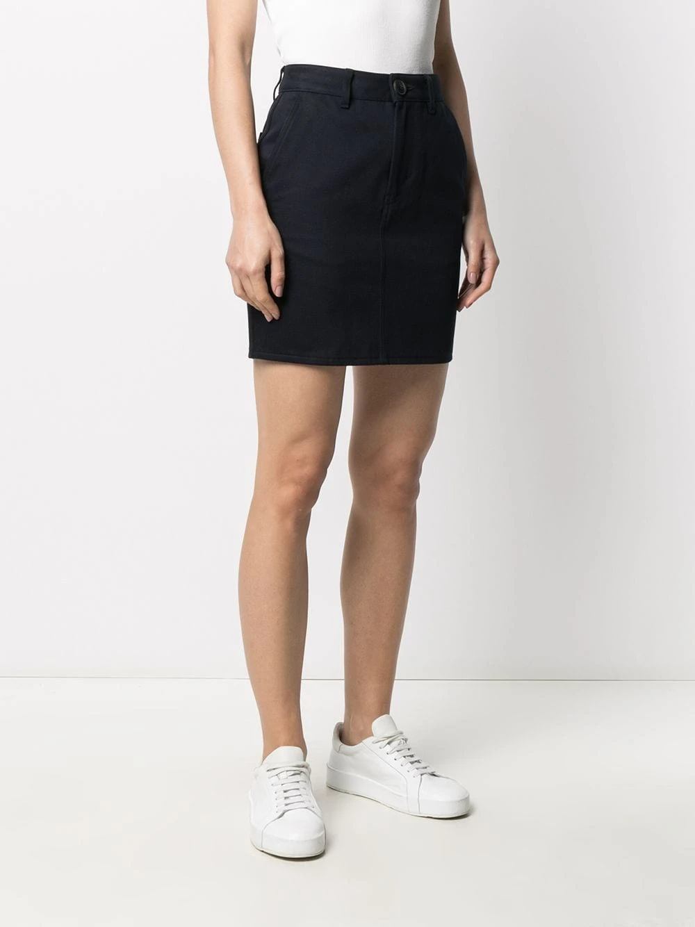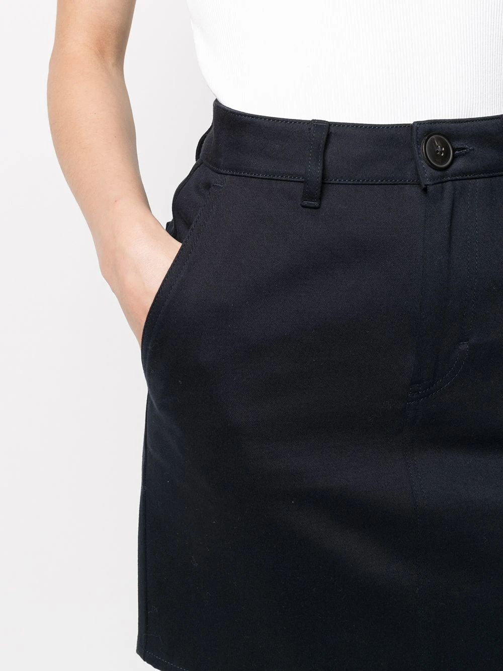 Taille haute, passants de ceinture, boutonnière dissimulée sur le devant, poches plaquées latérales, silhouette ajustée, coupe courte. Matière : coton.
