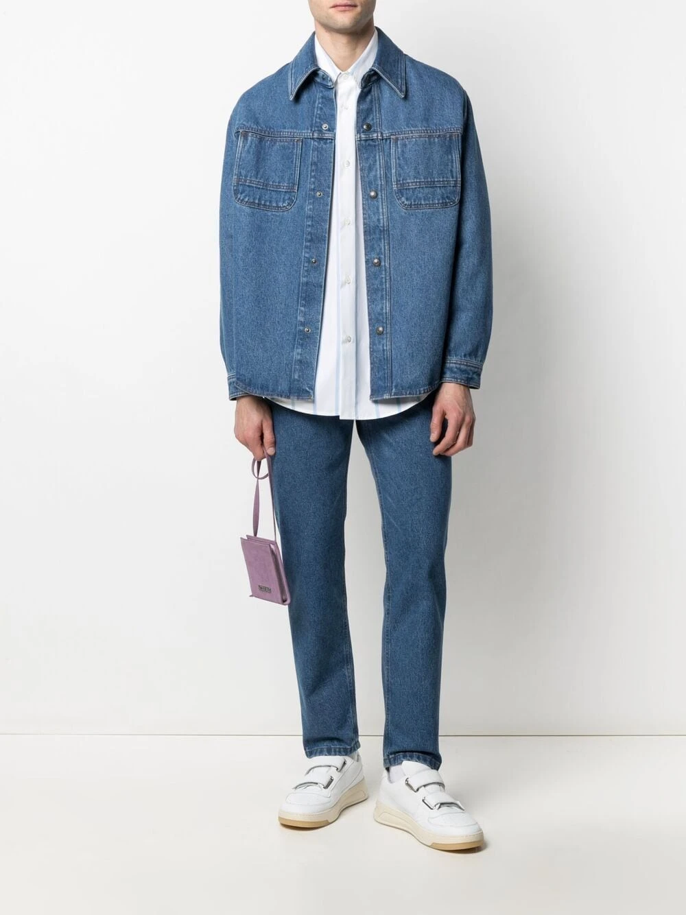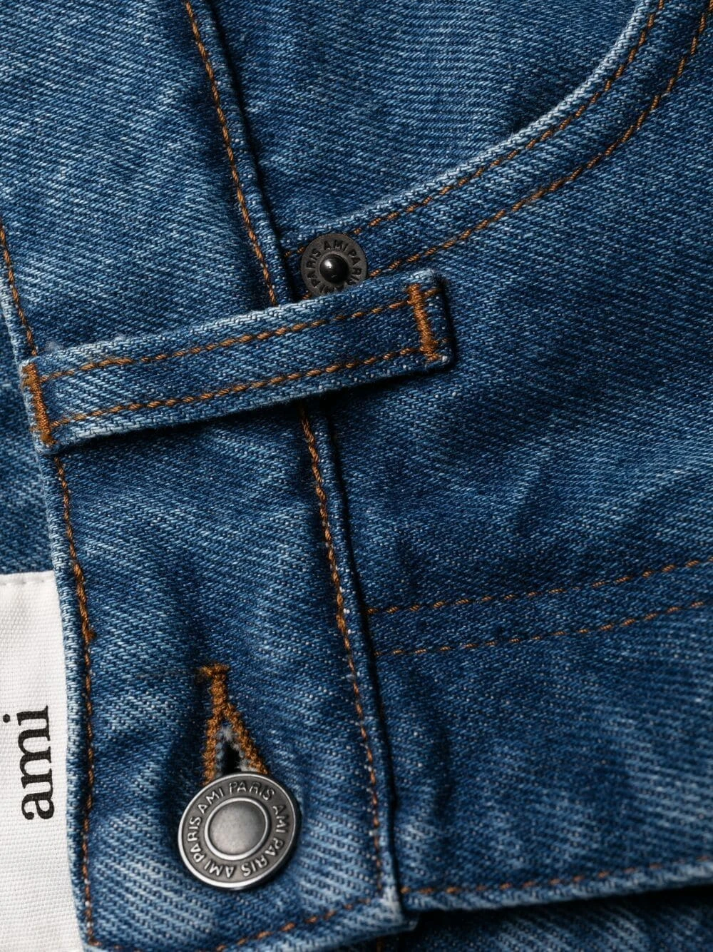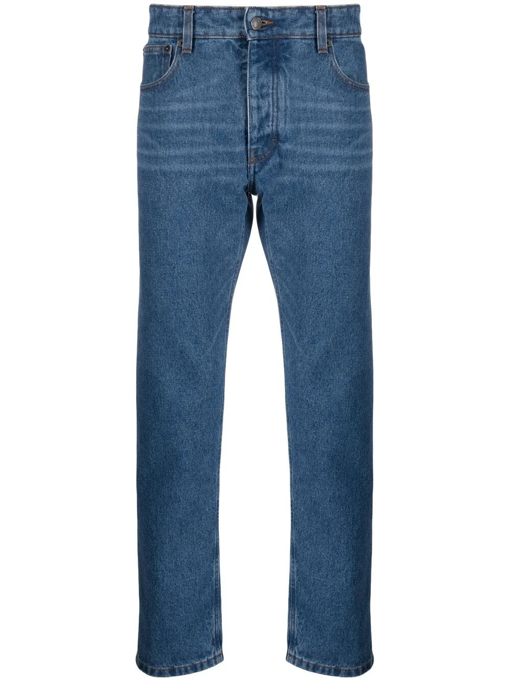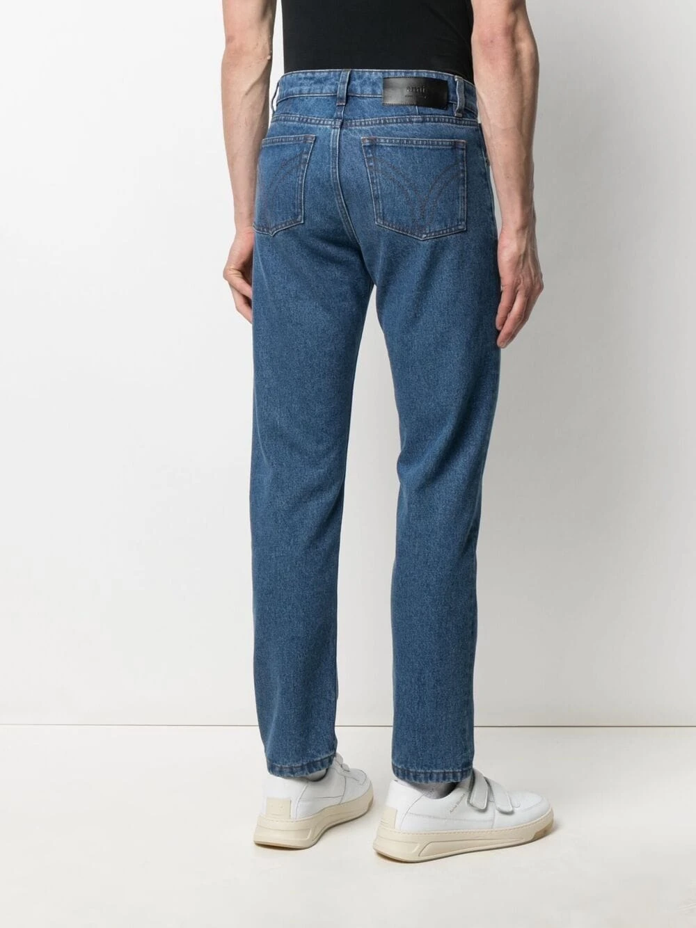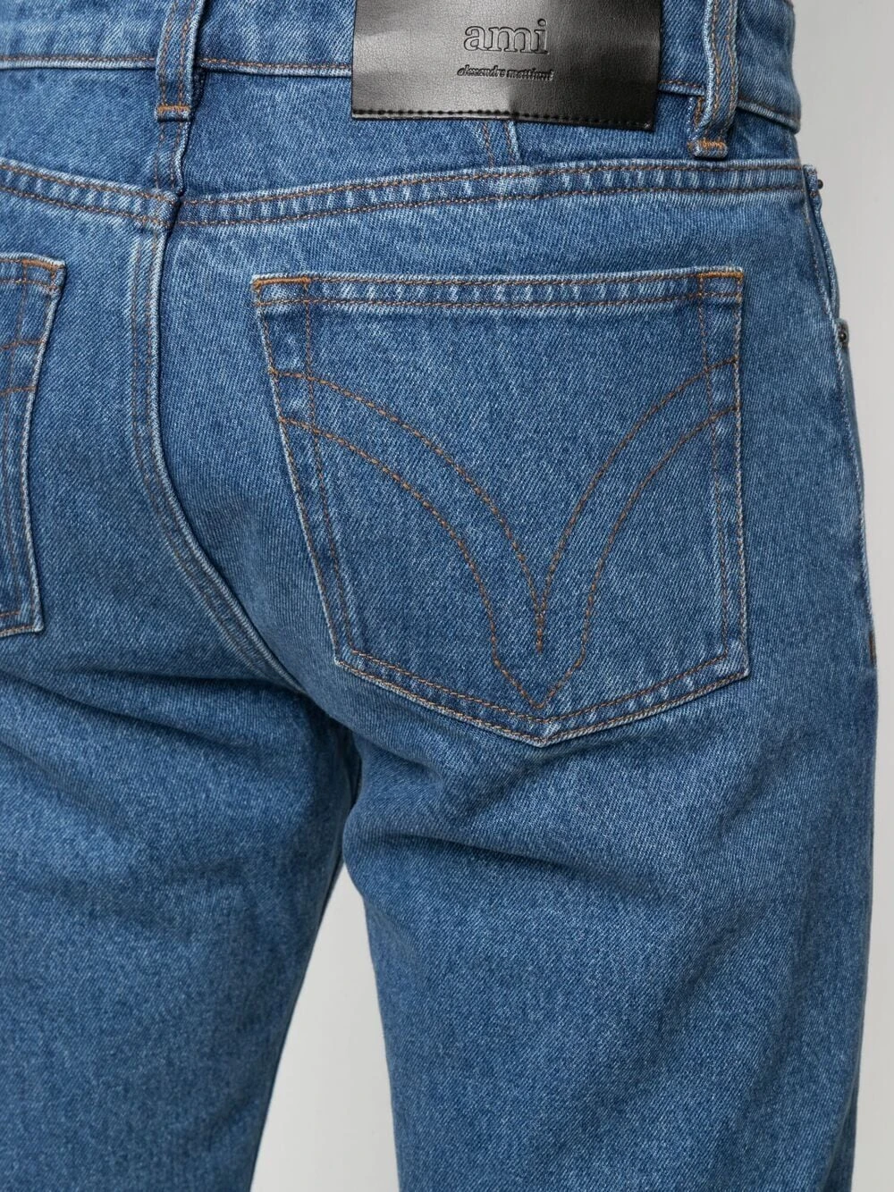 Taille mi-haute, passants de ceinture, fermeture boutonnée, cinq poches classiques, patch logo sur l’arrière. Couleur : bleu. Matière : coton.