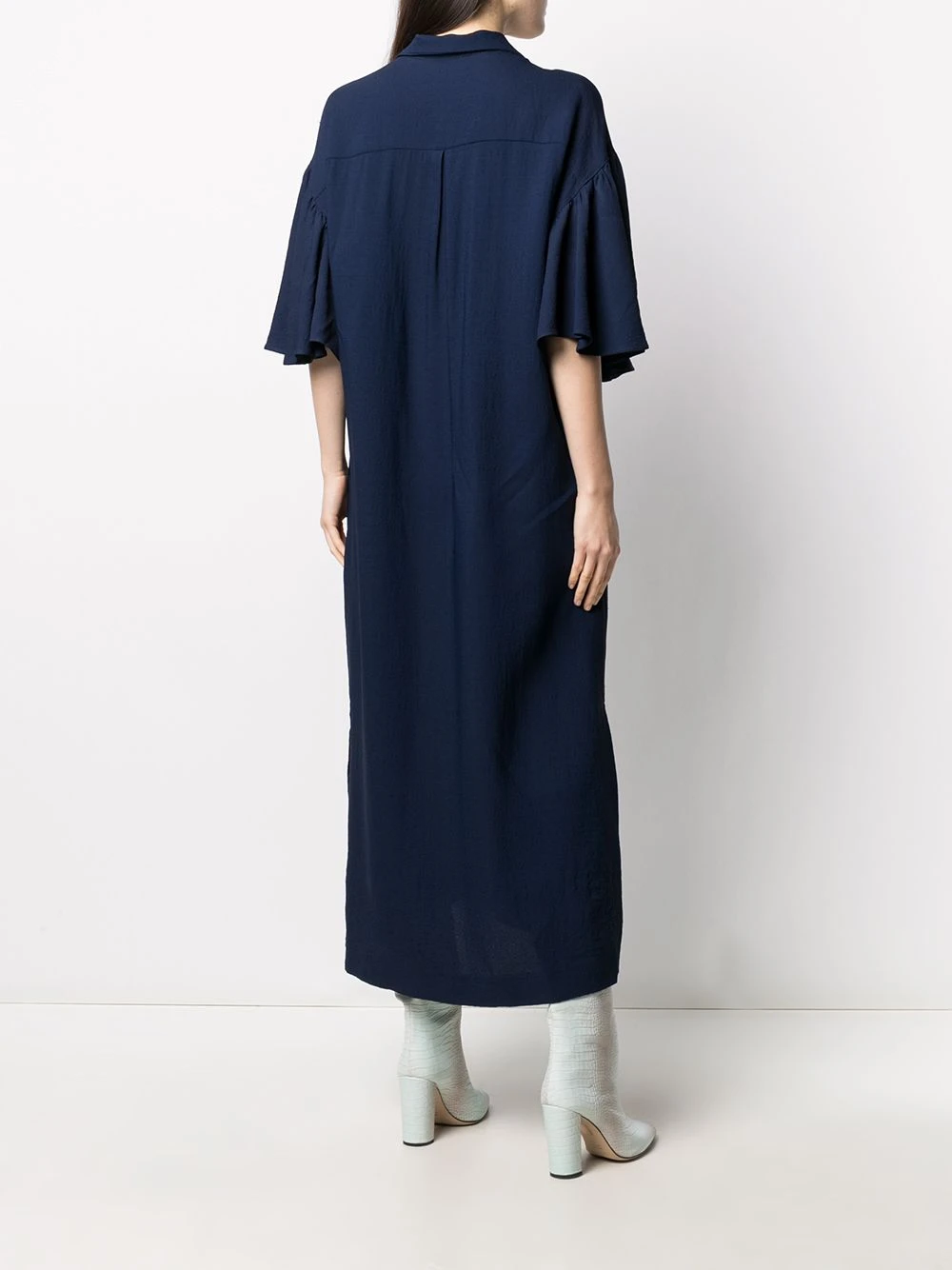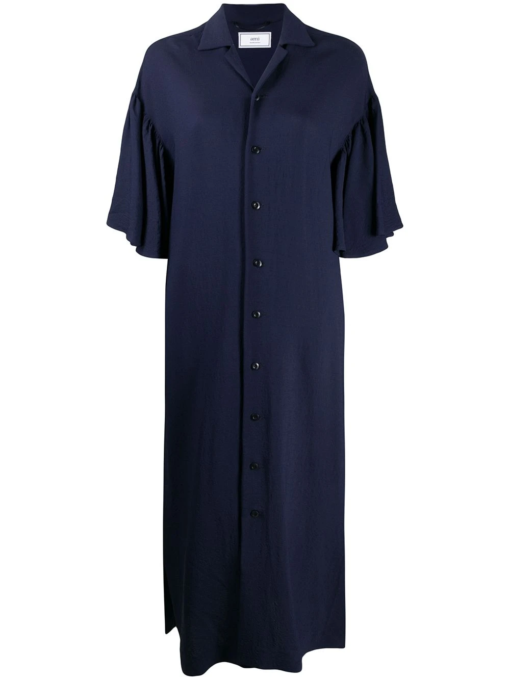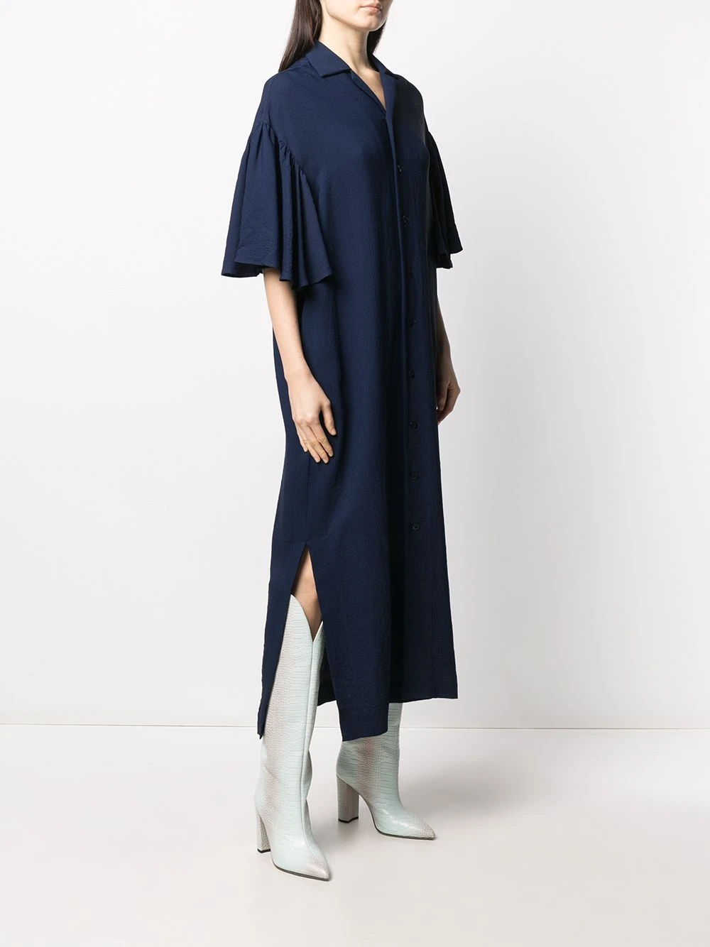 Col v, détails de volants, manches courtes, boutonnière sur le devant, coupe évasée, coupe mi-longue. Matière : tissu.
