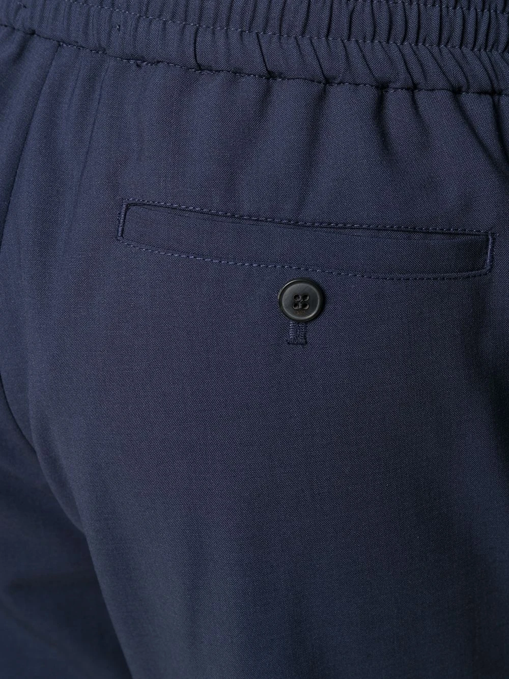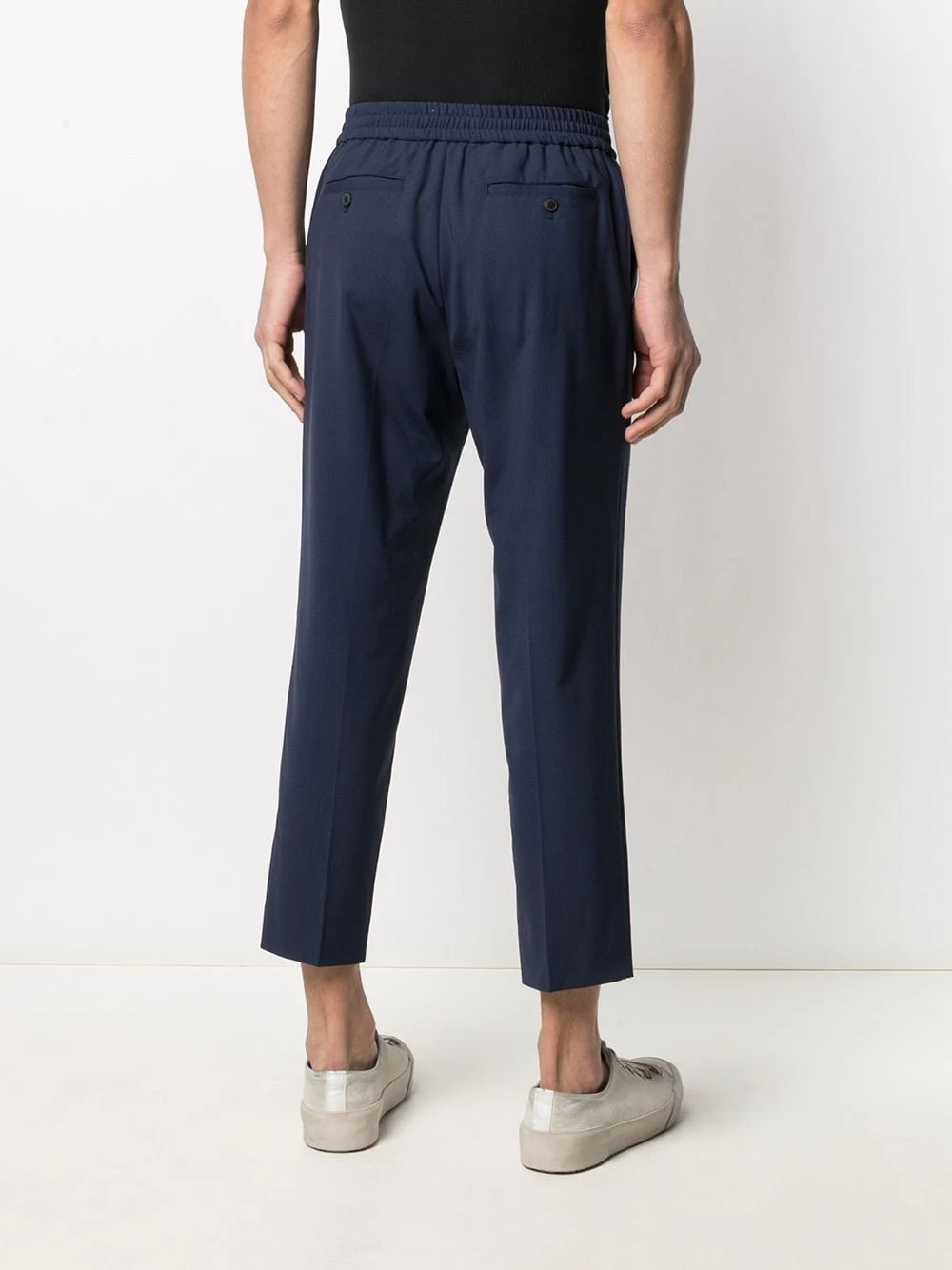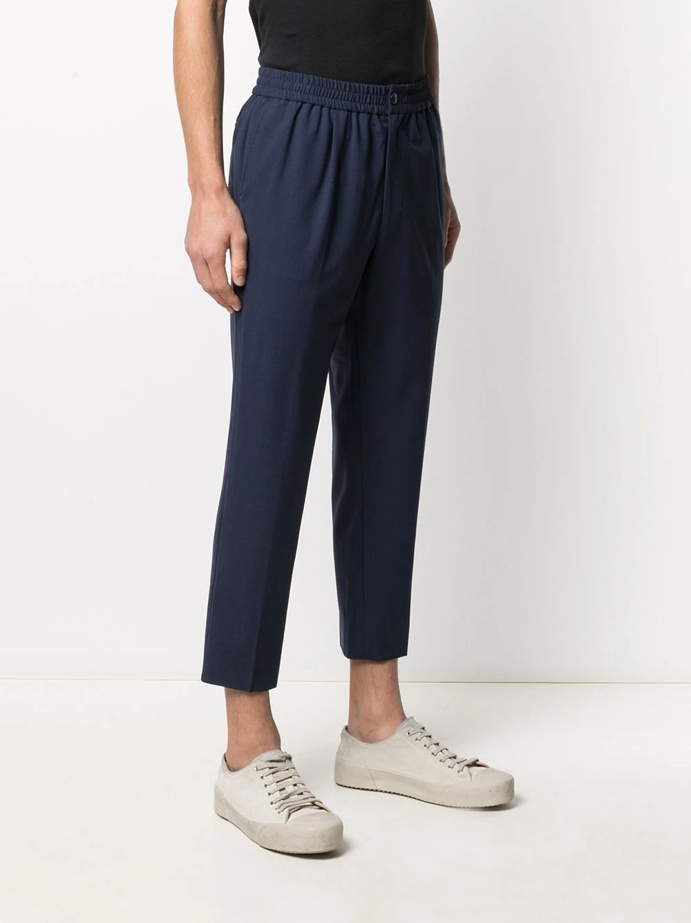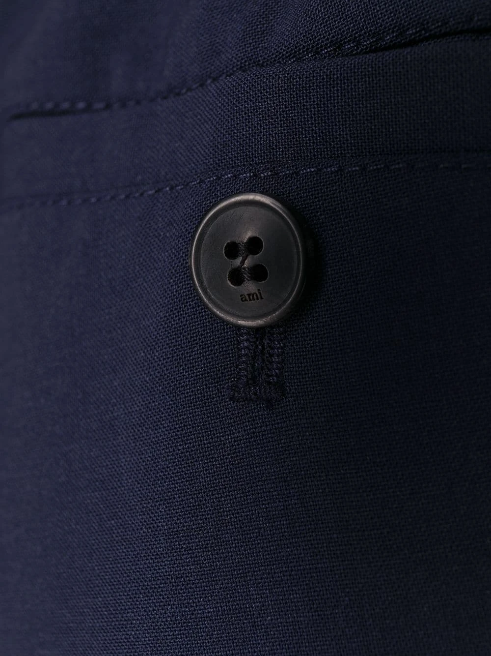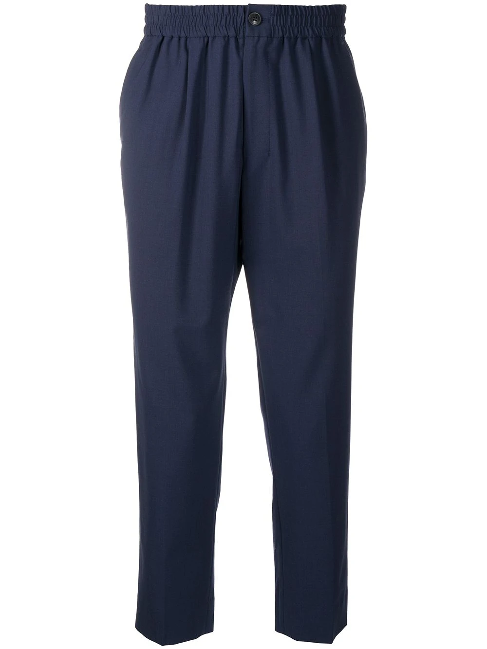 Pantalon court à taille élastique en laine AMI Paris avec ceinture élastique, boutonnière sur le devant, poches latérales fendues, deux poches passepoilées boutonnées au dos et coupe crop.