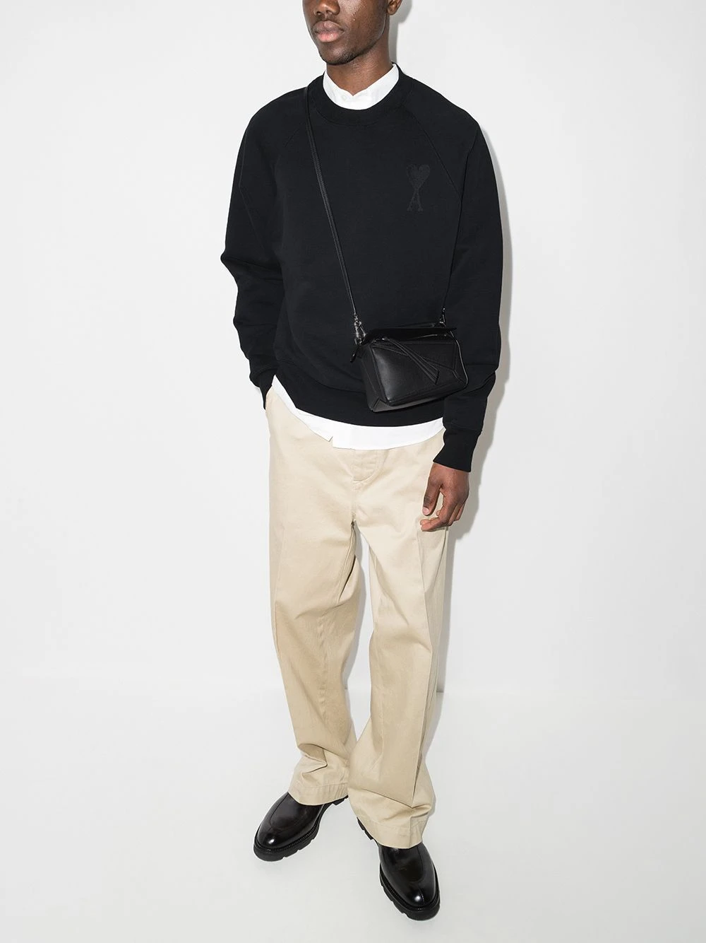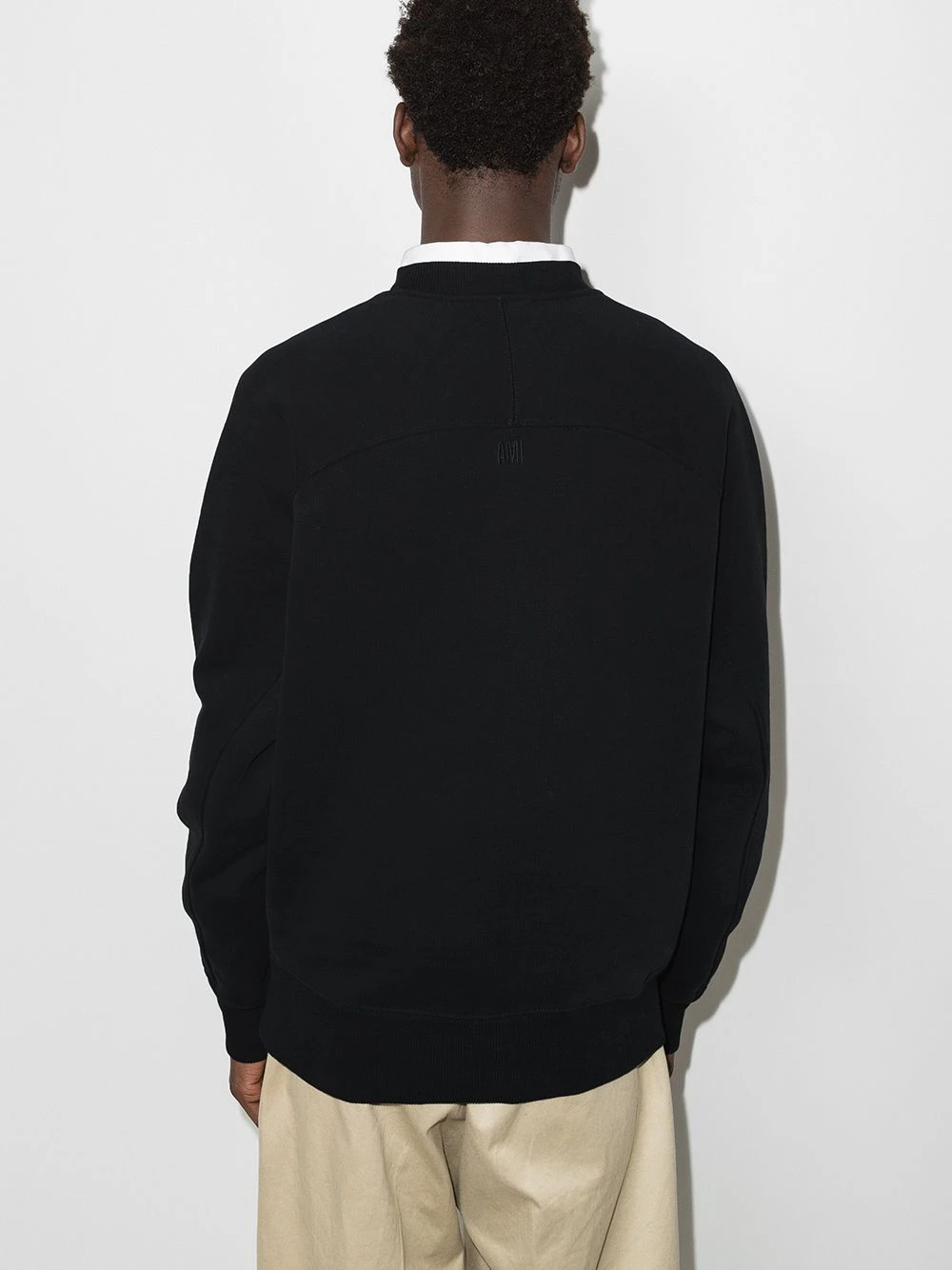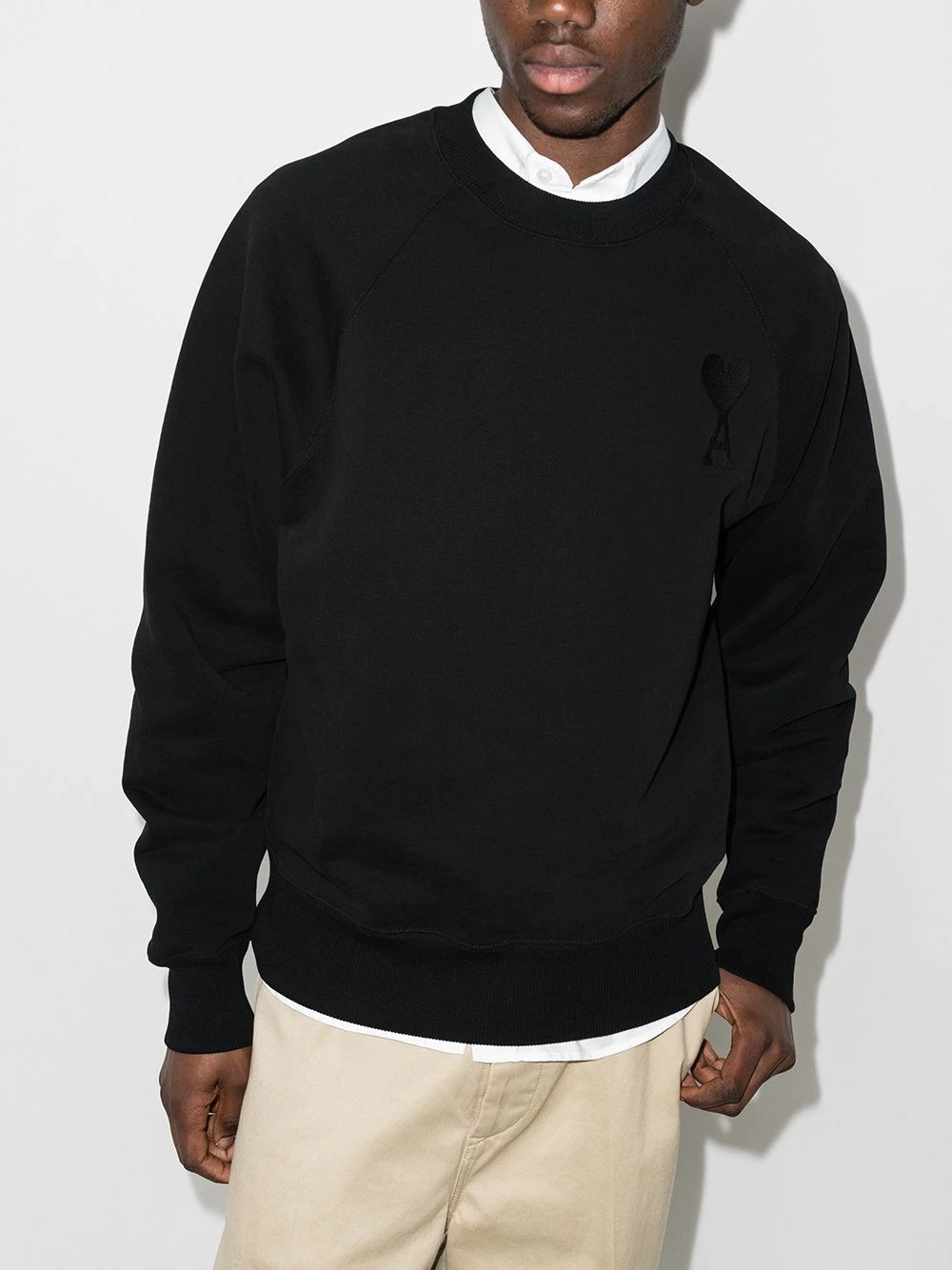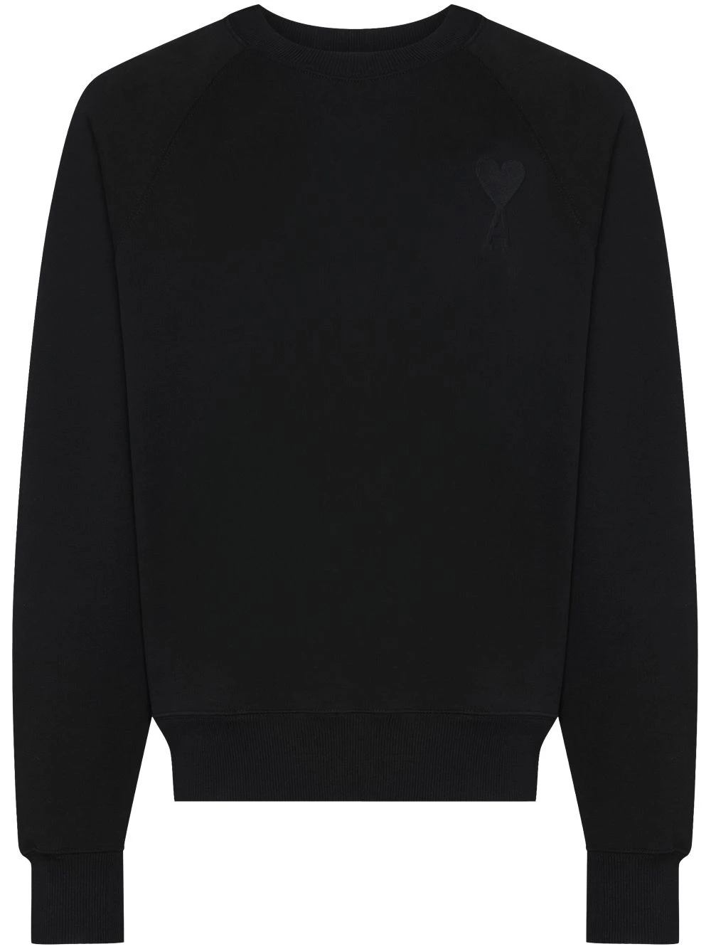 Black organic cotton Ami de Coeur sweatshirt from AMI Paris featuring signature Ami de Coeur monogram motif, crew neck and long raglan sleeves.