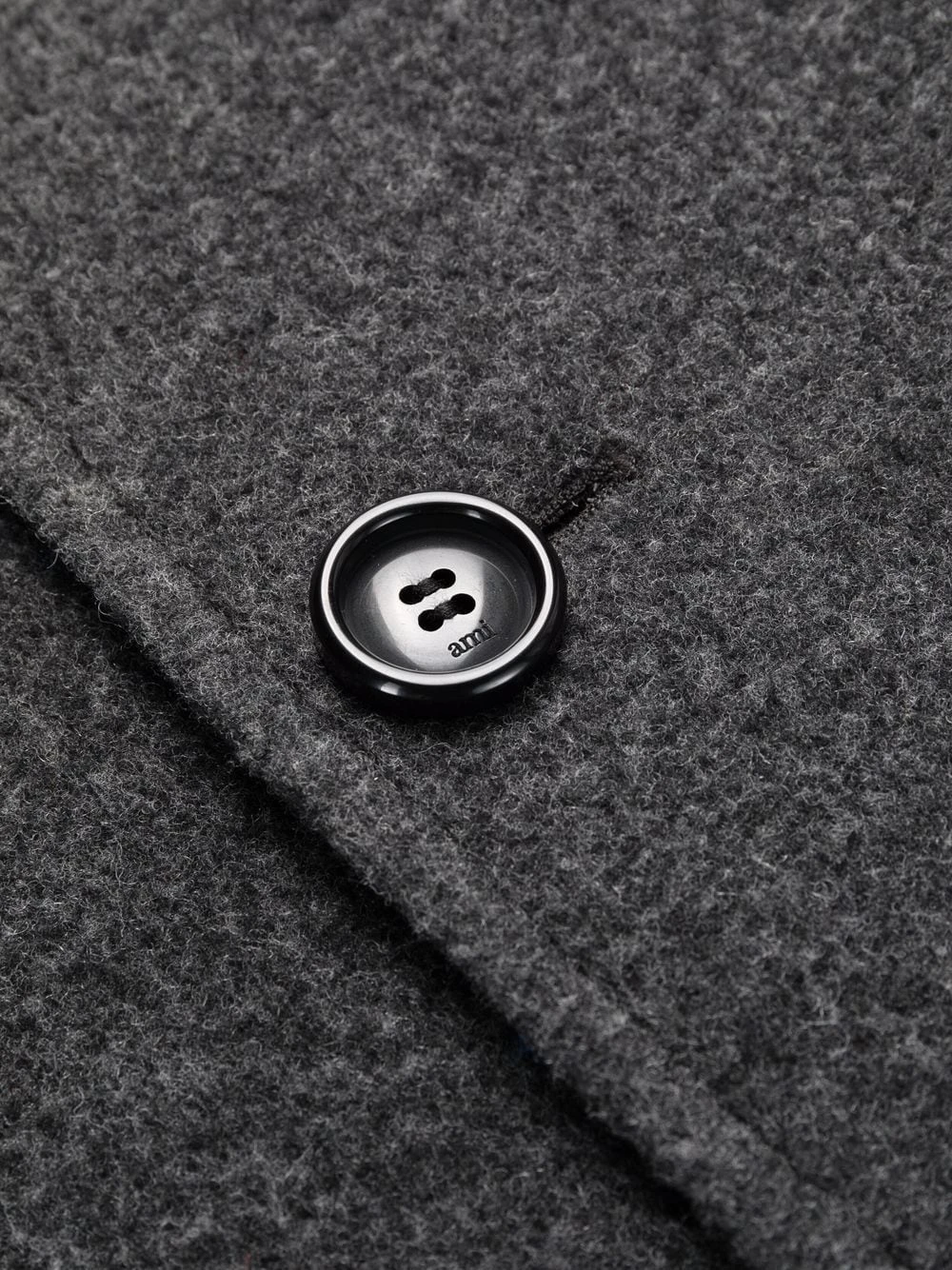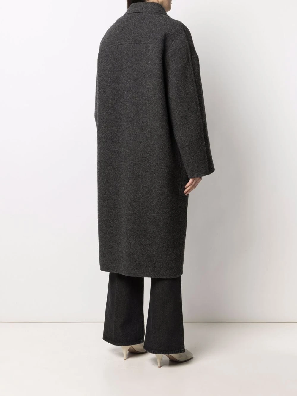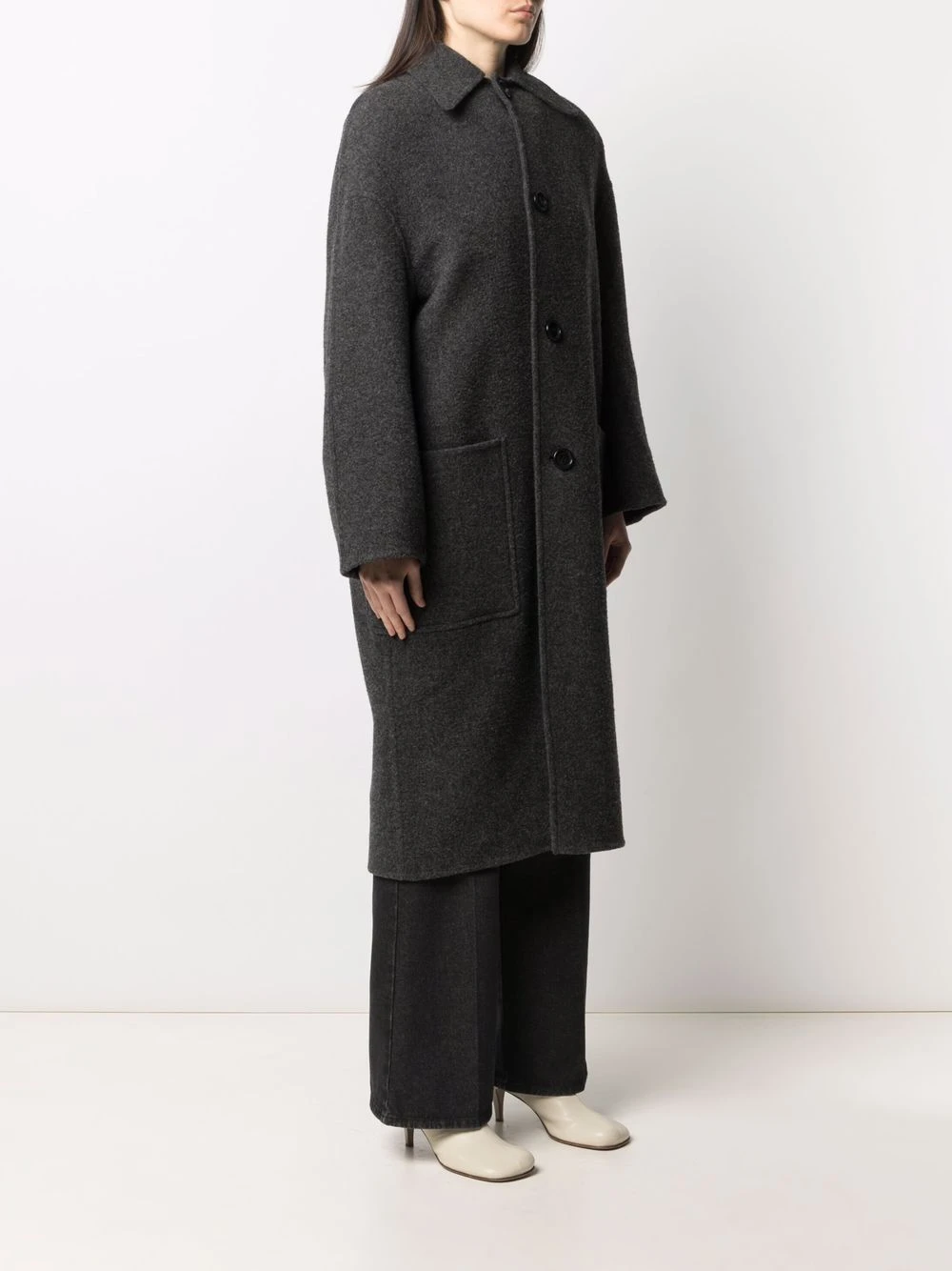 Col classique, effet d’épaules descendues, boutonnière sur le devant, manches longues, deux poches plaquées avant, coupe mi-longue. Couleur : gris. Matière : laine.