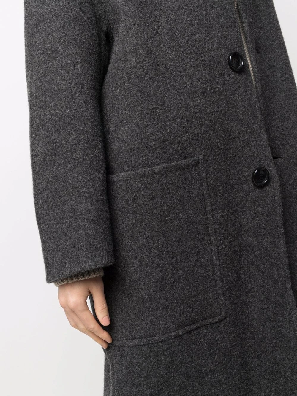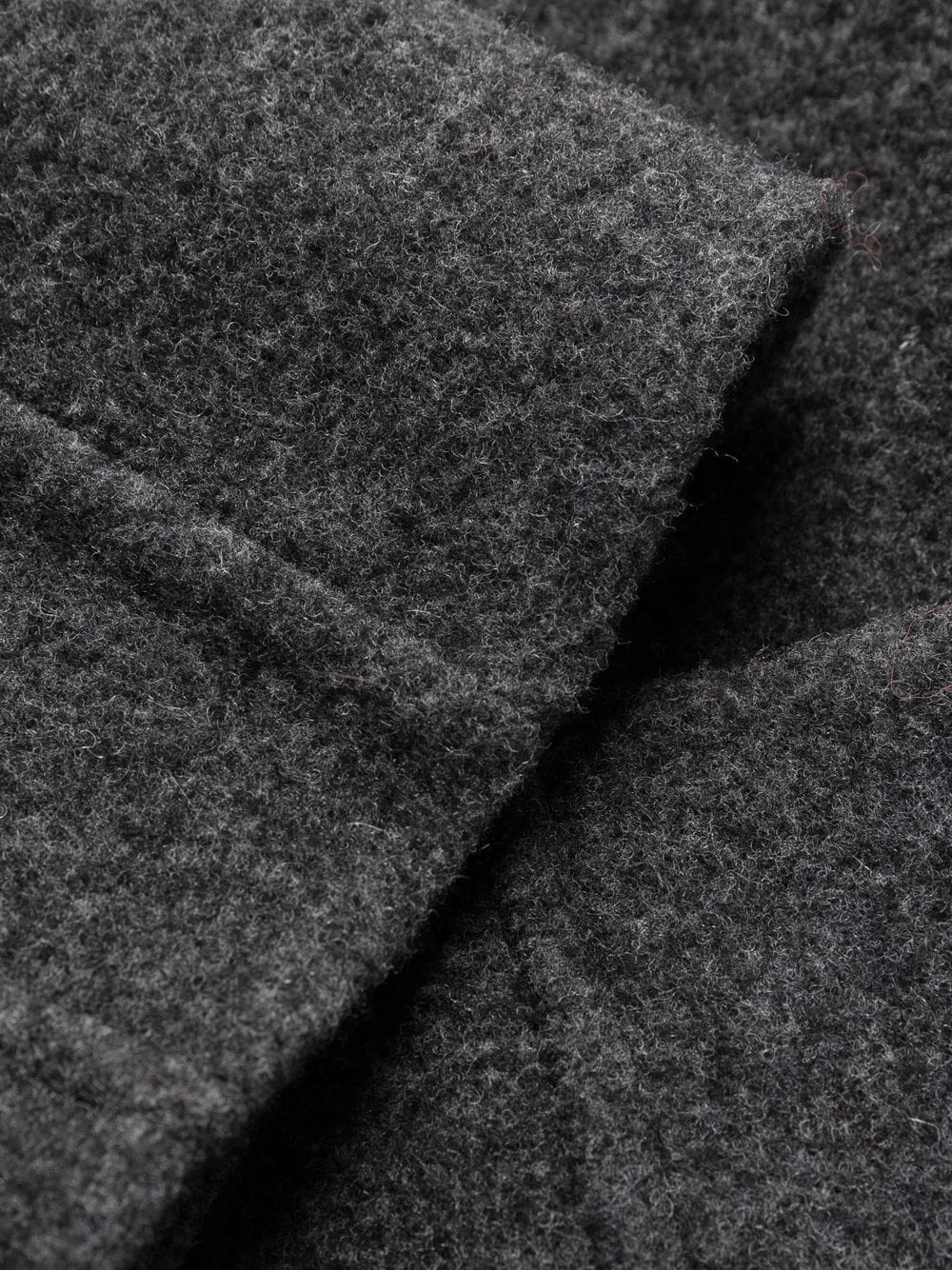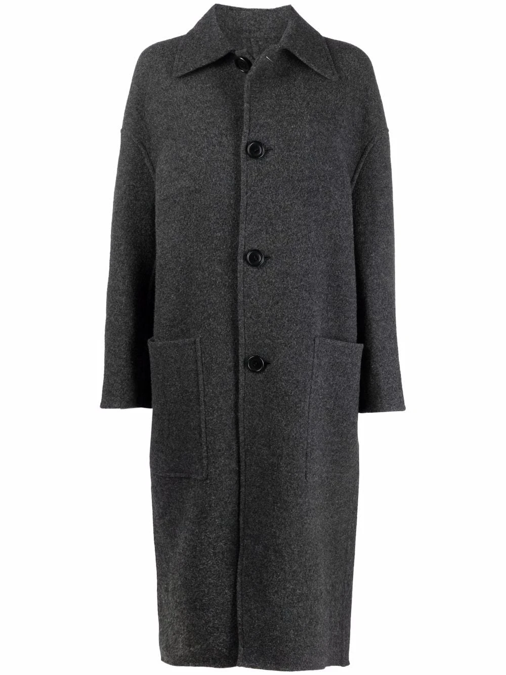 Col classique, effet d’épaules descendues, boutonnière sur le devant, manches longues, deux poches plaquées avant, coupe mi-longue. Couleur : gris. Matière : laine.