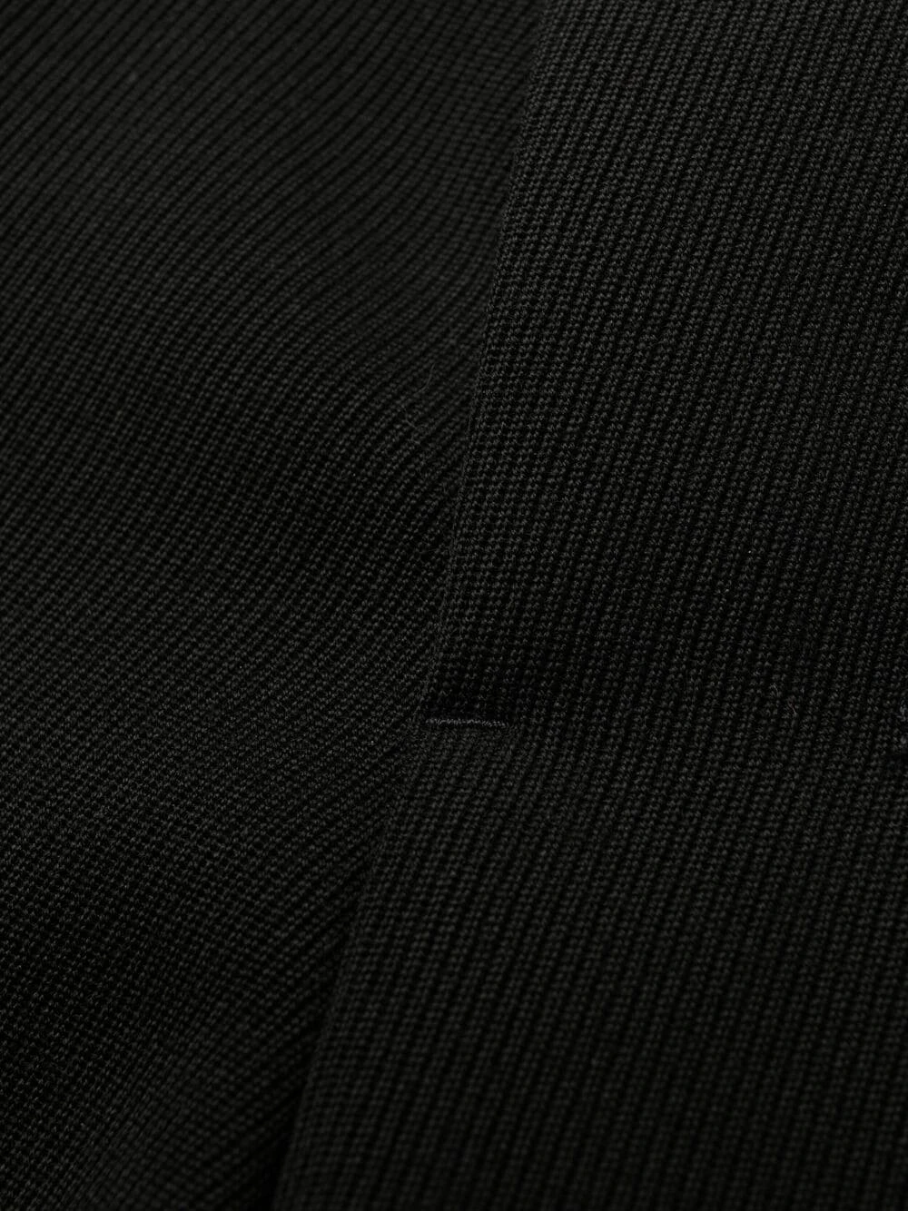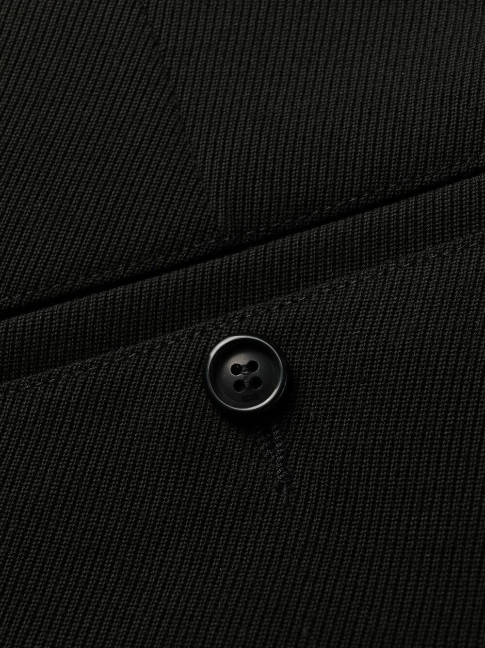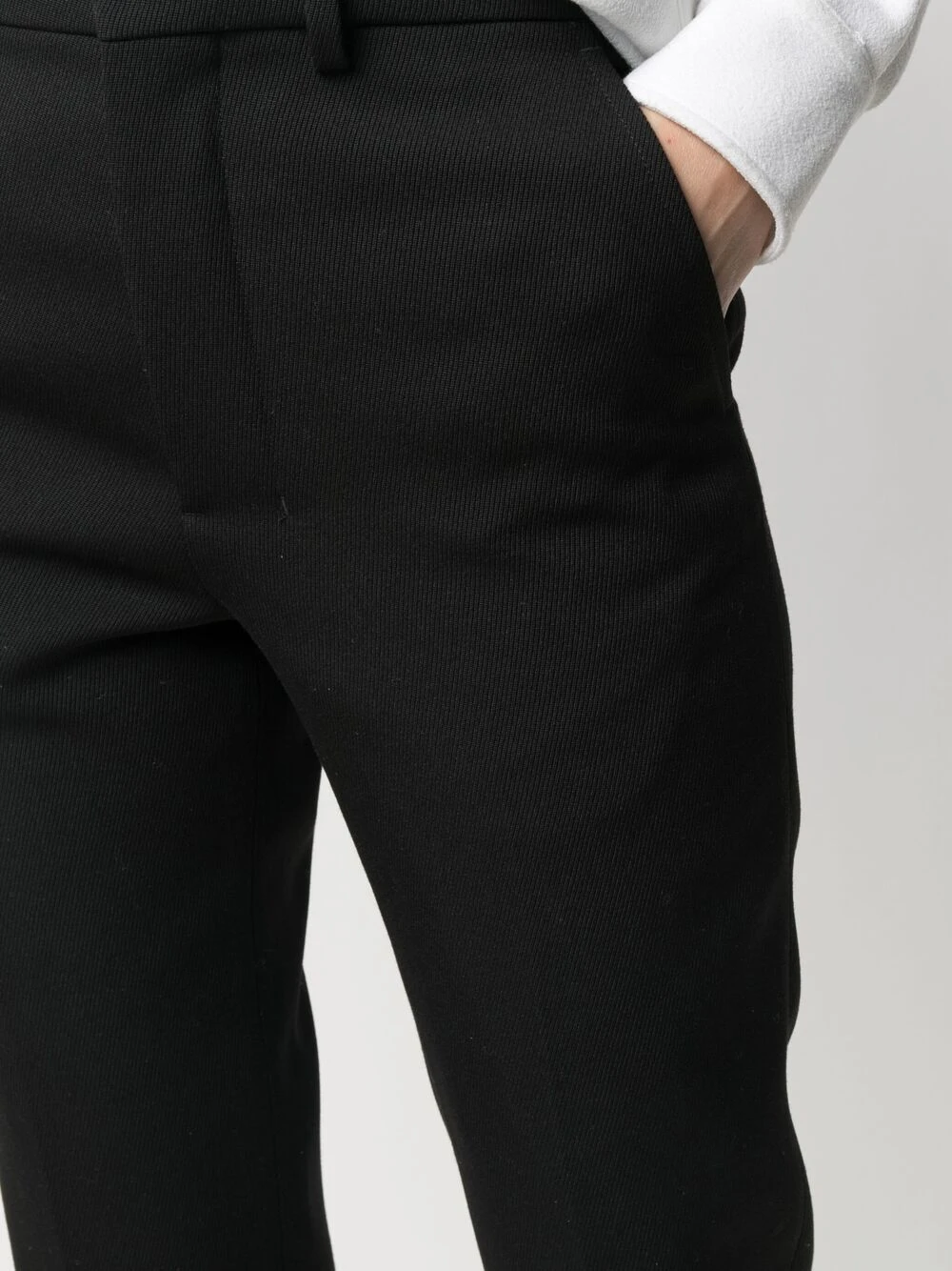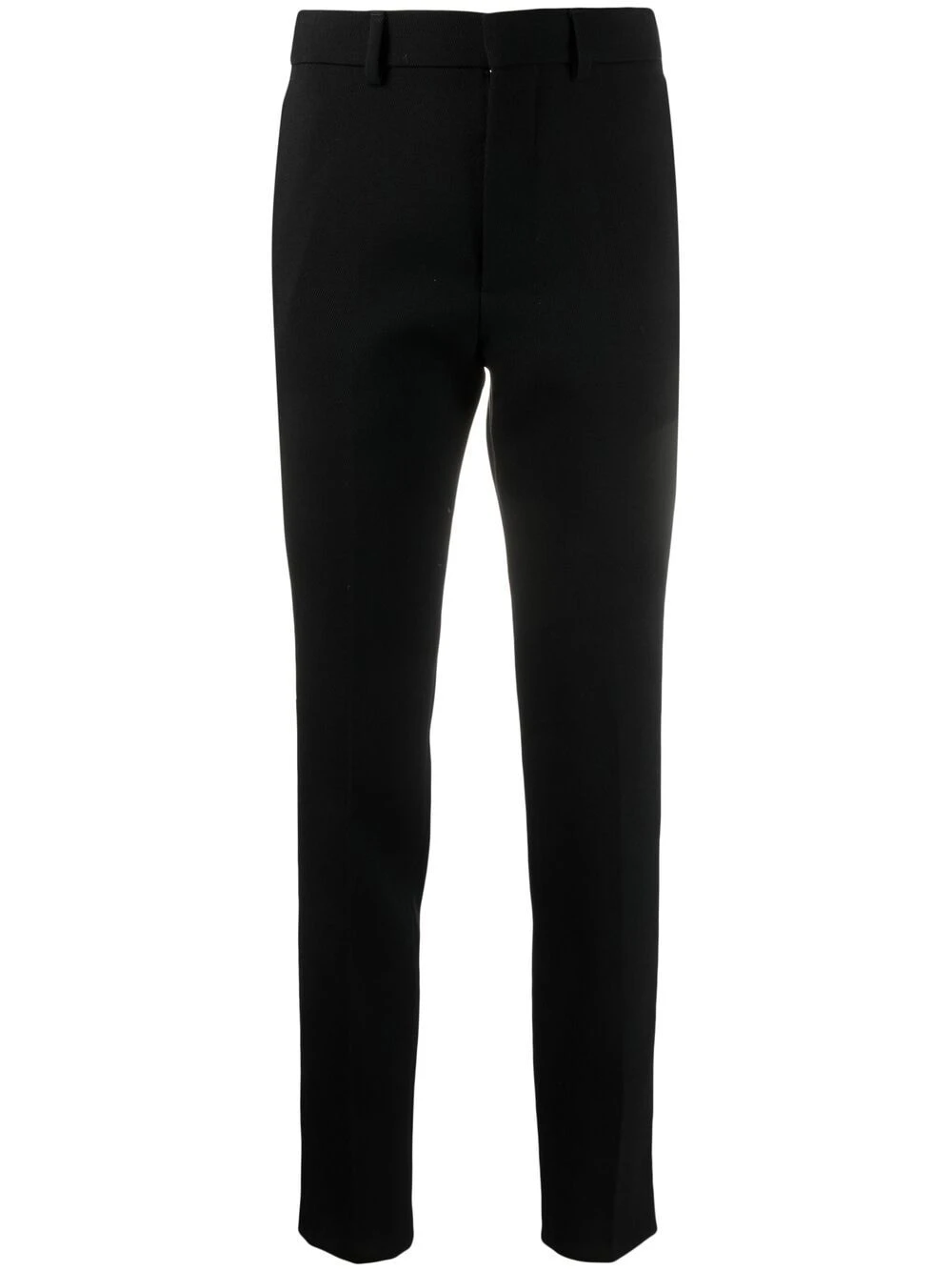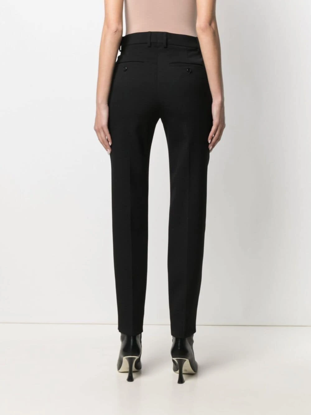 Passants de ceinture, fermeture à zip et agrafes, poches latérales fendues, deux poches arrières boutonnées, coupe fuselé, taille haute. Couleur : noir. Matière : laine vierge.
