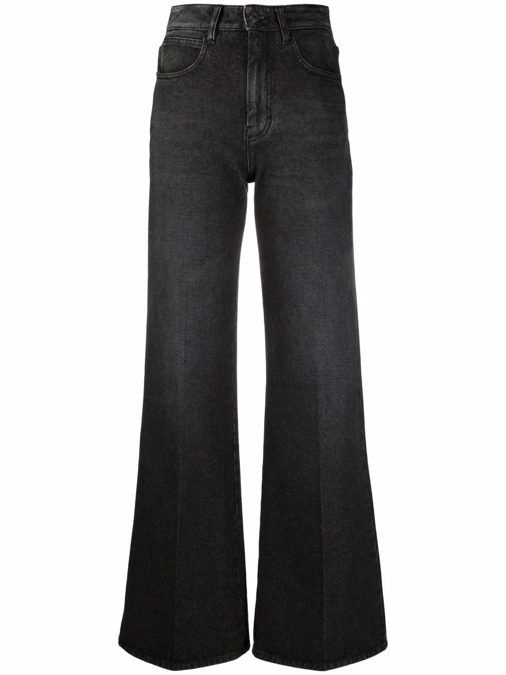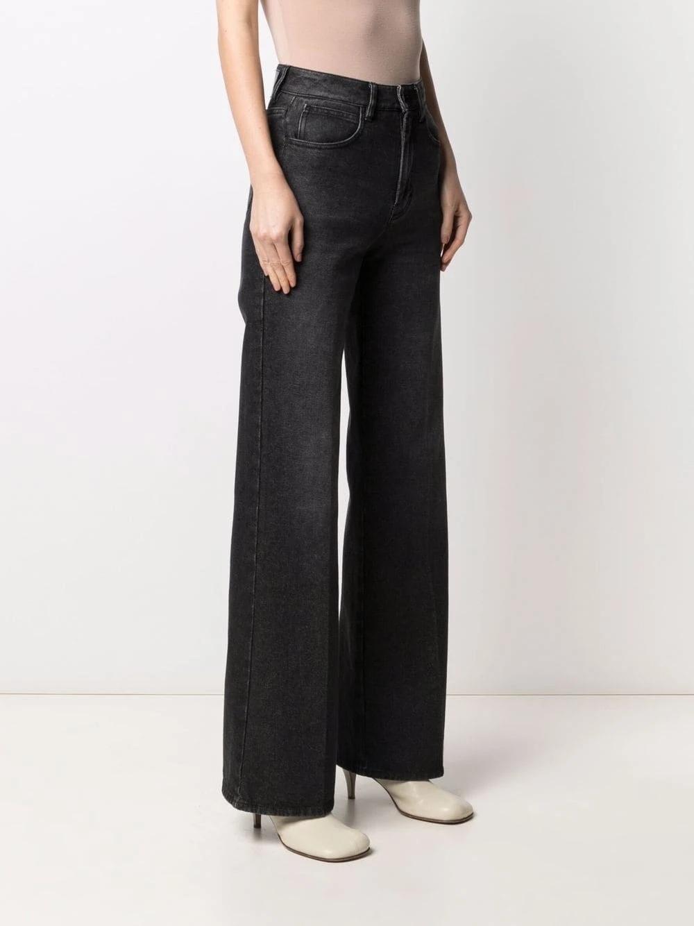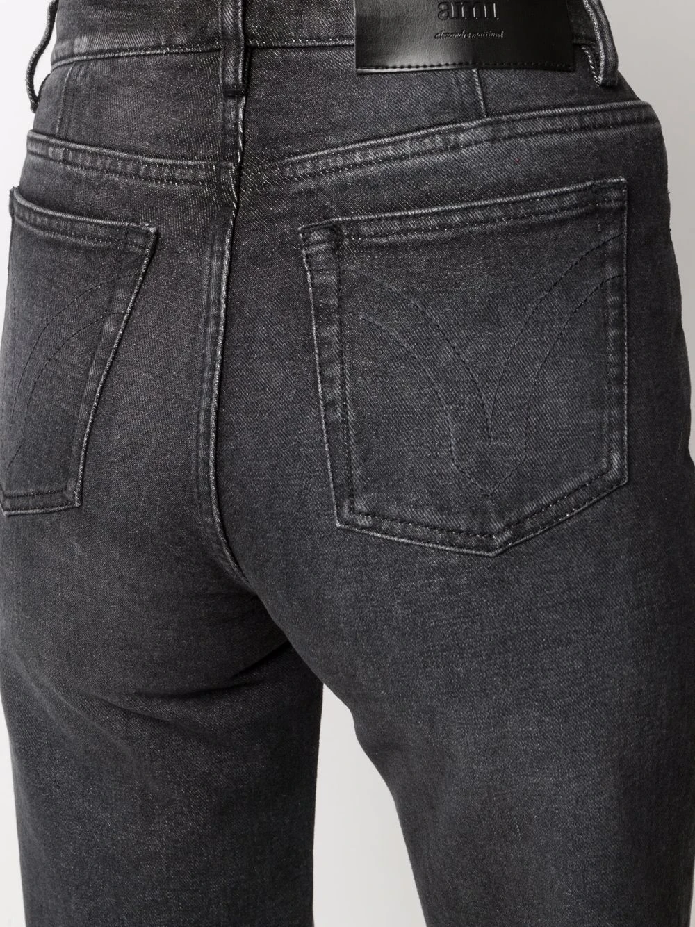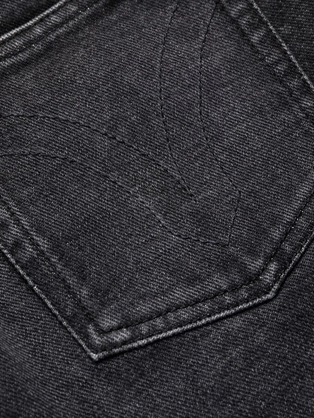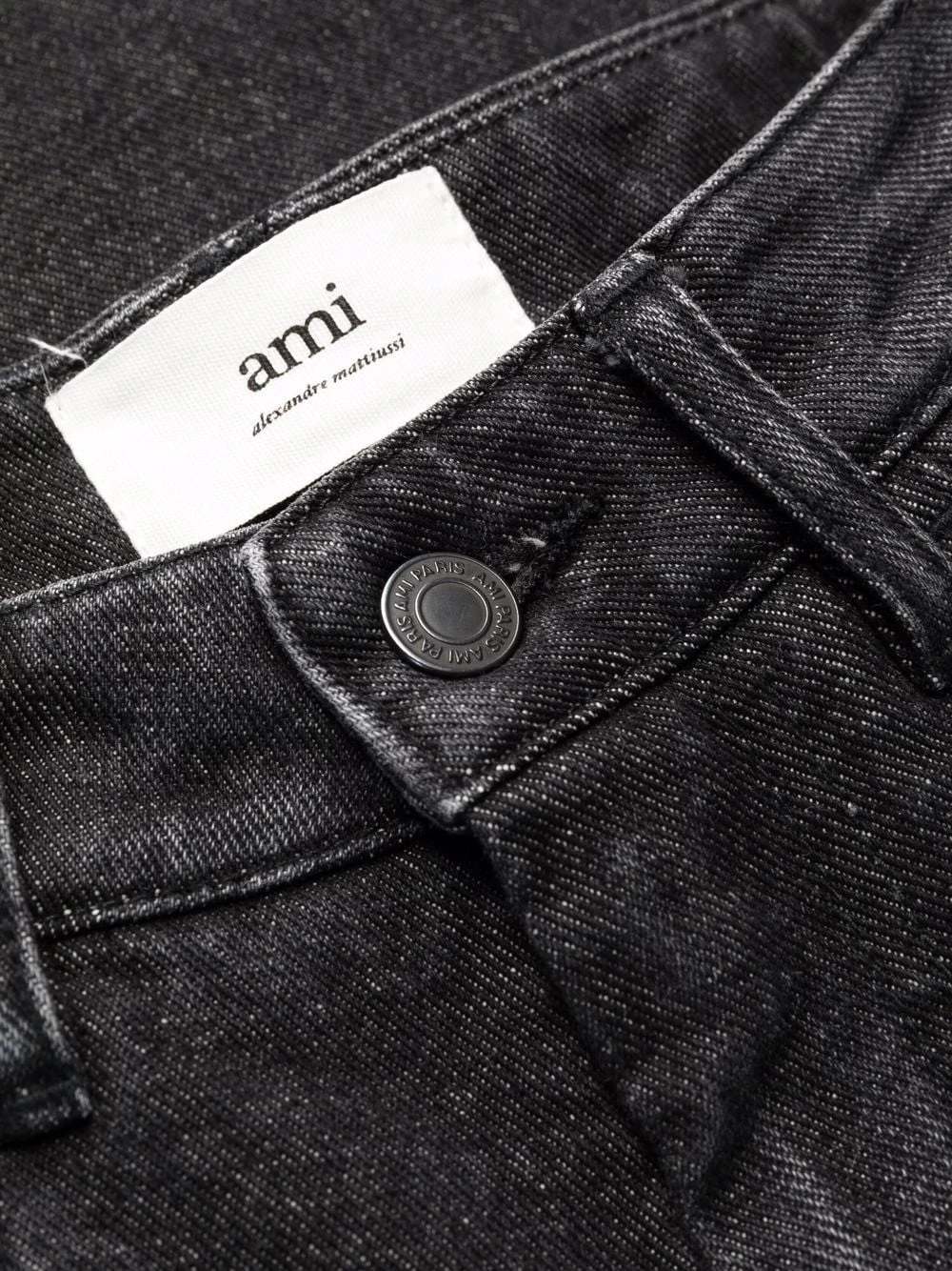 Taille haute, cinq poches classiques, fermeture à zip et boutons sur le devant, patch logo sur l’arrière, ourlet évasé. Couleur : noir. Matière : coton.