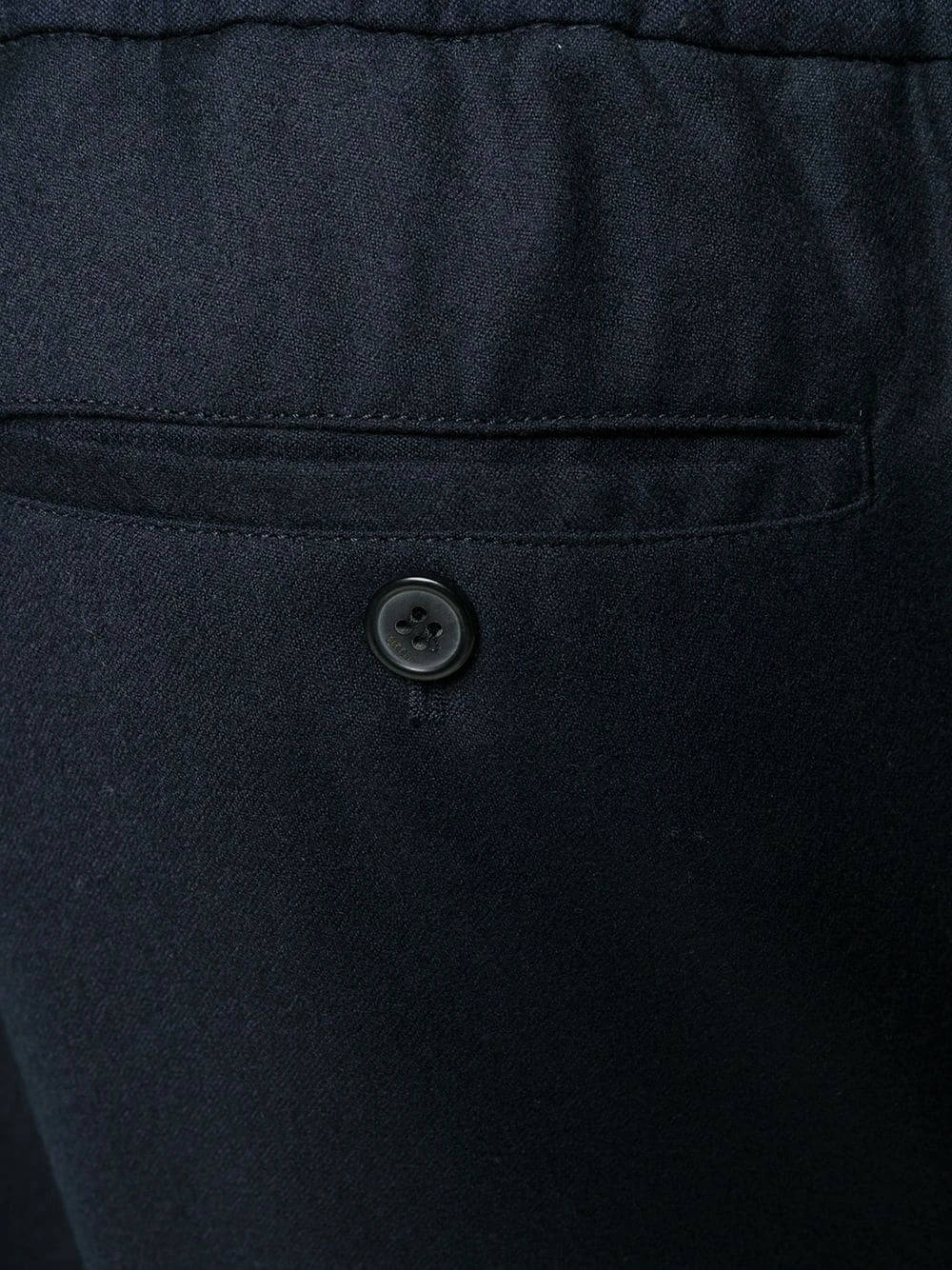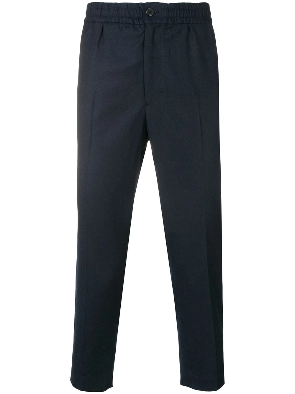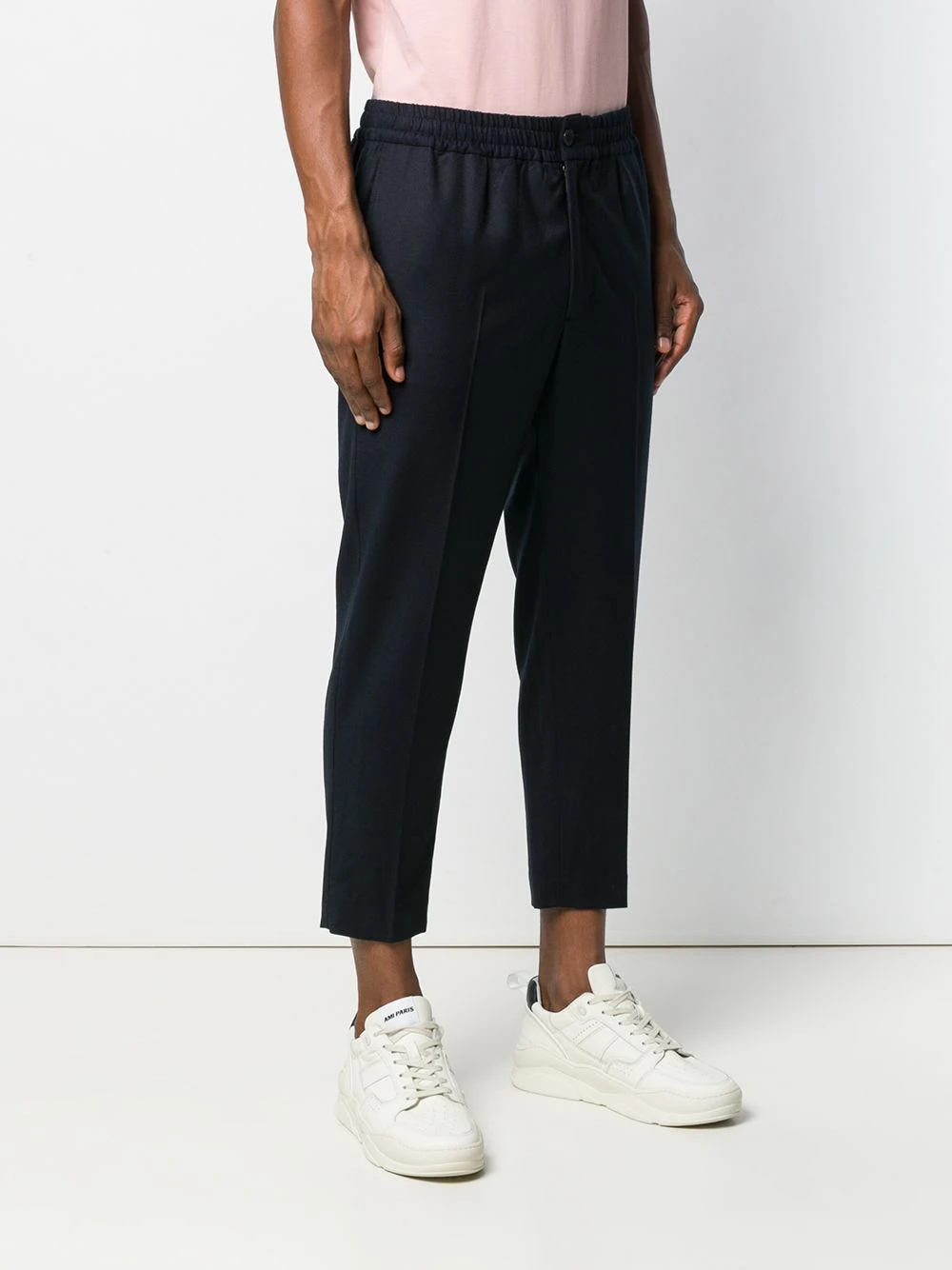 Pantalon cropped en laine vierge AMI Alexandre Mattiussi avec ceinture élastique, bouton et zip, poches latérales et deux poches arrière passepoilées et boutonnées.
