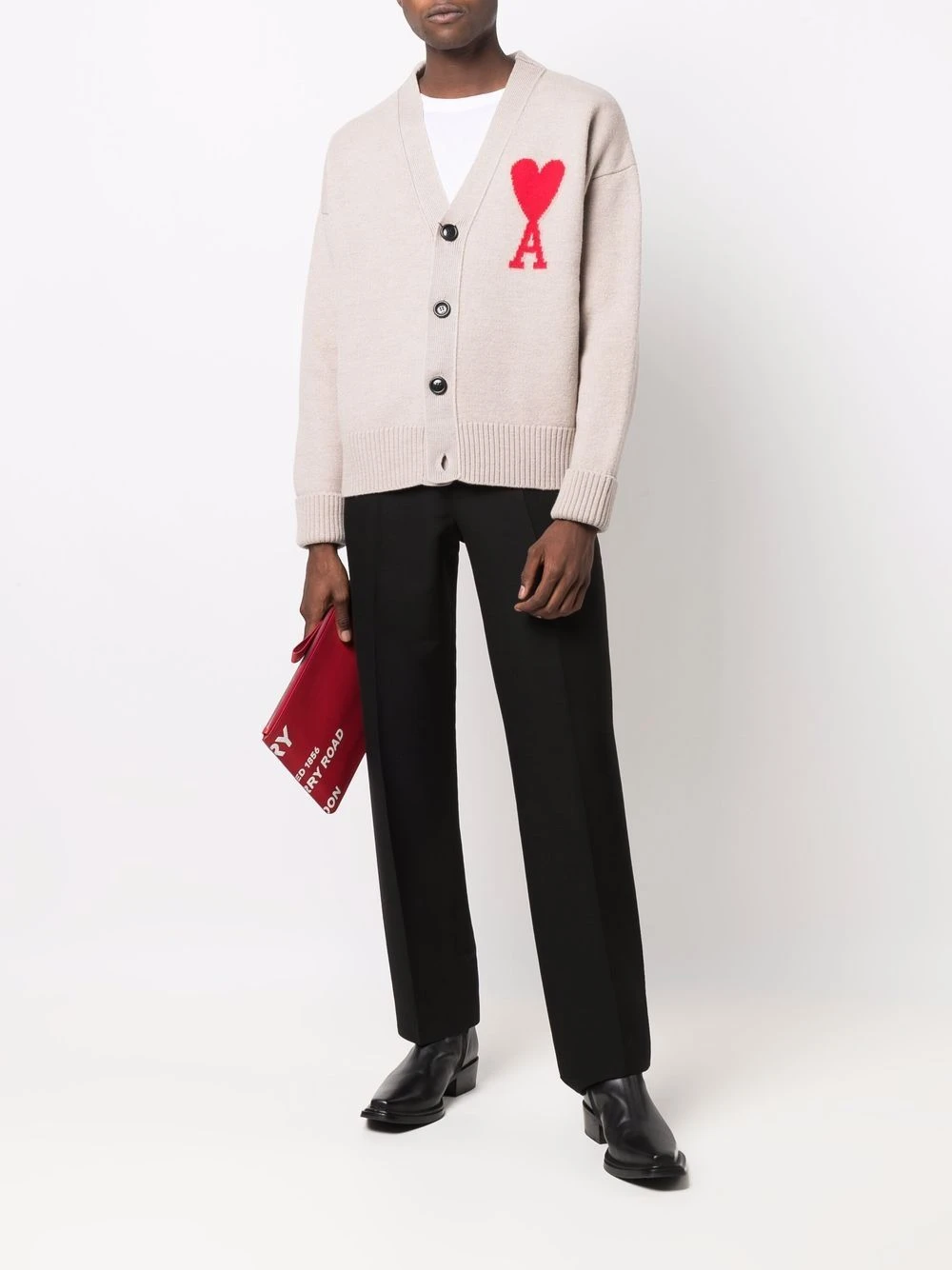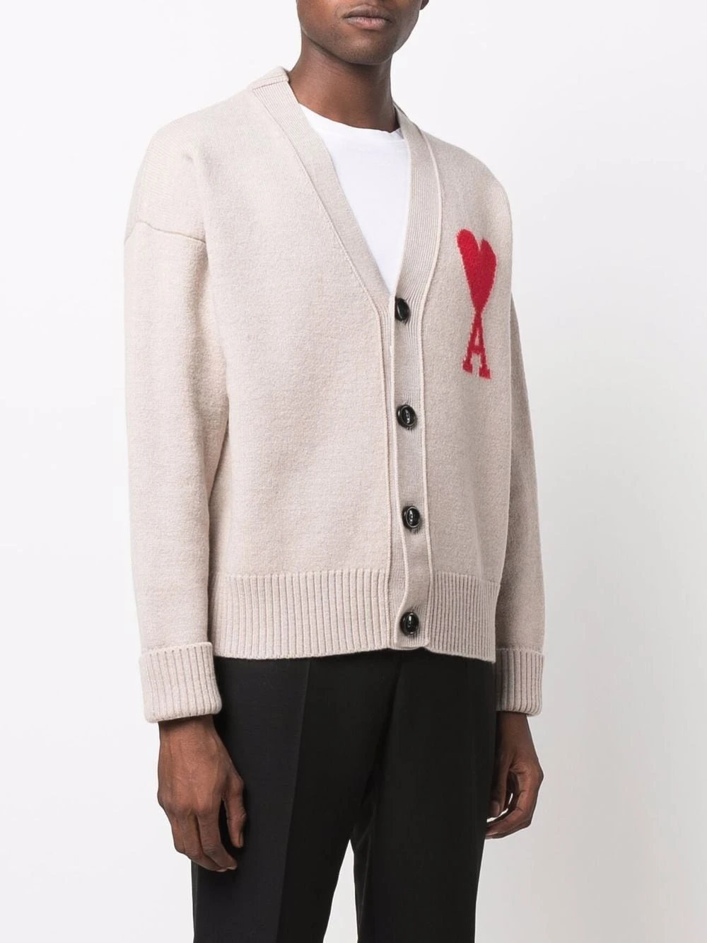 Design en maille, logo Ami de Coeur signature, détail nervuré, col v, boutonnière sur le devant. Matière : laine vierge.