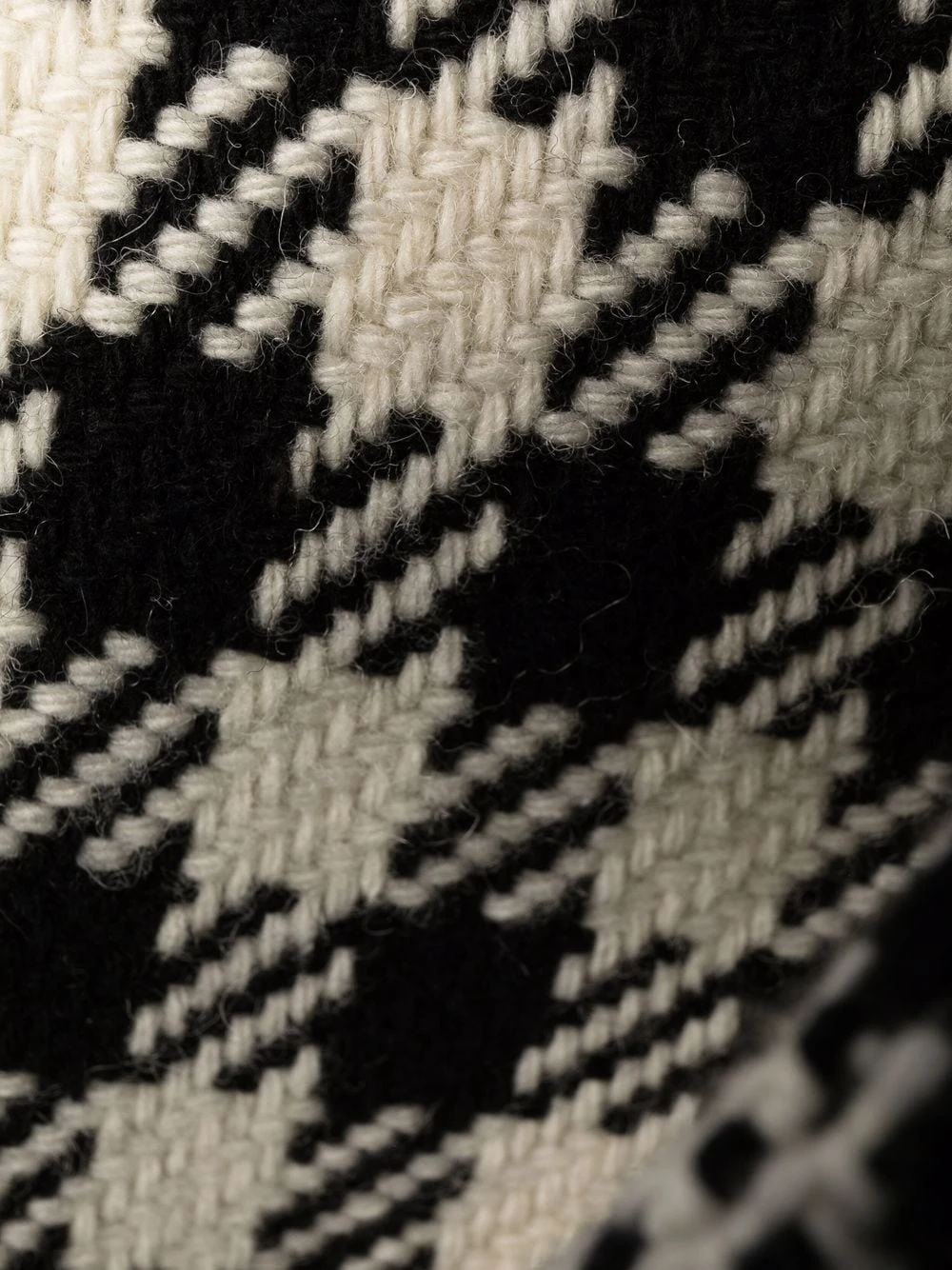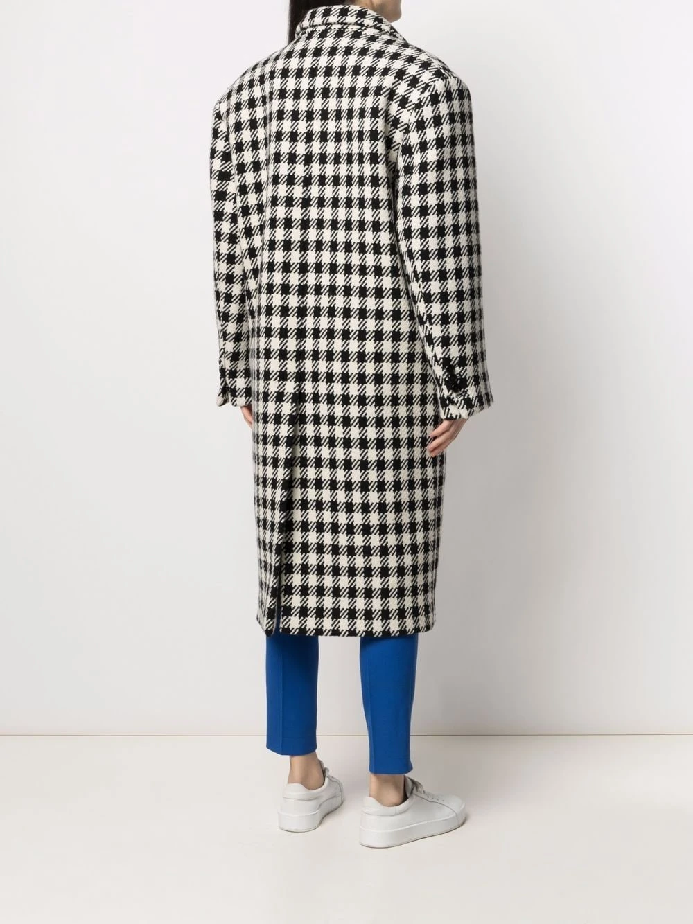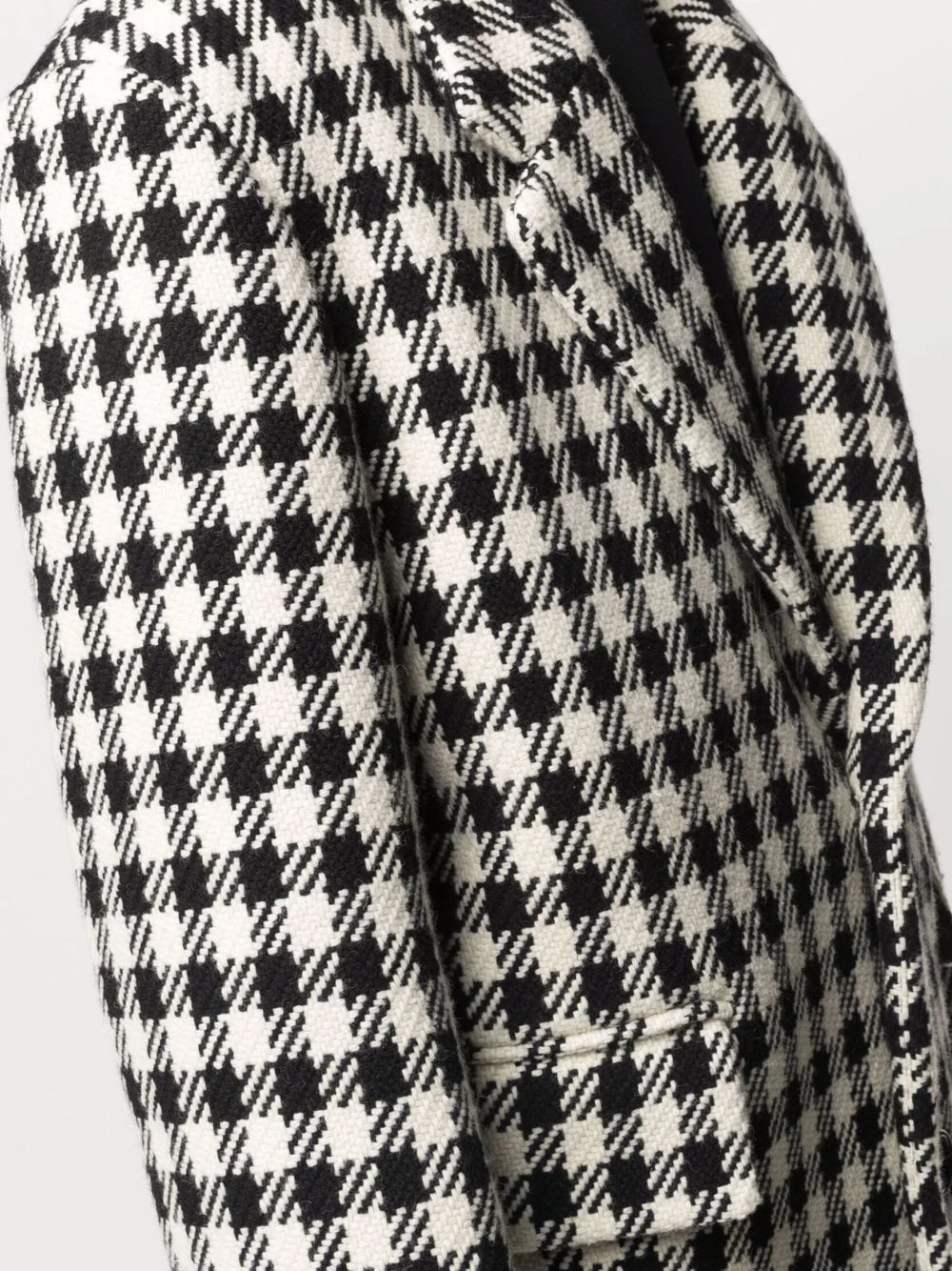 Imprimé pied-de-poule, revers crantés, manches longues, boutonnière sur le devant, poches latérales à rabat, coupe mi-longue. Matière : laine.