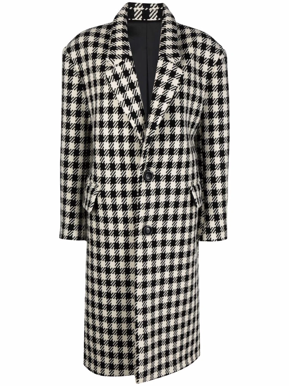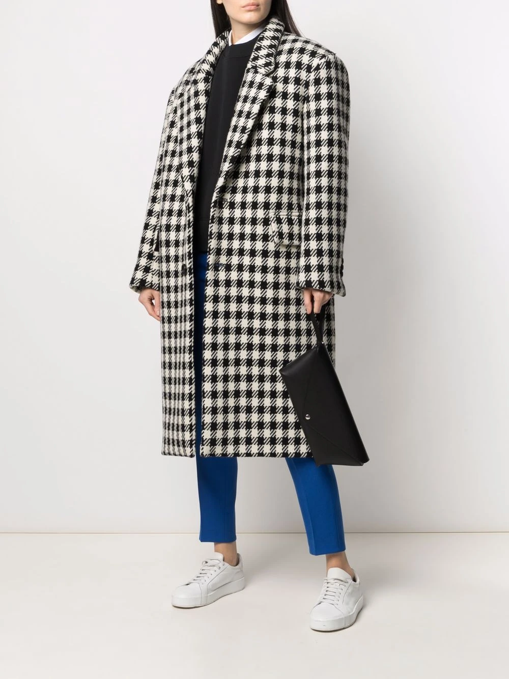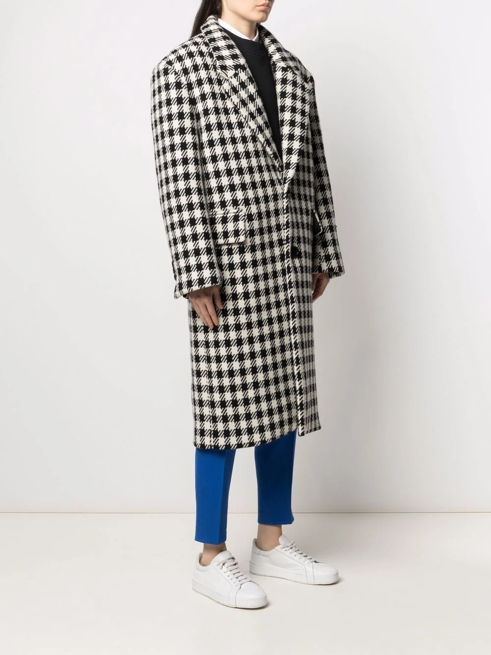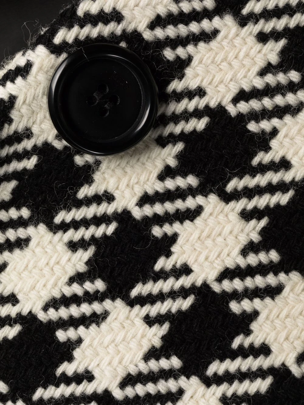 Imprimé pied-de-poule, revers crantés, manches longues, boutonnière sur le devant, poches latérales à rabat, coupe mi-longue. Matière : laine.
